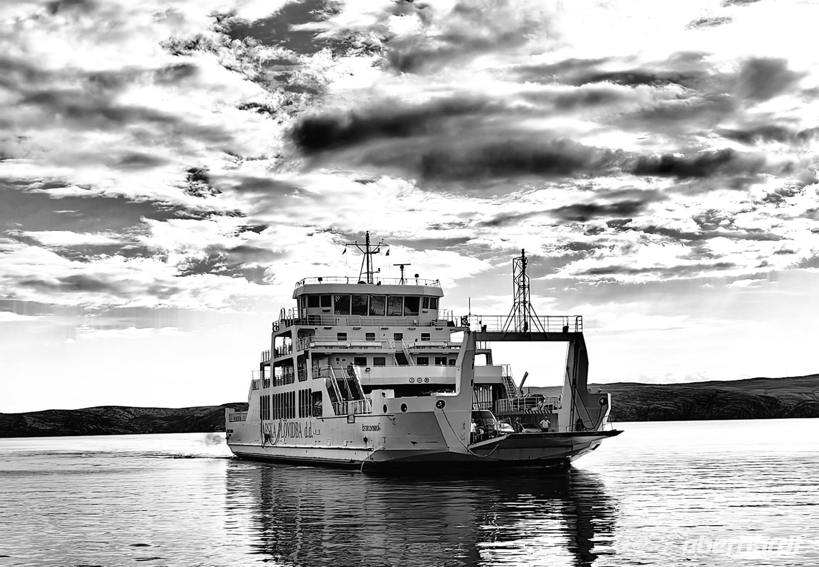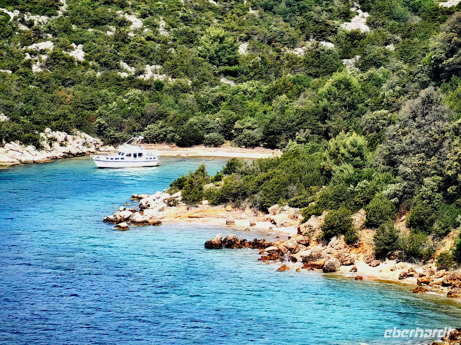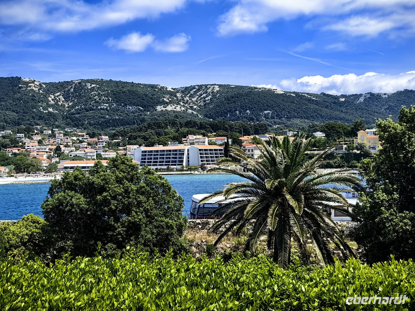 Am Nachmittag fahren wir weiter, denn wir wollten noch die fast drei Fahrstunden entfernte Insel Rab erreichen. Bei strahlendem Sonnenschein genießen wir die kurvige faszinierende Fahrt an der Küstenstraße entlang mit Ausblicken auf die mondlandschaftsähnliche Insel Pag, die man eine ganze Weile wie ein Wüsteneiland vom Festland aus sieht.