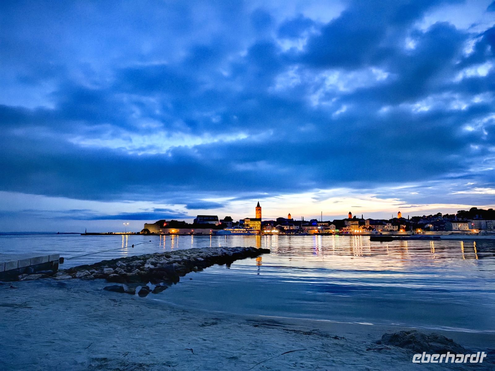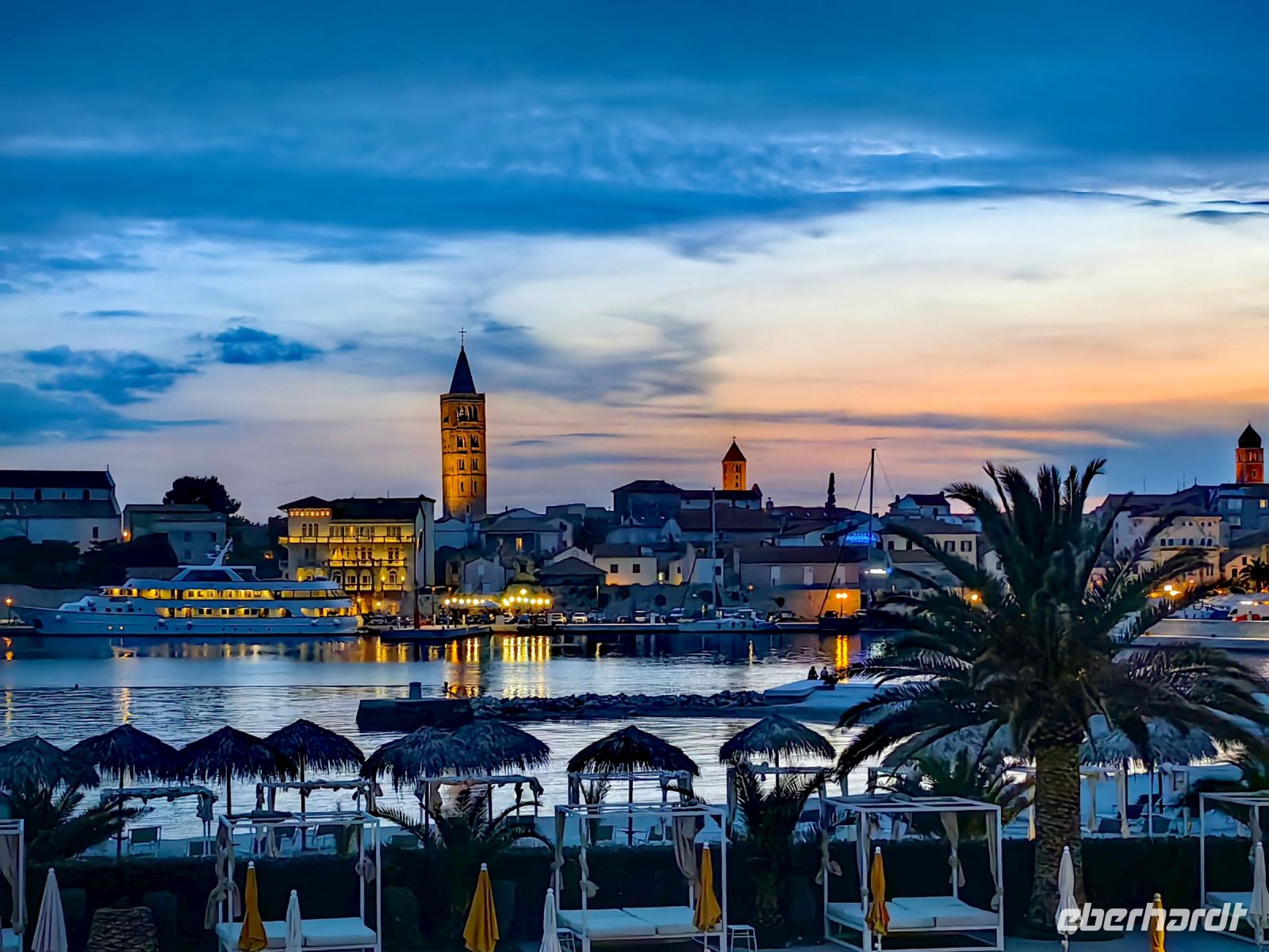 Nach ihrem Ende ragt endlich die Kulisse von Rab heraus, diese Insel ist 22 Kilometer lang, 91 Quadratkilometer groß und gehört zur Region Kvarner Bucht. Wir nehmen die Autofähre, auf der wir einen sonnigen Abendhimmel und die herrlichen Ausblicke erleben und kaum auf der Insel angekommen, erreichen wir unser heutiges Hotel, welches zur exklusiven Valamarkette gehört.