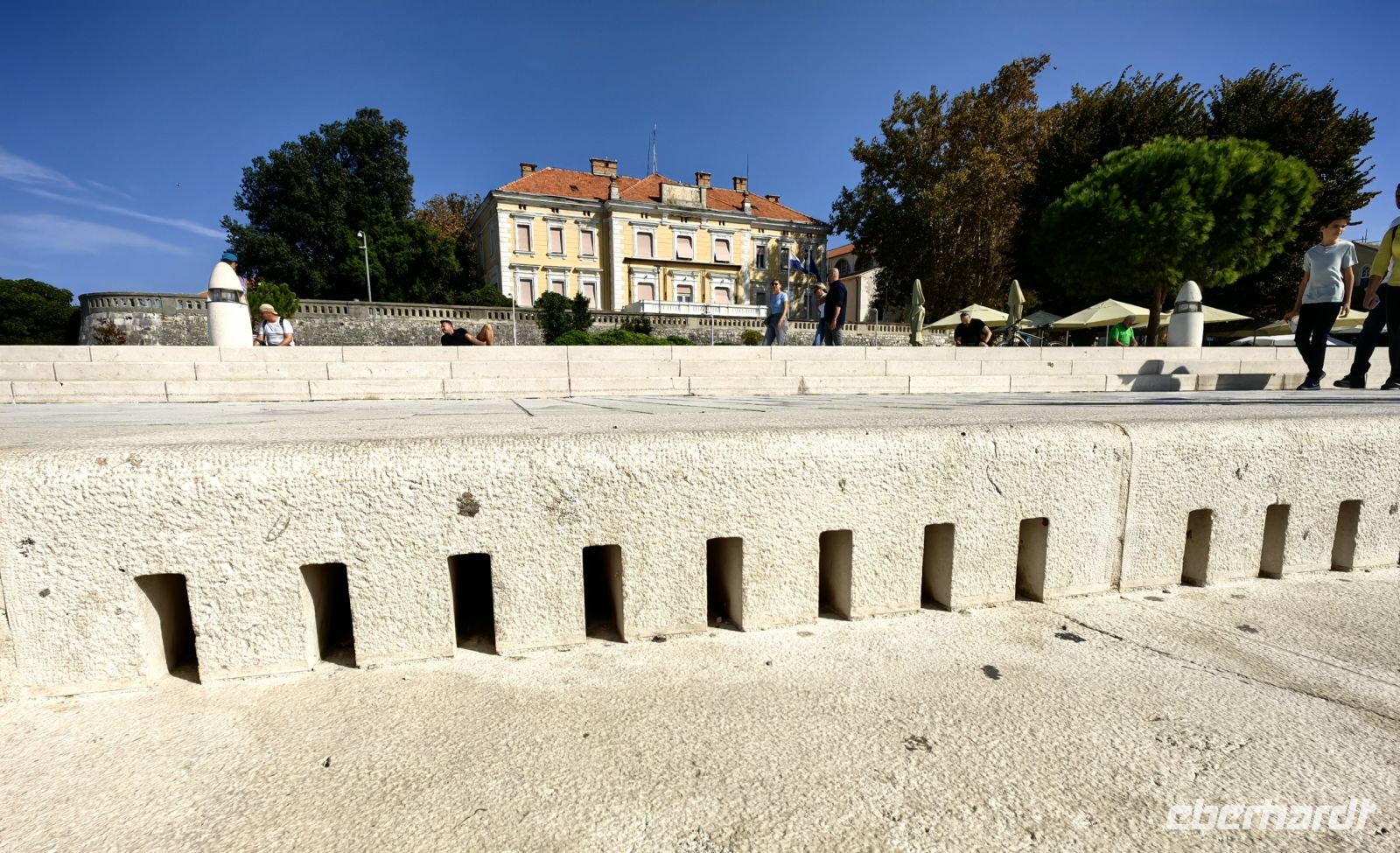 An der Uferpromenade hören wir schon von weitem ein Geräusch: die Meeresorgel. An der Strandpromenade kann man "Musik" hören, die vom Wind, dem Meer und den Wellen erzeugt wird und da an diesem Nachmittag der Südwind bläst, ist die Musik besonders eindrucksvoll. Eine gleich daneben befindliche weitere Kunstinstallation ist eine 22 Meter breite im Boden eingelassene Scheibe, die tagsüber die Sonnenstrahlen sammelt und diese dann nach Sonnenuntergang als Lichtmuster wieder gibt. Die Planeten sind als Reihe im Boden eingelassen. Ich hoffe, der ein oder andere Gast wird nochmal wiederkommen und sich dieses nächtliche Spektakel anschauen.