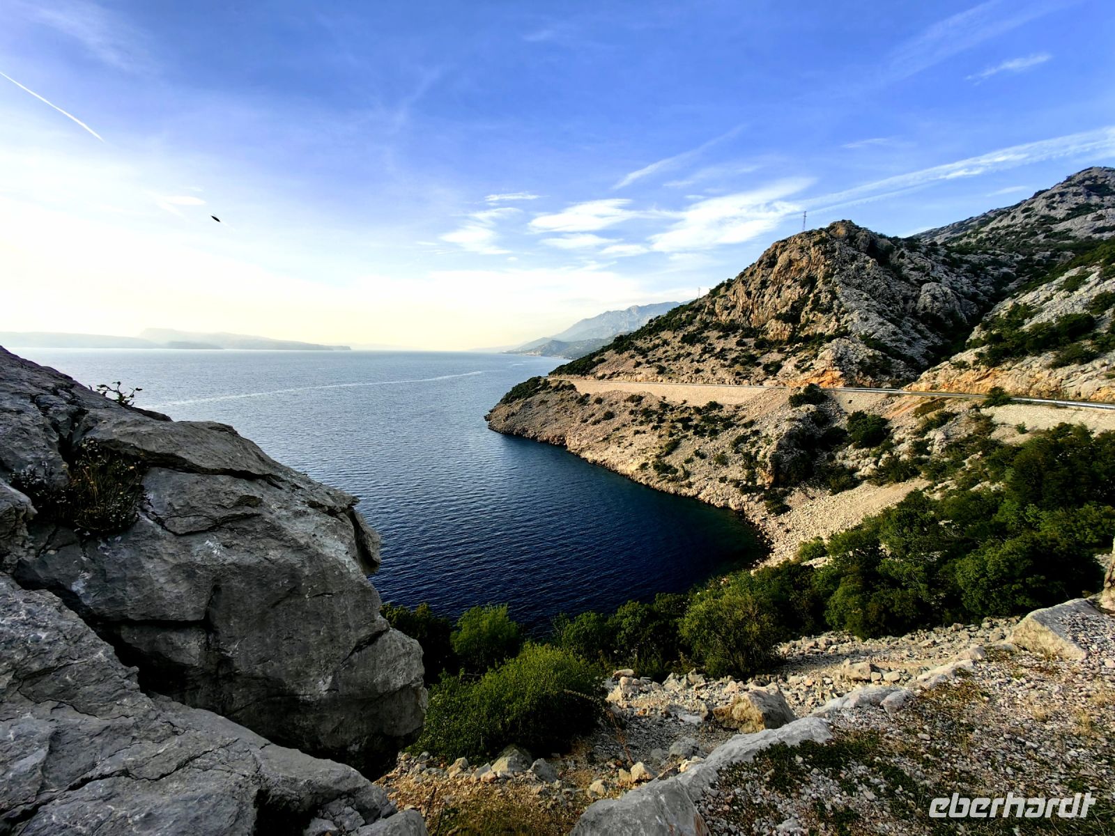 Wir verlassen die grünen Ebenen und unser Weg führt uns zwischen den Erhebungen des Velebitgebirges direkt hinunter an die Adria. Die Landschaft ändert sich merklich. Die Laubbäume verschwinden und die typische Adriavegetation zeigt sich: Nadelbäume, vor allem Pinien und kahlere karstigere Berge. Wir sehen die ersten Feigenbäume und Palmen.