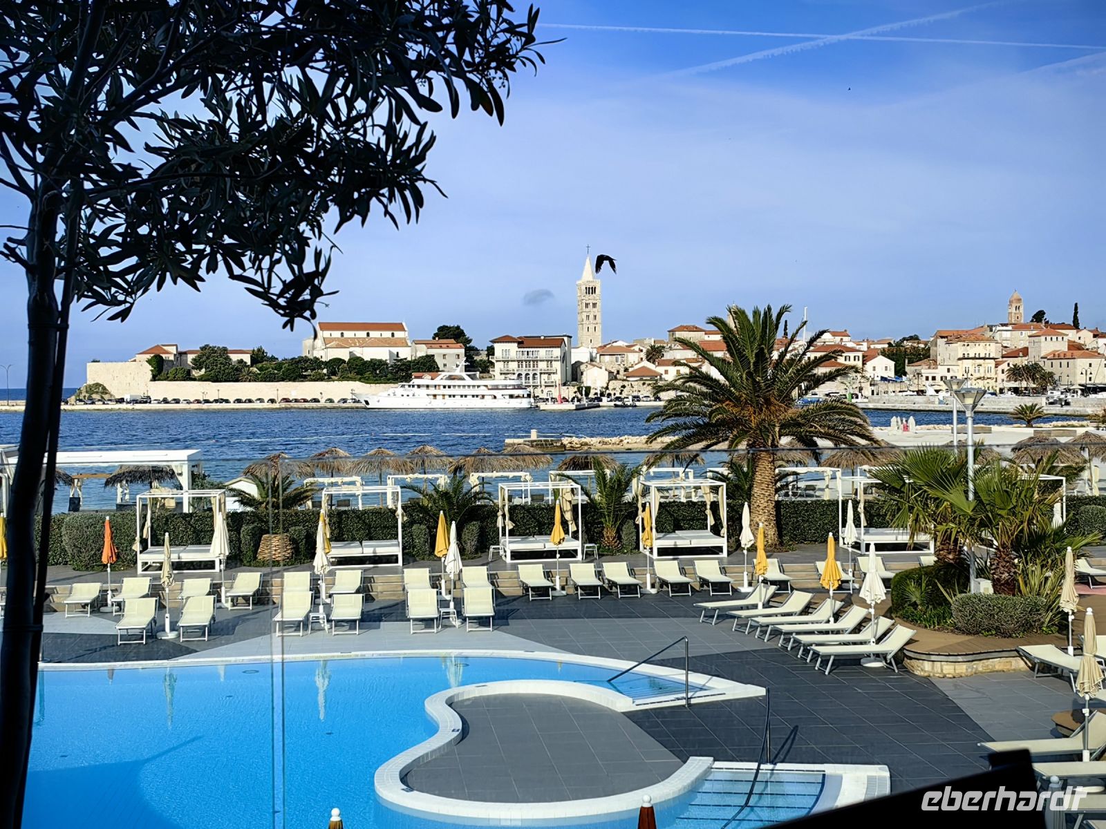 Von der Terrasse des Hotelrestaurants blickt man direkt auf die Altstadt von Rab und wir trinken gemeinsam einen Begrüßungssekt, bevor wir zum Abendessen ins Restaurant gehen.
