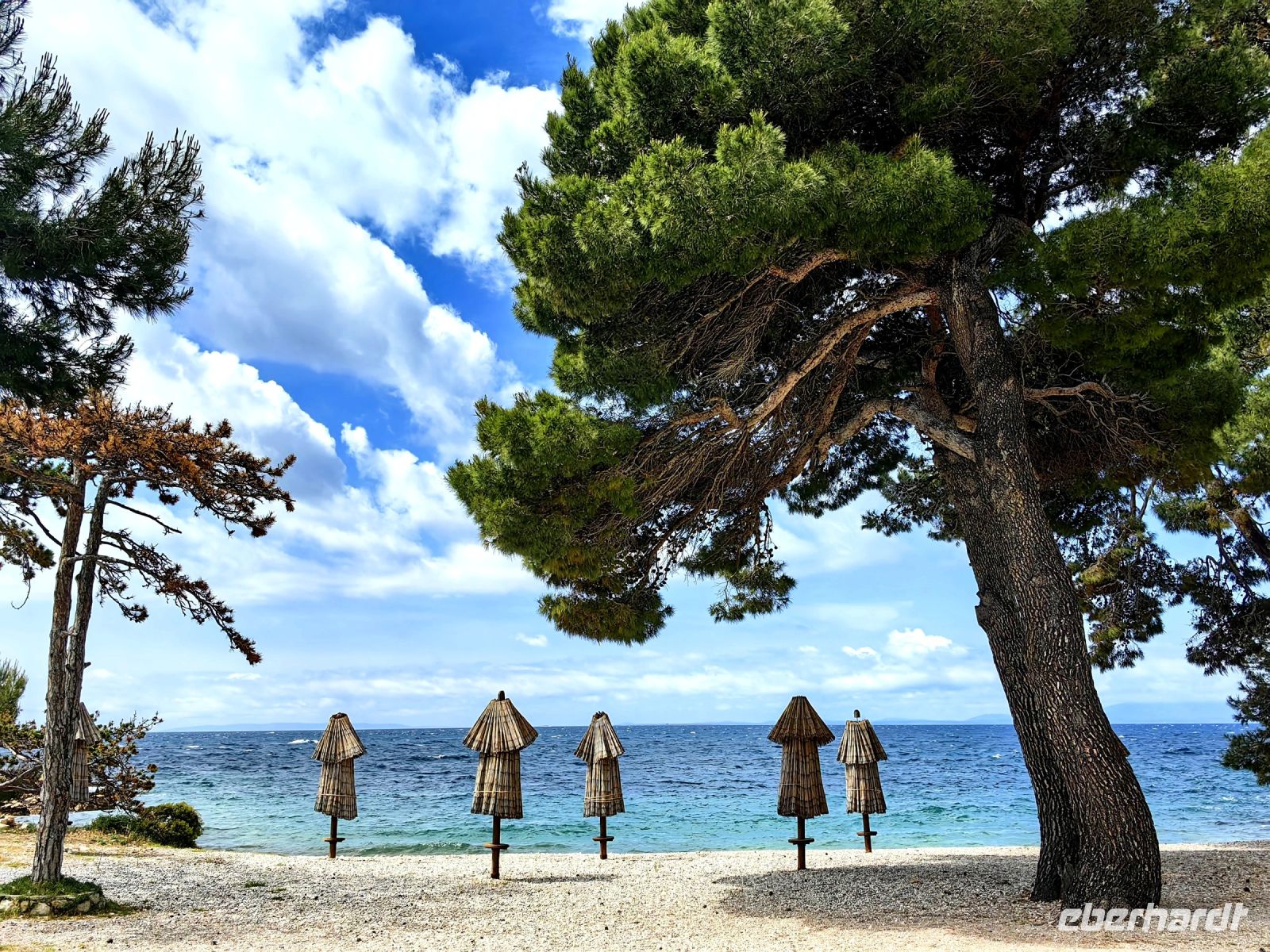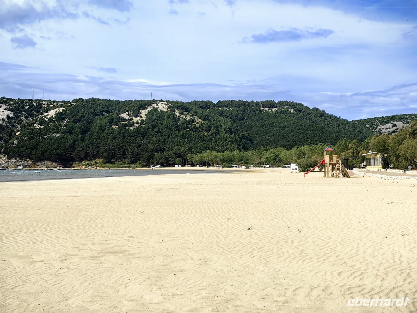 Wir steigen an einem natürlichen Sandstrand aus und spazieren am Wasser entlang, es ist dank der Vorsaison menschenleer. Die Sonne hat sich mittlerweile durchgekämpft und läßt das Meer glitzern. An einem anderen Strand ist die Szenerie wild und steinig und wir schießen begeistert Fotos.