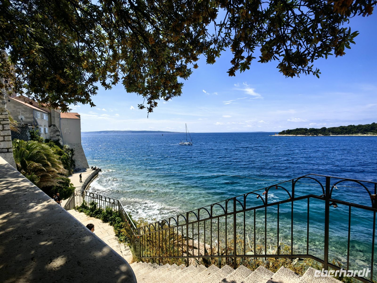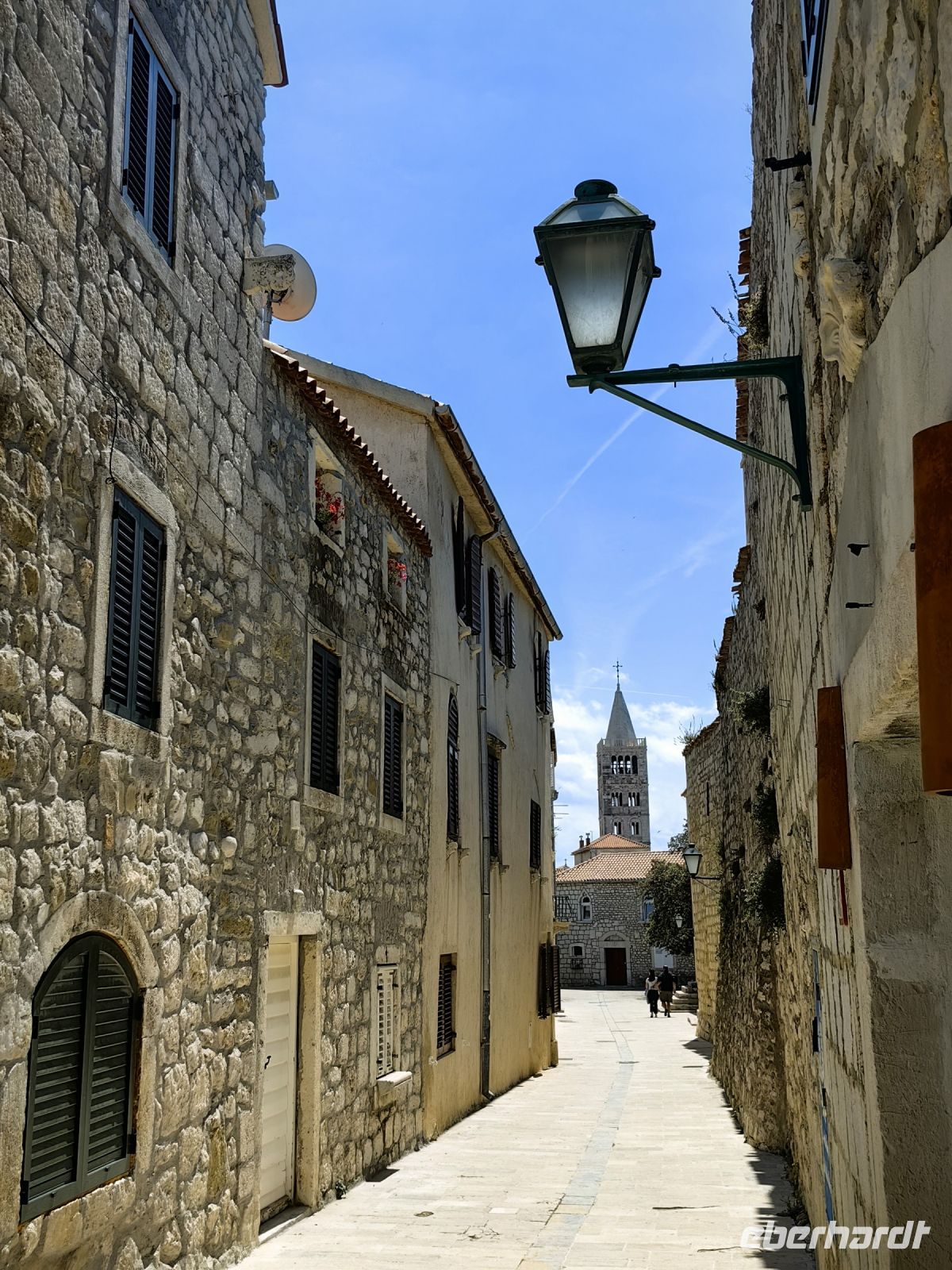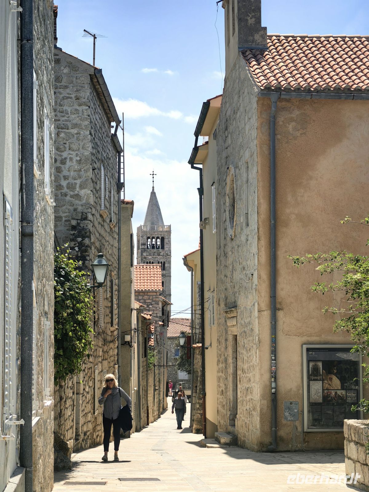 Der Name dieser malerischen Insel mit der gleichnamigen Hauptstadt leitet sich von dem illyrischen Wort Arb ab, was so viel wie dunkelgrün bedeutet. Tatsächlich ist Rab eine üppig grüne Insel, 41 Prozent sind bewaldet. Viele Kirchen und Plätze in der Altstadt von Rab gibt es bereits seit der römischen Zeit und so beginnen wir unseren Spaziergang bei den Überresten der Kirche des Heiligen Johannes aus dieser Zeit. Vom Trg Svetog Kristofora nach Süden gelangt man vorbei an der Galerie, dem Kristoforusmuseum mit Lapidarium in die Gornja Ulica, die Bergstraße. Diese ist kulturell betrachtet der bedeutendste Straßenzug durch die Altstadt. An der Kapelle Sveti Antun aus dem 17. Jahrhundert teilt sich die Straße in die Donja Ulica, die Talstraße, und die Srednja Ulica, die mittlere Straße. Dort findet man unzählige hübsche Cafés und Restaurants. während in der Srednja Ulica vor allem Geschäfte sind, die unterschiedliche Souvenirs verkaufen und kleine Modeboutiquen.