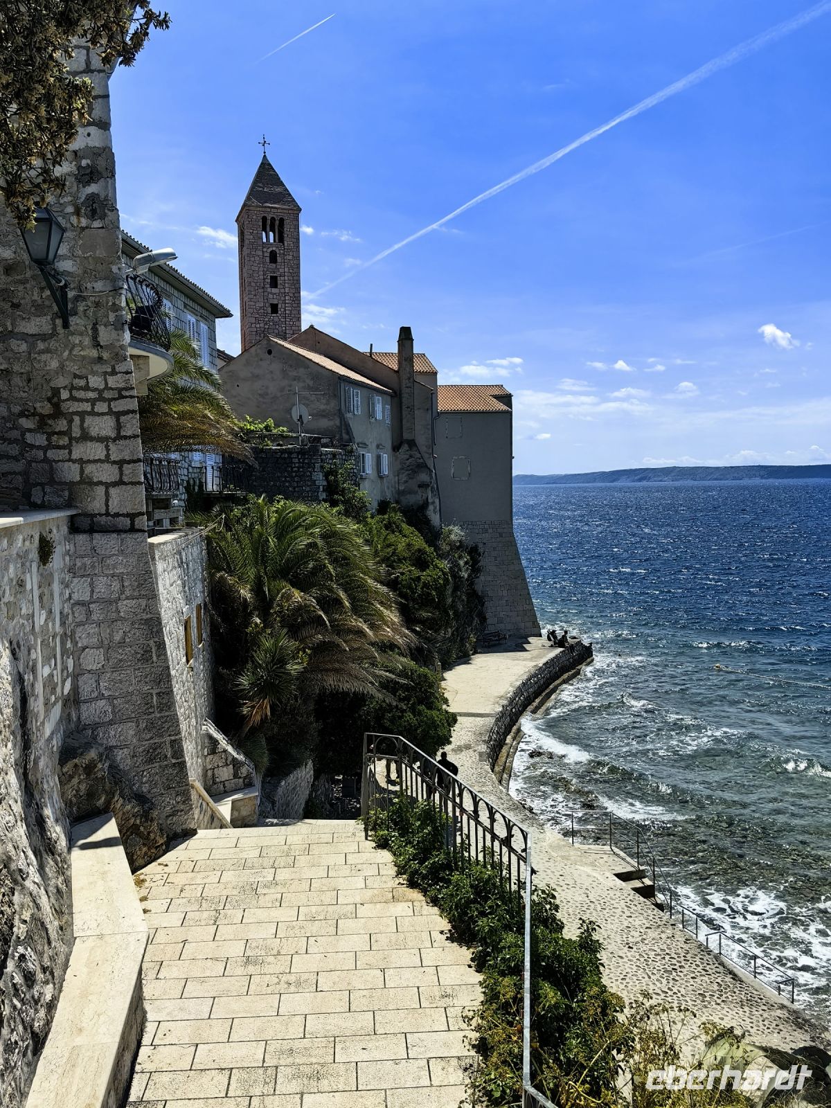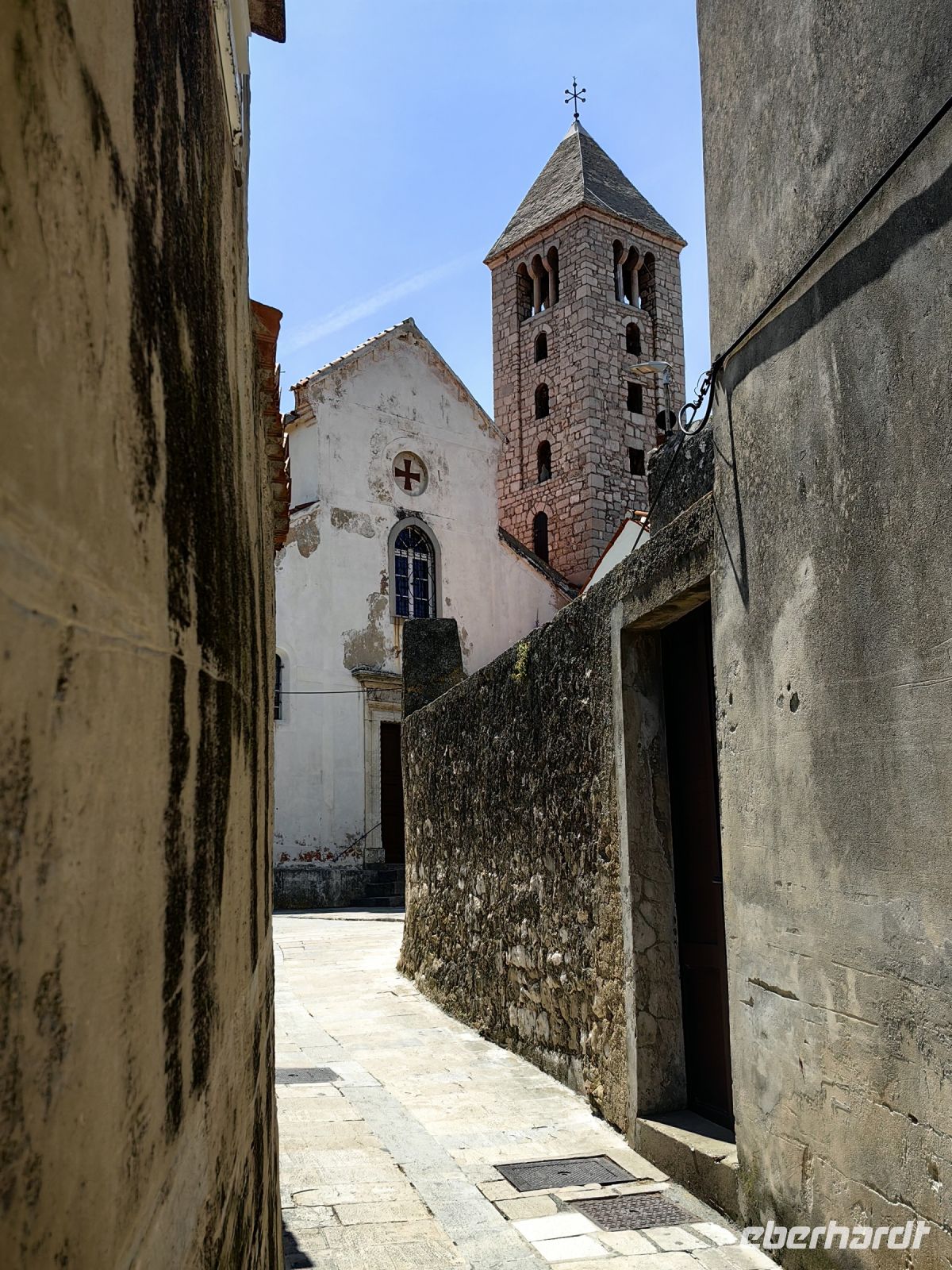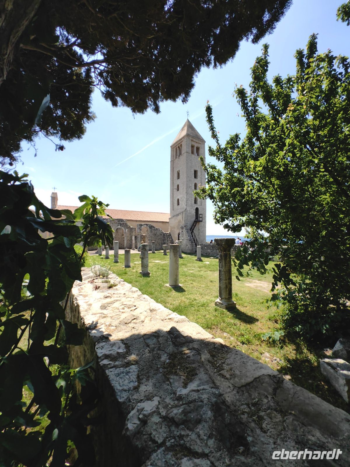 Der Name dieser malerischen Insel mit der gleichnamigen Hauptstadt leitet sich von dem illyrischen Wort Arb ab, was so viel wie dunkelgrün bedeutet. Tatsächlich ist Rab eine üppig grüne Insel, 41 Prozent sind bewaldet. Viele Kirchen und Plätze in der Altstadt von Rab gibt es bereits seit der römischen Zeit und so beginnen wir unseren Spaziergang bei den Überresten der Kirche des Heiligen Johannes aus dieser Zeit. Vom Trg Svetog Kristofora nach Süden gelangt man vorbei an der Galerie, dem Kristoforusmuseum mit Lapidarium in die Gornja Ulica, die Bergstraße. Diese ist kulturell betrachtet der bedeutendste Straßenzug durch die Altstadt. An der Kapelle Sveti Antun aus dem 17. Jahrhundert teilt sich die Straße in die Donja Ulica, die Talstraße, und die Srednja Ulica, die mittlere Straße. Dort findet man unzählige hübsche Cafés und Restaurants. während in der Srednja Ulica vor allem Geschäfte sind, die unterschiedliche Souvenirs verkaufen und kleine Modeboutiquen.