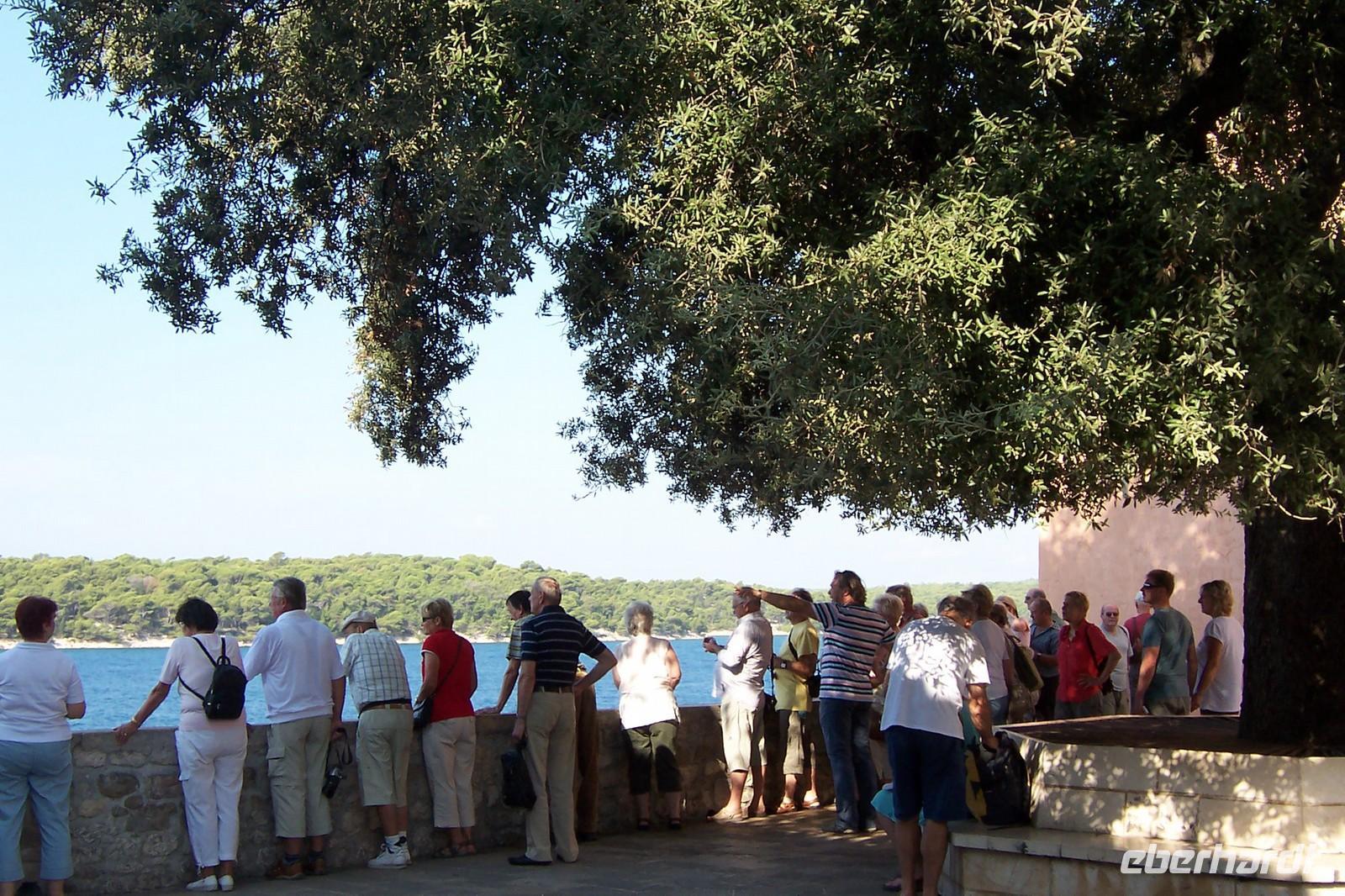 Am Nachmittag gönnt sich ein Teil der Gruppe noch eine Bootsfahrt. Dabei sehen wir nicht nur die Stadtmauer der Stadt Rab, sondern auch die vielen FKK Anhänger. Es war der englische Exkönig Eduard, der im August 1936 das Nacktbaden popularisierte. Richtig in Fahrt kam es aber unter Tito und heute findet man die Nacktbader an den idyllischen Stränden bei Lopar. Wir nutzen den Strand des Hotels, um vor dem Abendessen noch etwas zu baden.