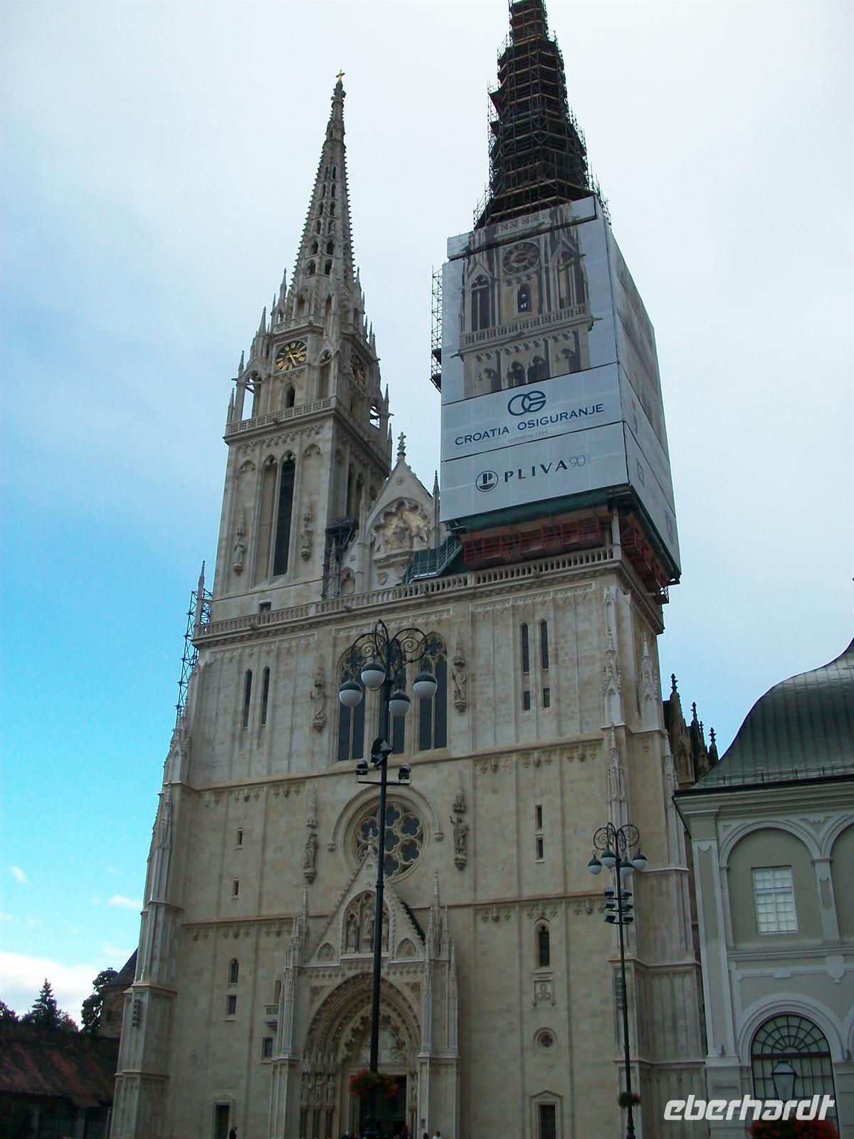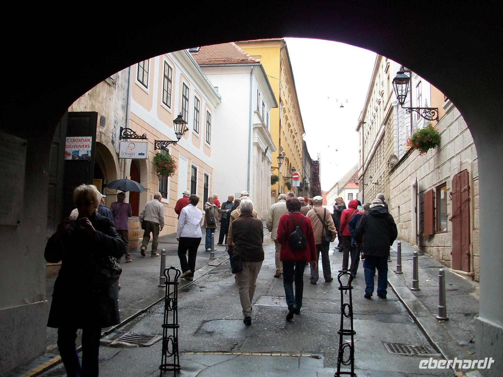 Besorgt schaue ich nach Norden. Über dem Zagreber Berg hat sich eine mächtig dunkle Wolkenfront aufgebaut die langsam in unsere Richtung zieht. Die Gruppe kommt vom kleinen Rundgang zurück und weiter geht die Fahrt in Richtung Kathedrale. Beim Aussteigen beginnt der Regen, bald sind wir aber im Gotteshaus das uns schützend empfängt. Nach der Kirchenführung ist der Himmel wieder klar und nun beginnt der Rundgang durch den ältesten Teil der Stadt. Über den Markt und vorbei an schönen Bürgerhäusern kommen wir am Steintor und dem wundersamen