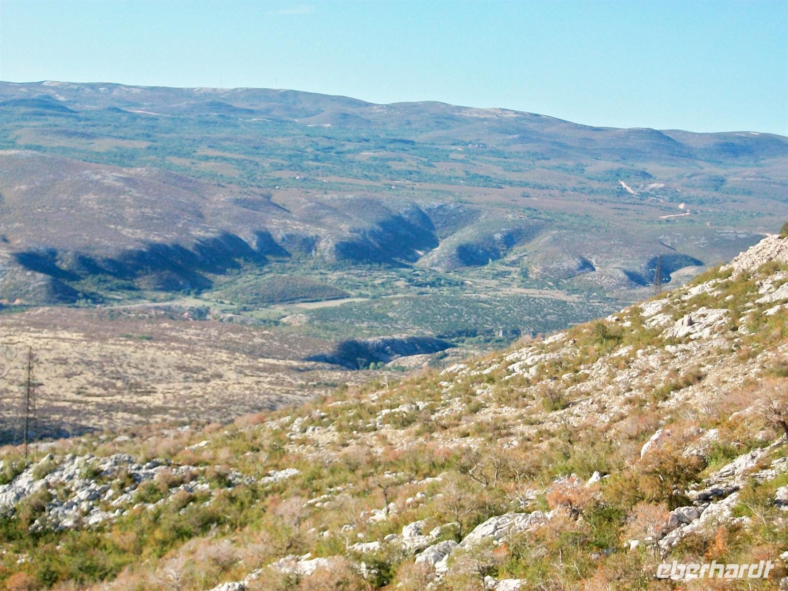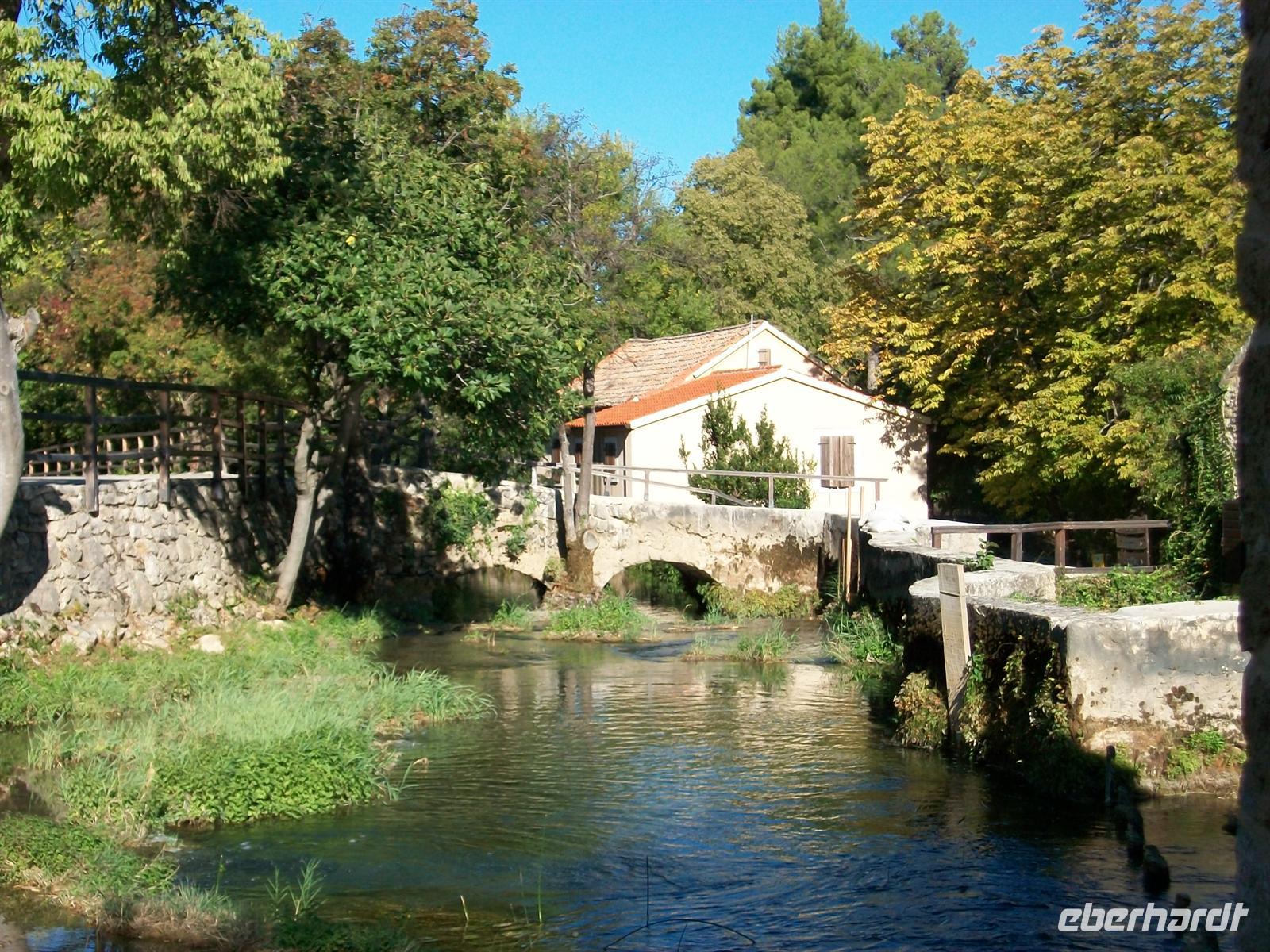 Nach einer kurzen Pause durchbrechen wir das Velebitgebirge und durchmessen einen besonders schönen Fahrtabschnitt. Mächtig sind die Felstürme des Gebirges die rau und unwirtlich unsere Fahrt begleiten. Plötzlich öffnet sich der Blick auf eine große Ebene in die ein Fluss ein tiefes Bett geschnitten hat, welches sich in zahlreichen Windungen der Adria zuwendet. Es ist der Zrmanja- Fluss der im Tal seinen Lauf nimmt welches noch etwas dunstig vor uns liegt. Kroatien hält viele dieser Überraschungen bereit die sich aber selten von den gängigen Touristenrouten aus erschließen lassen, so auch hier. Bei der Fahrt hinunter sehen wir auf der rechten Seite das mächtige Kalkmassiv des Tulove Grede, in den Karl- May- Filmen befanden sich dort die Goldberge der Apachen und an diesem Ort wurde auch Winnetou in die ewigen Jagdgründe gesandt. Bis zum heutigen Tag hat diese Naturschönheit nichts von ihrer Attraktivität eingebüßt.