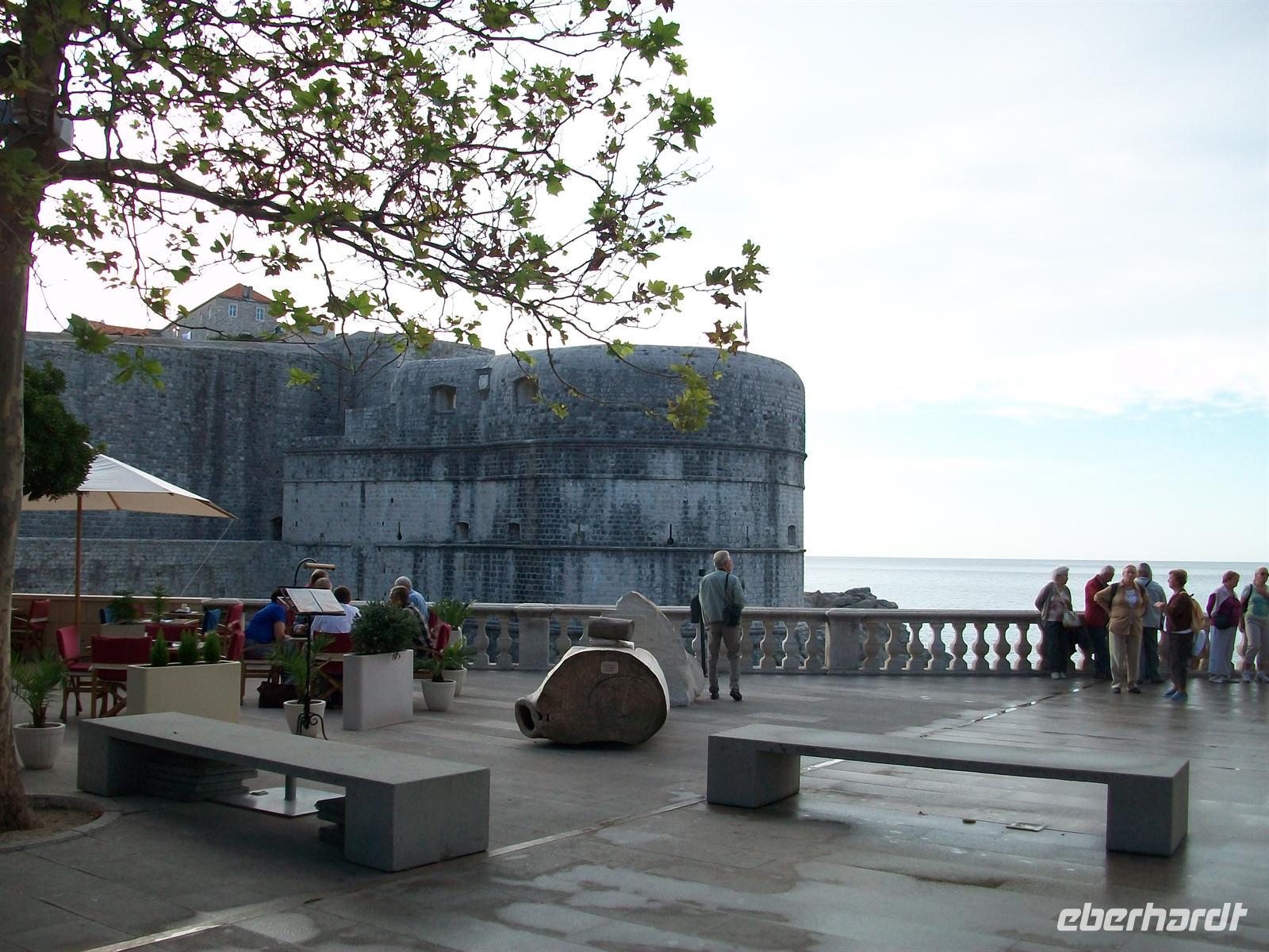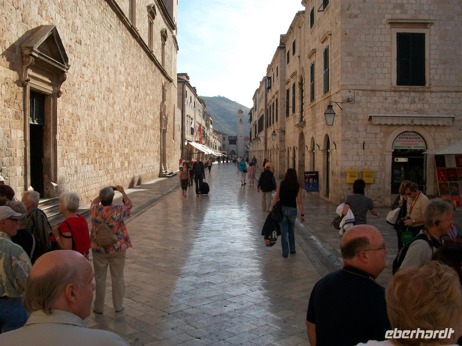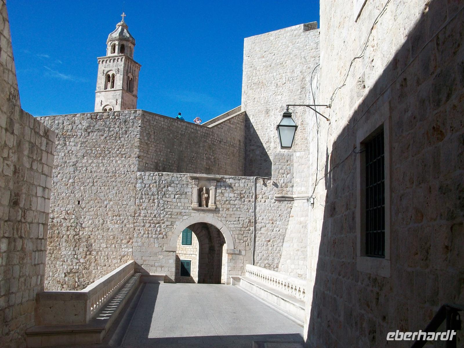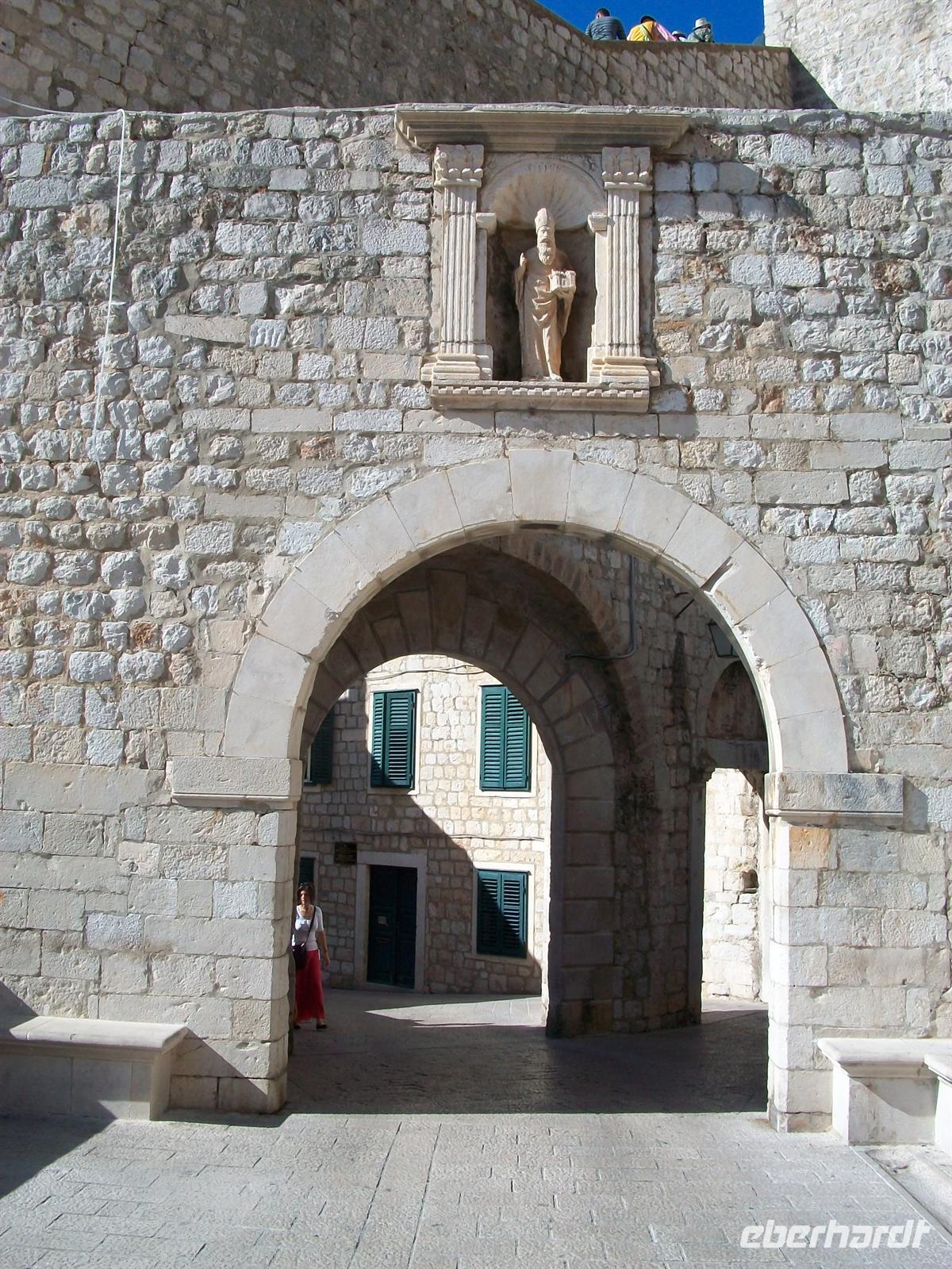 Mächtige Mauern umschließen die Altstadt, ein quirliges Leben herrscht vor dem Stadttor am Pile- Platz. Reisebusse bringen die Gäste von den Kreuzfahrtschiffen, welche sich diese großartige „“ anschauen möchten. Da wir etwas eher gestartet sind ist das Treiben in der Altstadt noch nicht so groß. Mit unserem Stadtführer Albin betreten wir, nicht ohne vom Stadtpatron Blasius einen steinernen Gruß bekommen zu haben Dubrovnik, die einst mächtige Stadtrepublik, die erst durch Napoleon der Autonomie beraubt wurde, die sie über Jahrhunderte