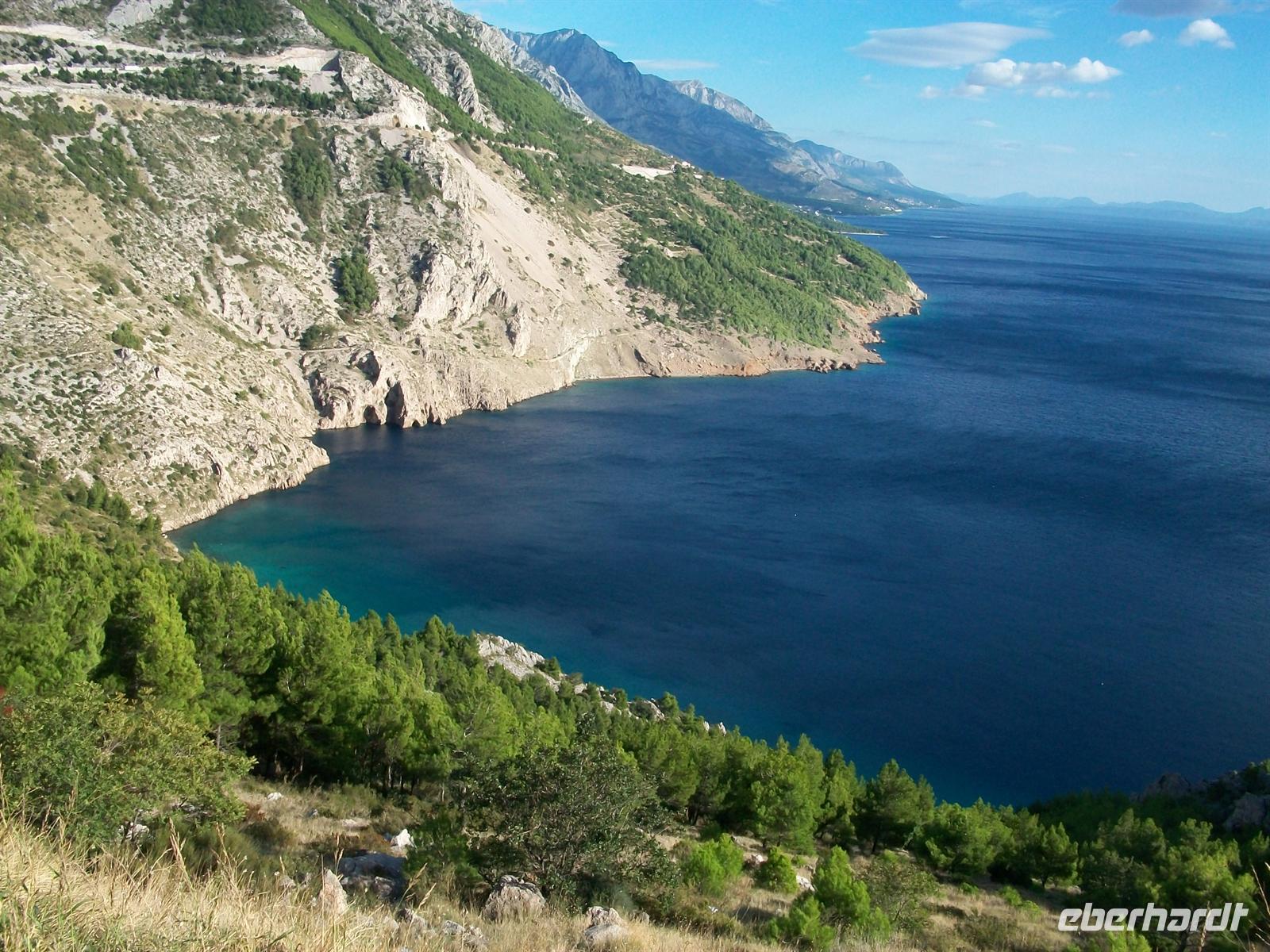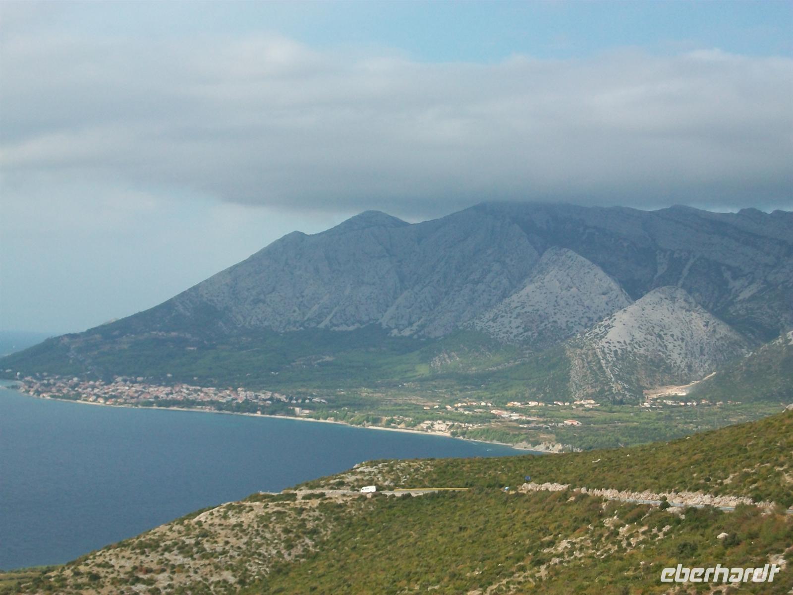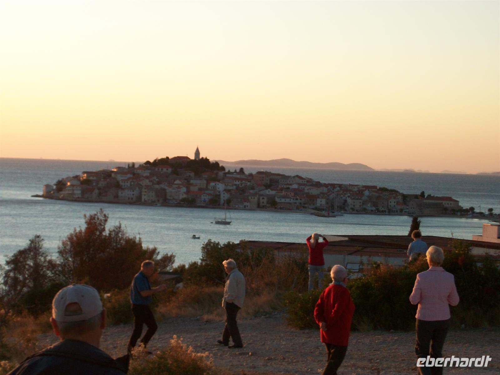Durch die alte Habsburger Garnisonsstadt Gospi hindurch fahren wir auf über 900 Meter hinauf zum Pass. Danach senkt sich die Straße wieder ab um uns bald einen phantastischen Ausblick auf die Adria zu gestatten. Tief unter uns liegt die unermessliche Wasserfläche, die von der Nachmittagssonne beschienen wird. Silhouettenhaft zeichnet sich die lange Masse der Insel Pag ab. Der Fotostopp wird buchstäblich vom Winde verweht, eiskalt und in Orkanstärke wütet hier oben die Bora. Schnell sind die Fotografen wieder in den Schutz des Reisebusses zurückgekehrt, die Fahrt führt uns in Serpentinen langsam hinunter ans Meer.