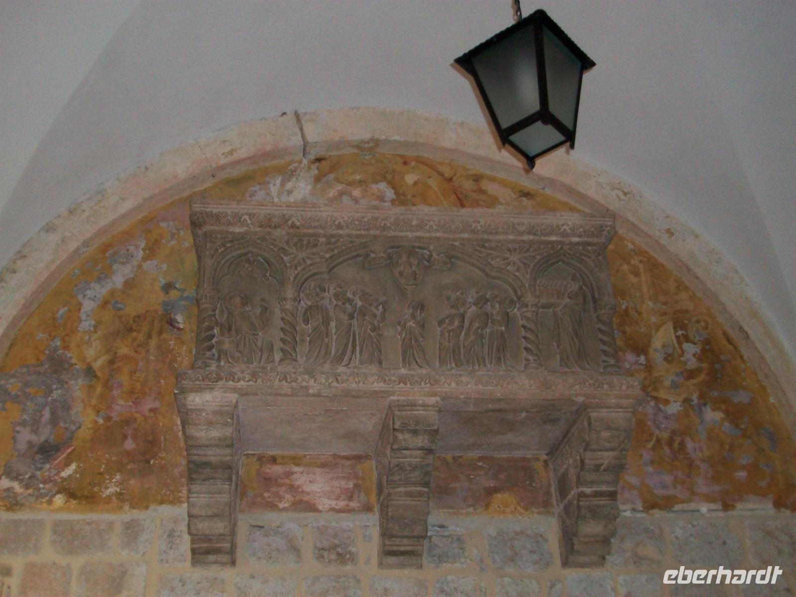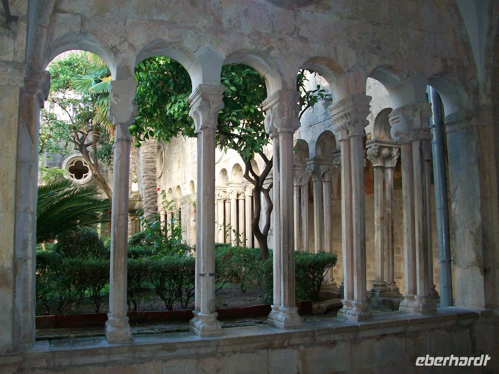 Wir treten ein in die Hauptfußgängerzone mit ihren blankgeputzten Kalksteinen die in der Morgensonne das Licht widerspiegeln als wären sie eingebohnert. Unser Weg führt uns zuerst in das Franziskanerkloster; die Augen unserer Reisegäste erfreuen sich am schönen romanischen Kreuzgang, den einfachen Wandmalereien und schließlich an der Alten Apotheke. Durch diese Räume weht der Hauch vergangener Jahrhunderte, was könnten uns die Steine alles erzählen wenn sie der Sprache mächtig wären? So oft ich schon an diesem Ort war, so entdecke ich aber auch immer wieder Neues. Auf den Sockeln des Säulen sind Steinmetzzeichen eingemeißelt die mir bisher entgangen sind. Auch sie könnten Geschichten erzählen über die Baumeister, das harte Leben dieser Zeit und über Fleiß, Mühe und Entbehrungen.