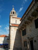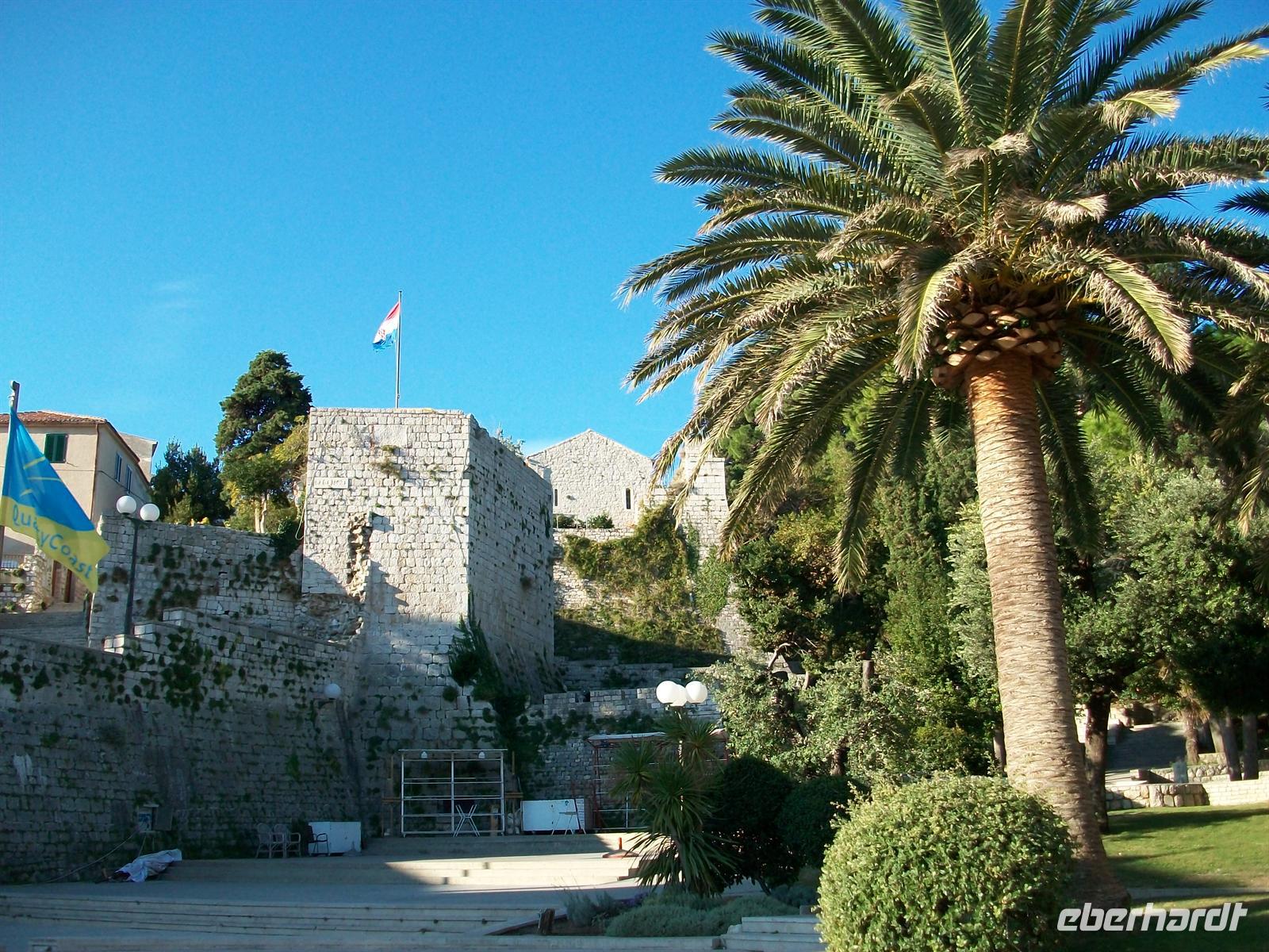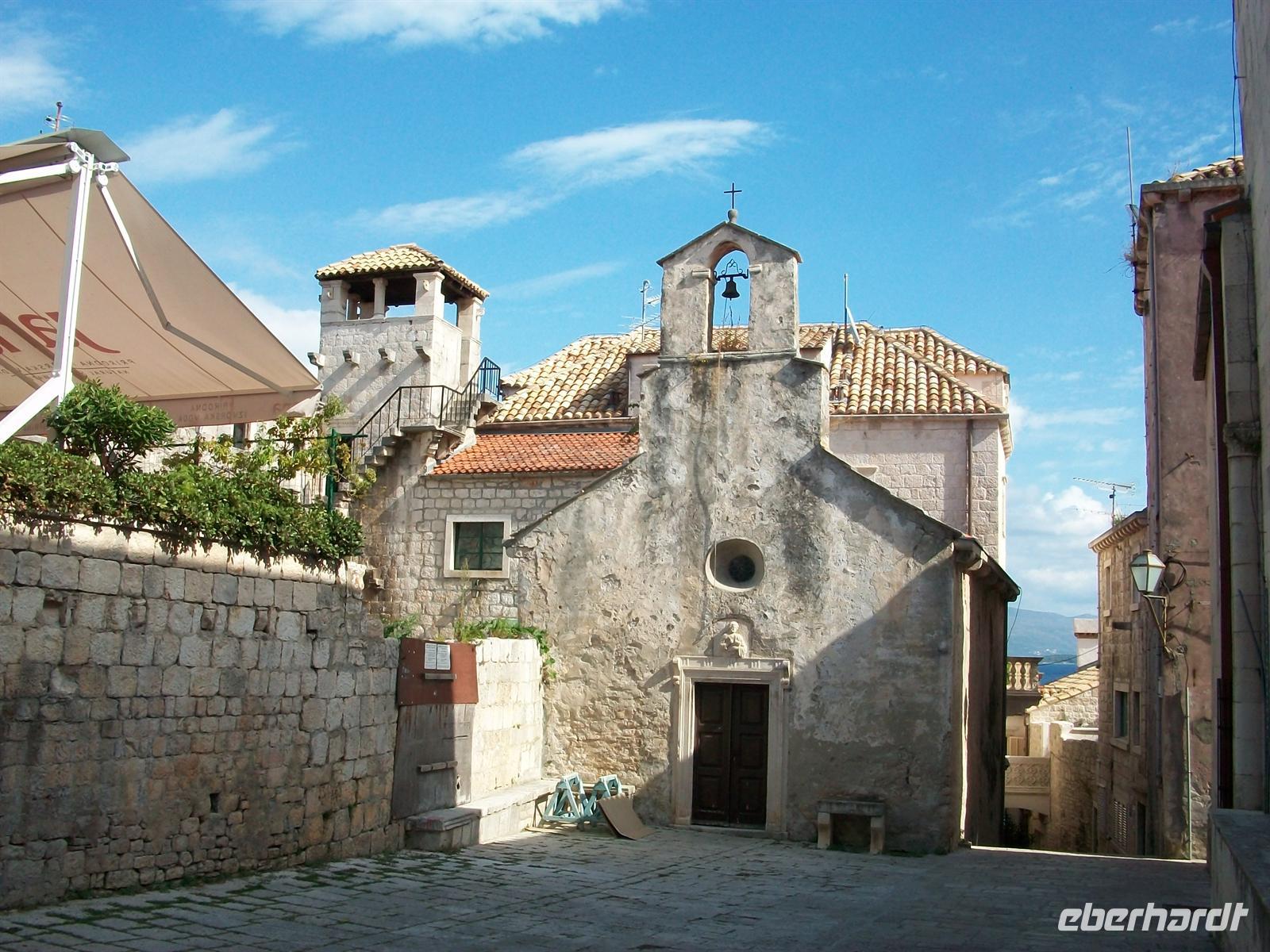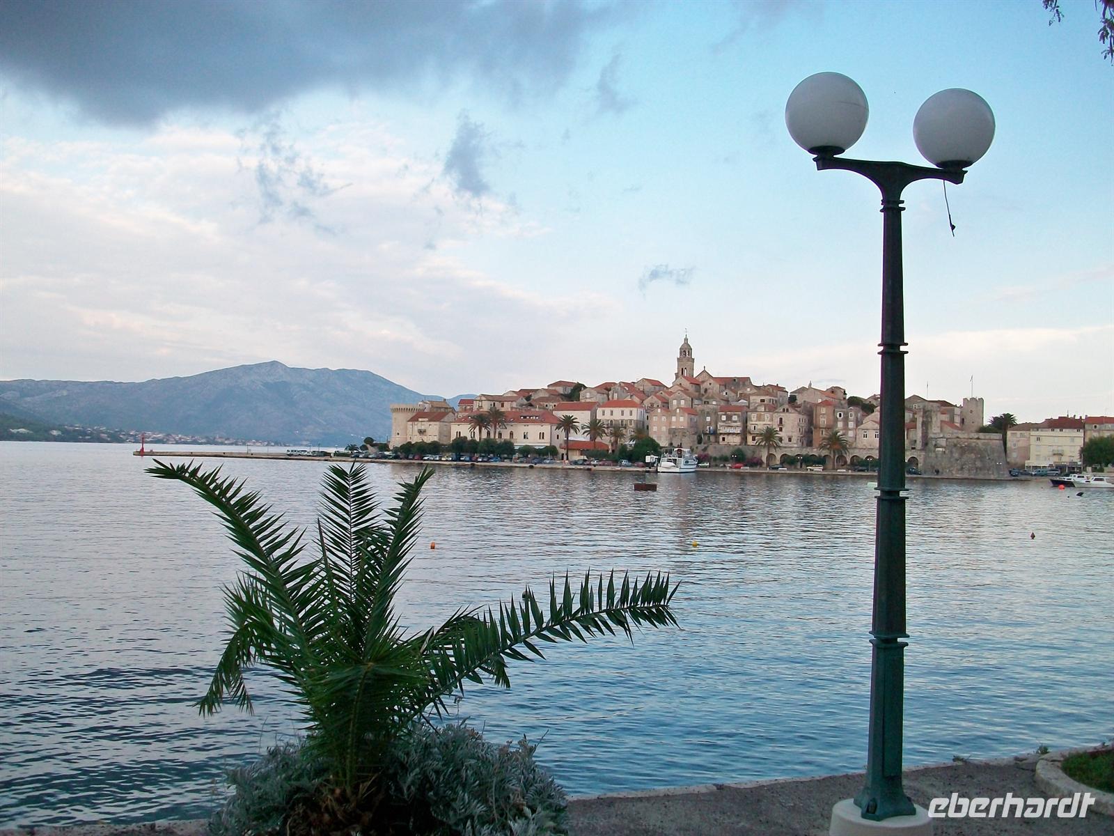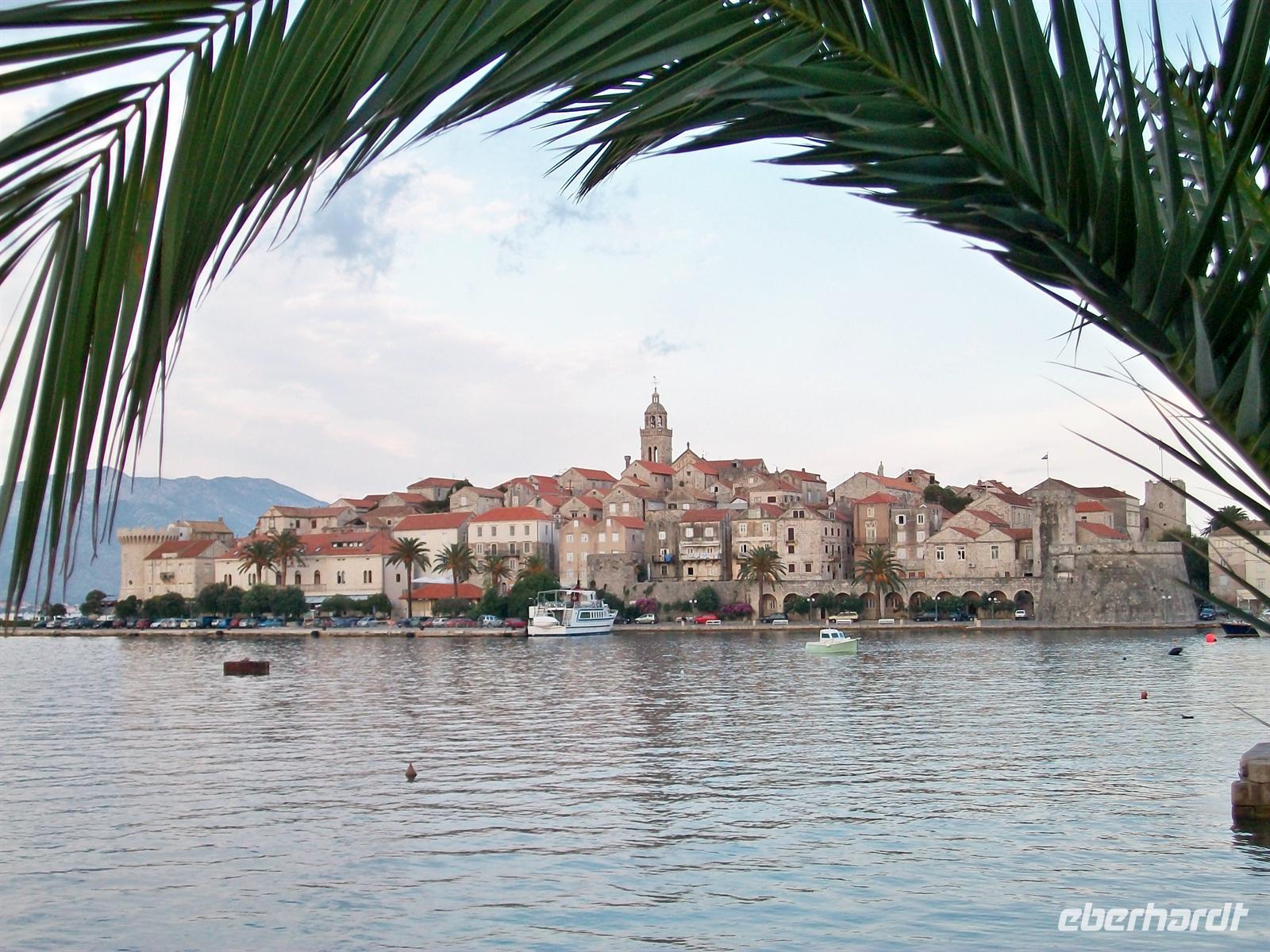 Ort atmet Geschichte. Gigantische Festungsmauern schützten hier einst den Abbau des weißen Goldes, mit den Erlösen des Salzhandels finanzierte Ragusa seine Autonomie. Dieser Ort ist deshalb immer einen Aufenthalt wert. Nach einer guten Stunde Fahrtzeit sind wir nun hier in Orebi angekommen und rücken nur langsam vor um auf die Autofähre zur Insel Korula zu fahren. Die Gäste haben sich bei diesem wieder sonnigen Wetter auf das obere Deck begeben und sehen Insel und Ort näher kommen, immer wieder ein Erlebnis! Nach viertelstündiger Überfahrt kommen wir an, kurz ist der Weg zur Altstadt wo wir von unserem Führer Lujo bereits erwartet werden.