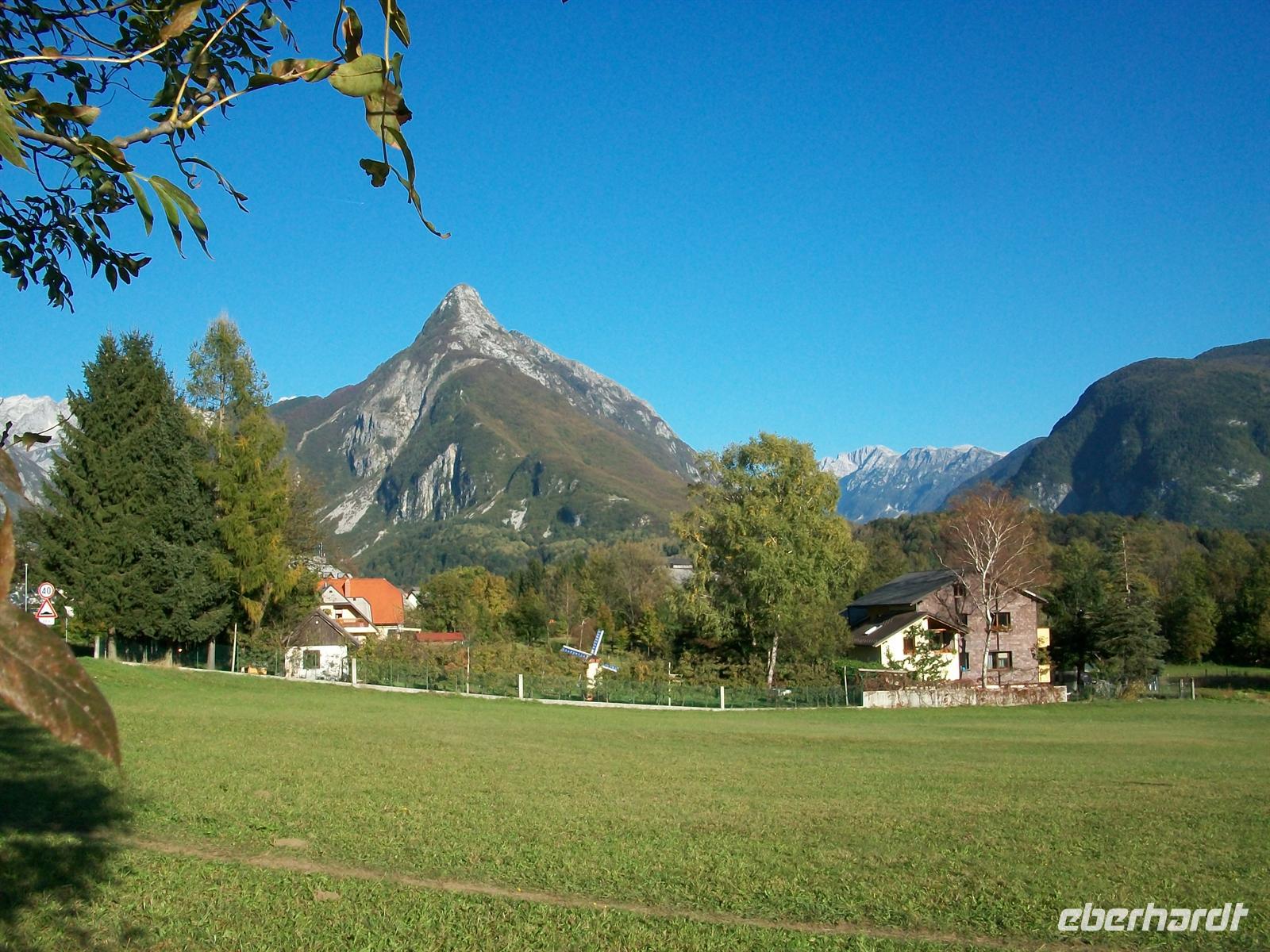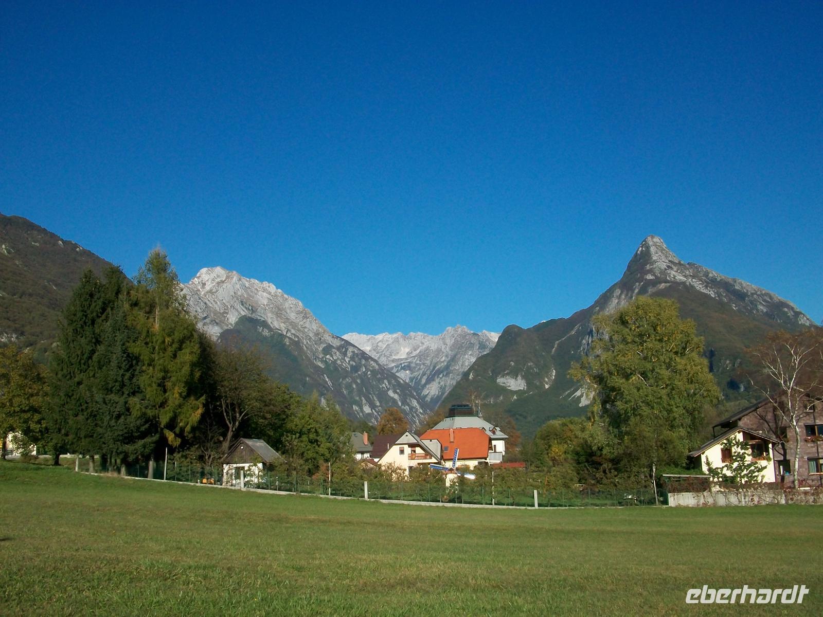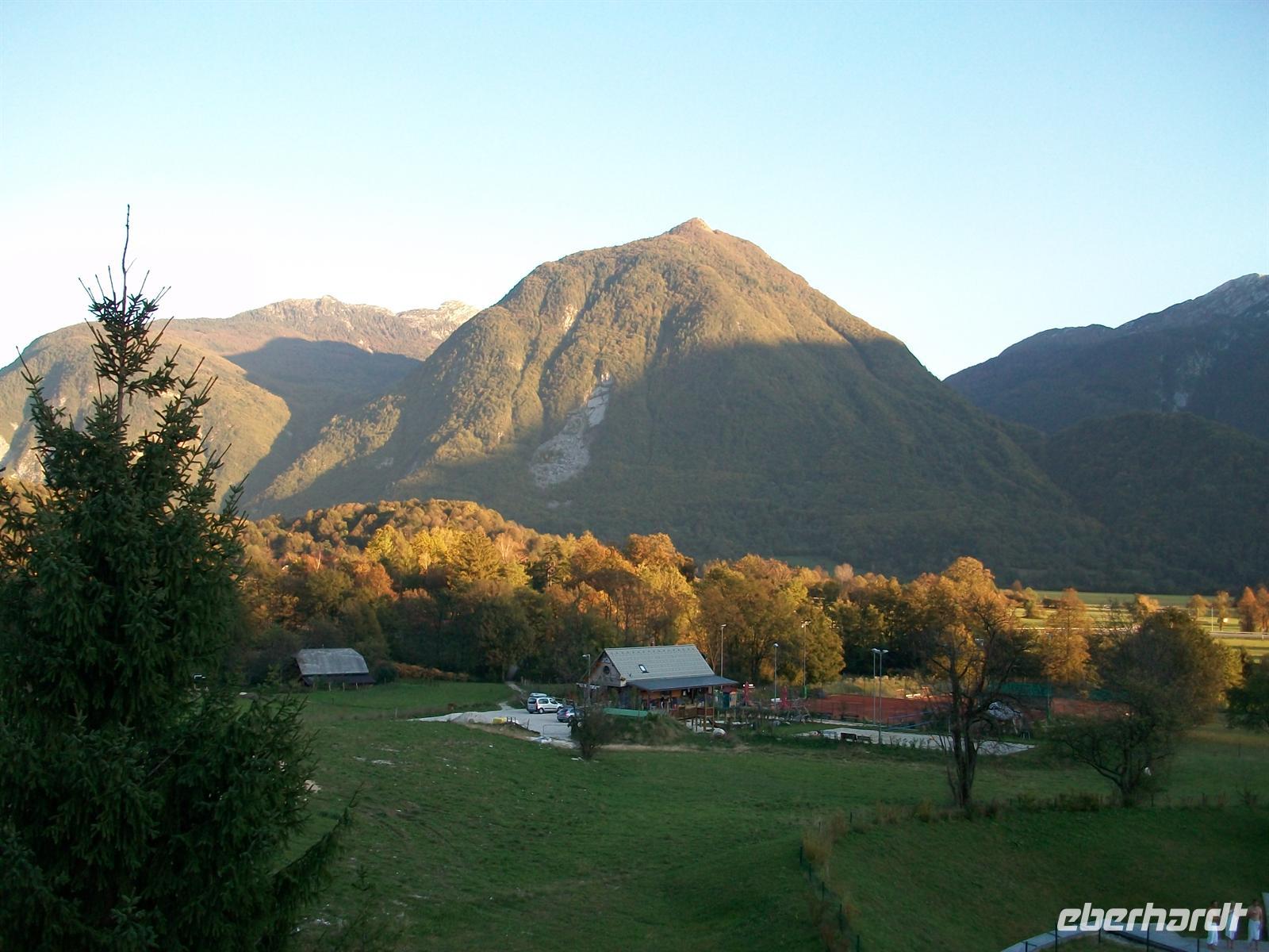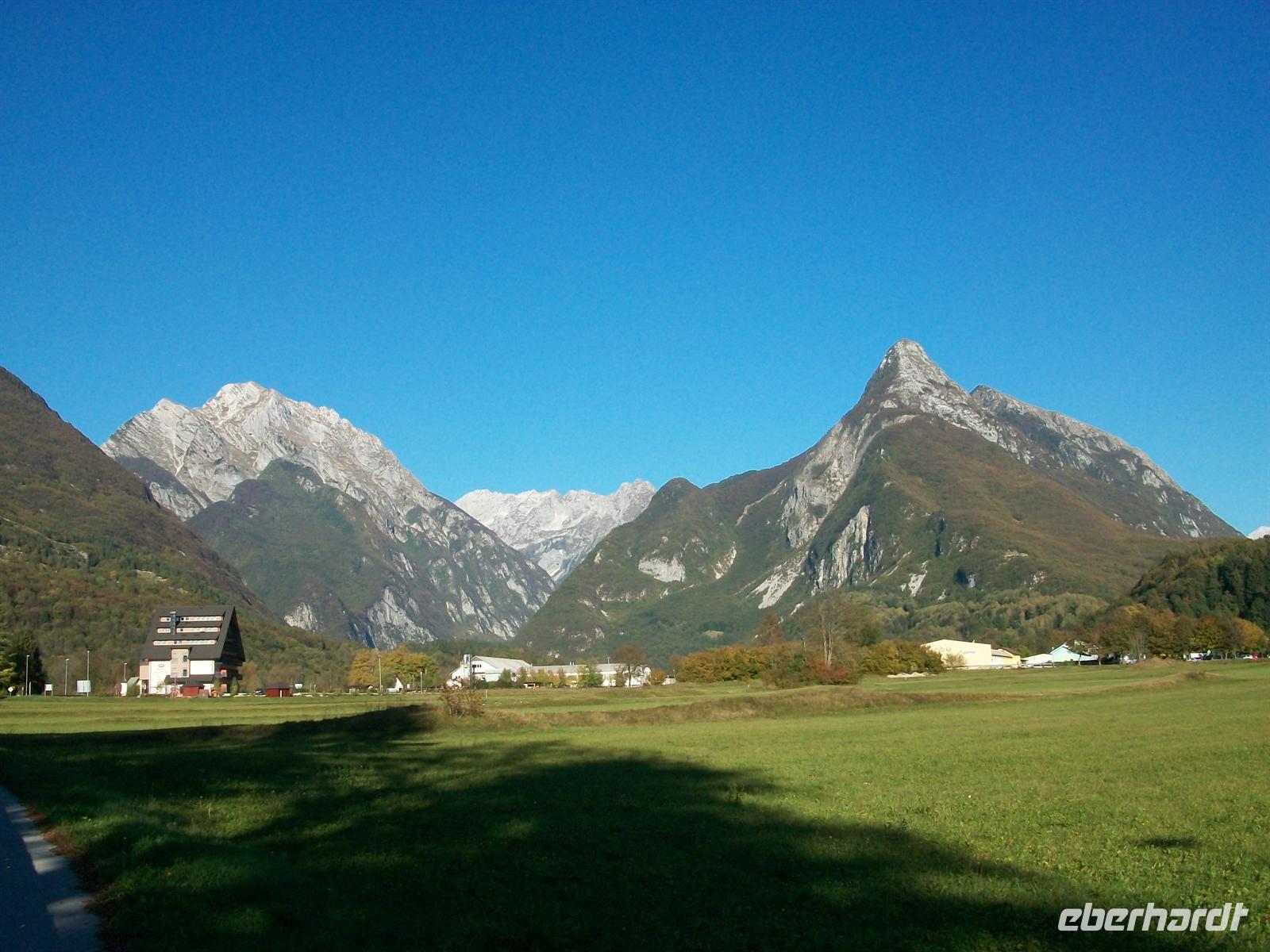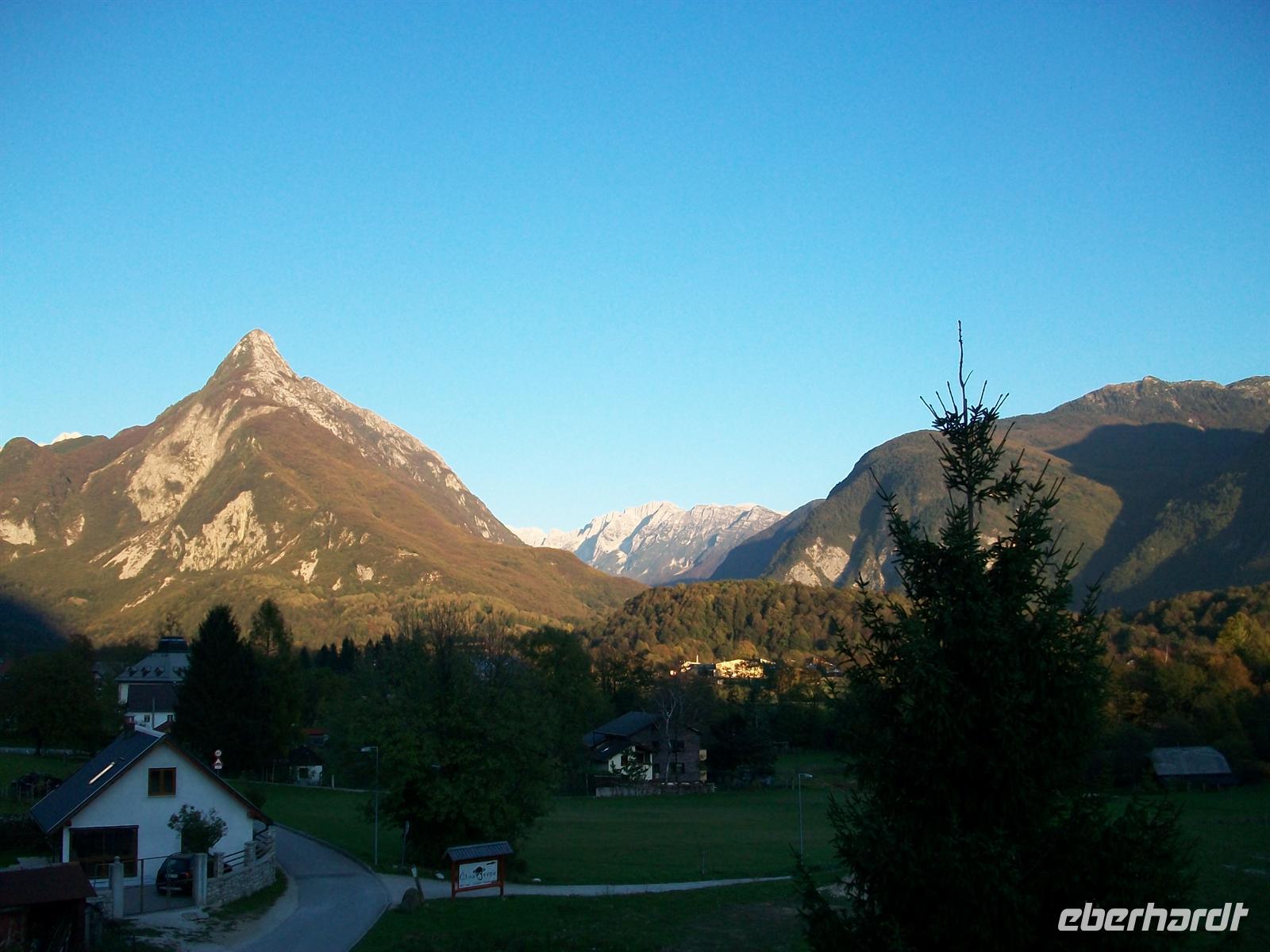 Harmonisch gestaltet sich die Fahrt an Lipizza vorbei, durch das Wippachtal und schließlich durch das wildromontische Flusstal welches sich die Soa gegraben. Die eigentümlich grüne Farbe des Flusses begleitet uns bis nach Bovec, gegen 15.30 Uhr erreichen wir hier unser Hotel. Der Himmel ist wolkenlos, ideales Wetter um in dieser Alpenkulisse einen schönen Nachmittag genießen zu können, doch bald neigt sich die Sonne und sie verschwindet schließlich hinter den Bergen. Schatten senkt sich auf das Tal, die Luft wird frisch, Zeit zum Hotel zurückzukehren und mit gutem Appetit zum Abendessen zu gehen. Die letzte Nacht dieser Tour bringt einen erholsamen Schlaf, die Sterne funkeln zu meinem Fenster hinein, im Tal ist Ruhe eingekehrt.