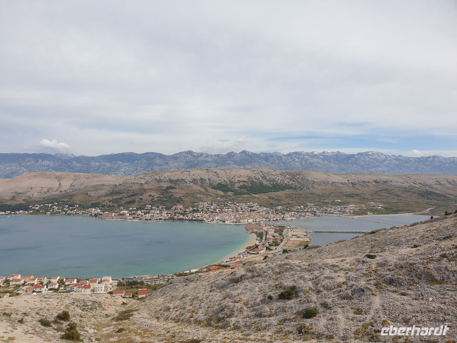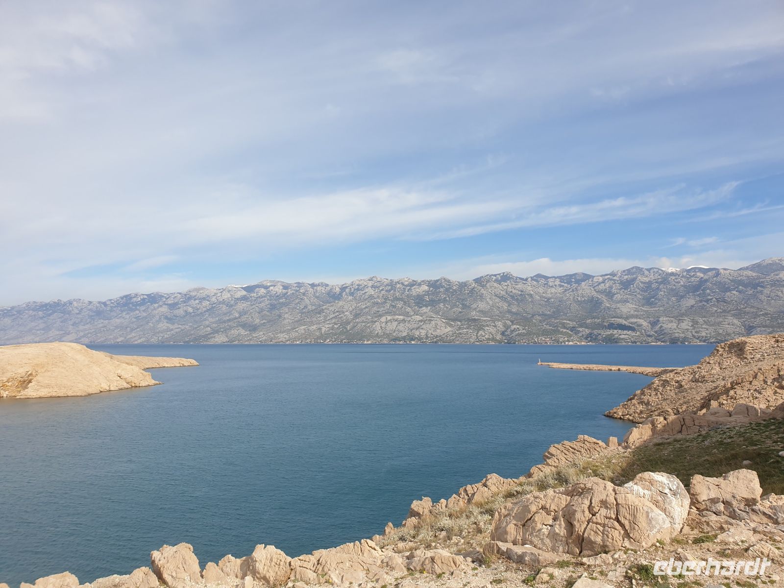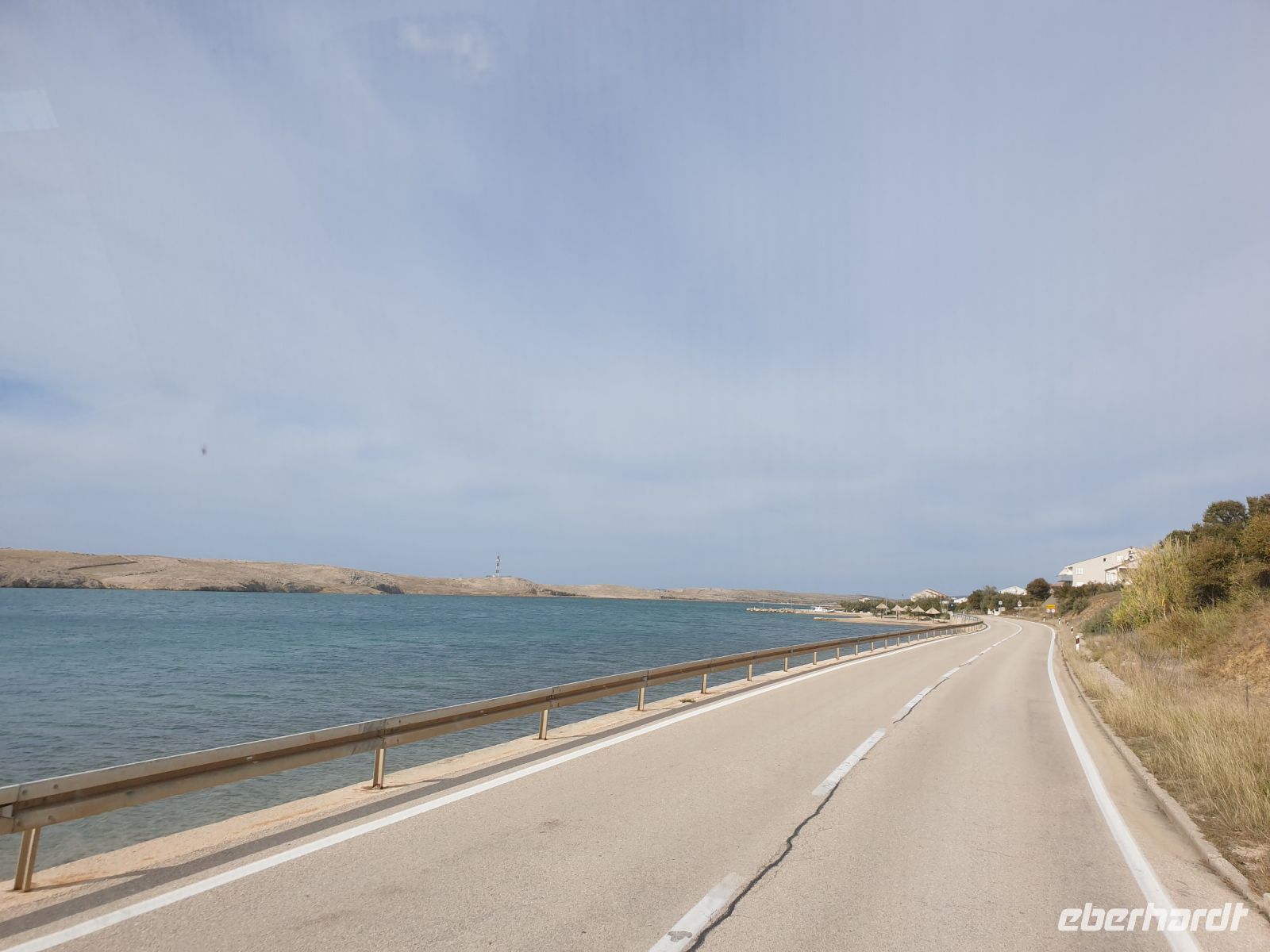 Heute ein sonniger, vor allem aber windstiller, borafreier Tag. Die bis gestern wetterbedingt gesperrte Pager Brücke ist wieder geöffnet, ermöglicht uns so einen Ausflug auf die Insel.