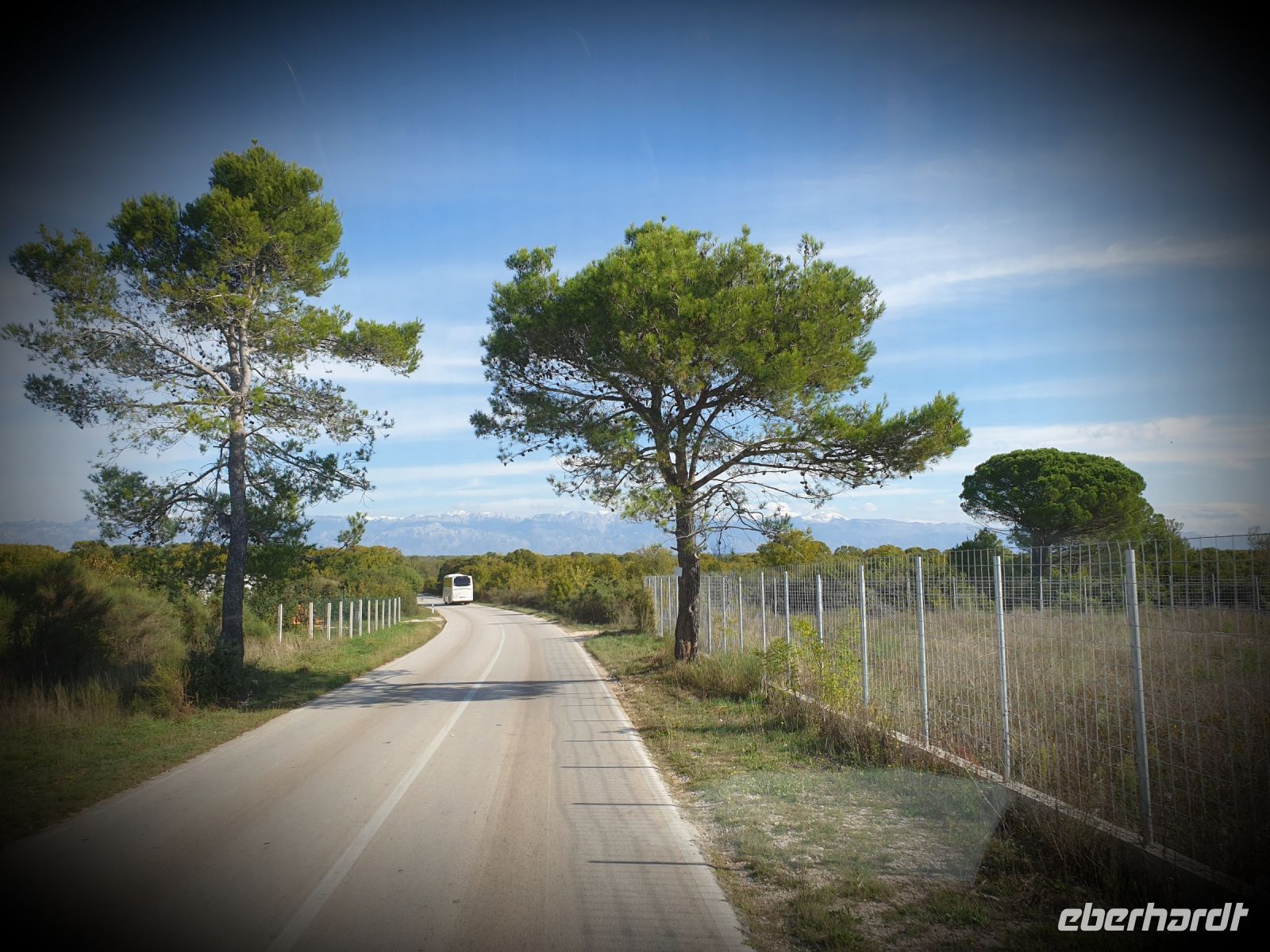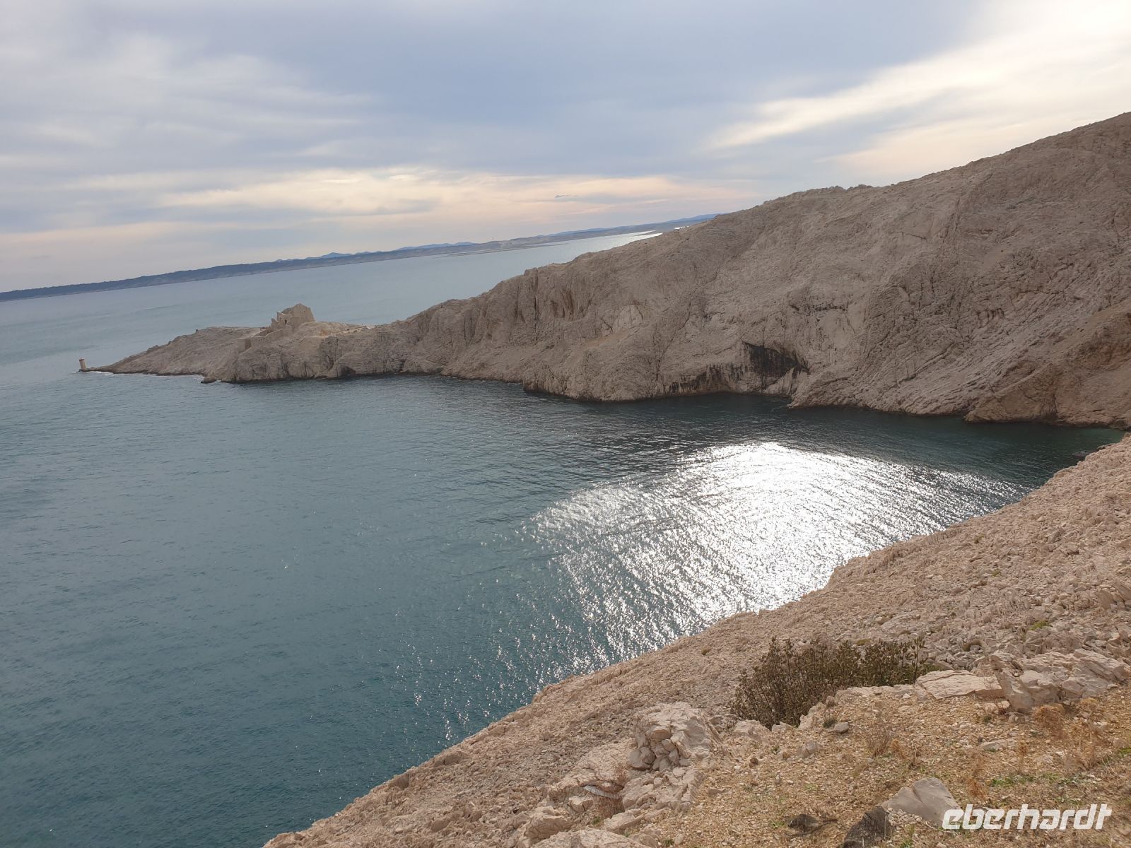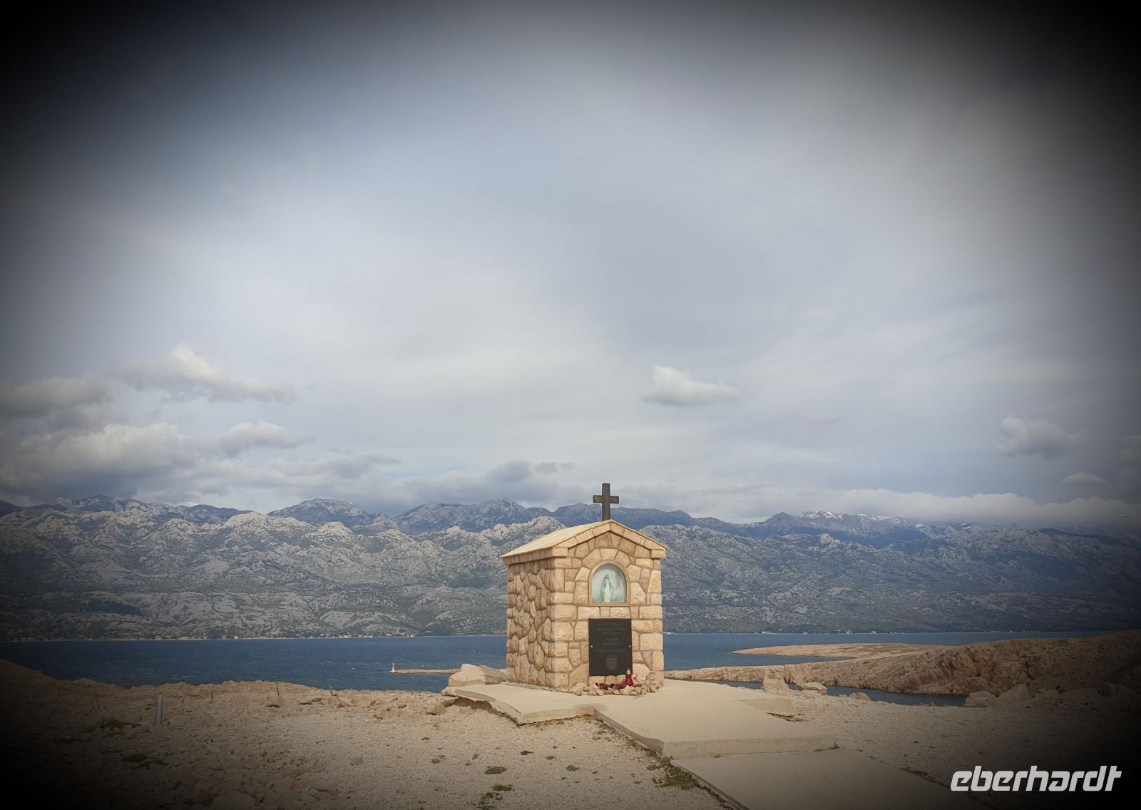 Heute ein sonniger, vor allem aber windstiller, borafreier Tag. Die bis gestern wetterbedingt gesperrte Pager Brücke ist wieder geöffnet, ermöglicht uns so einen Ausflug auf die Insel.
