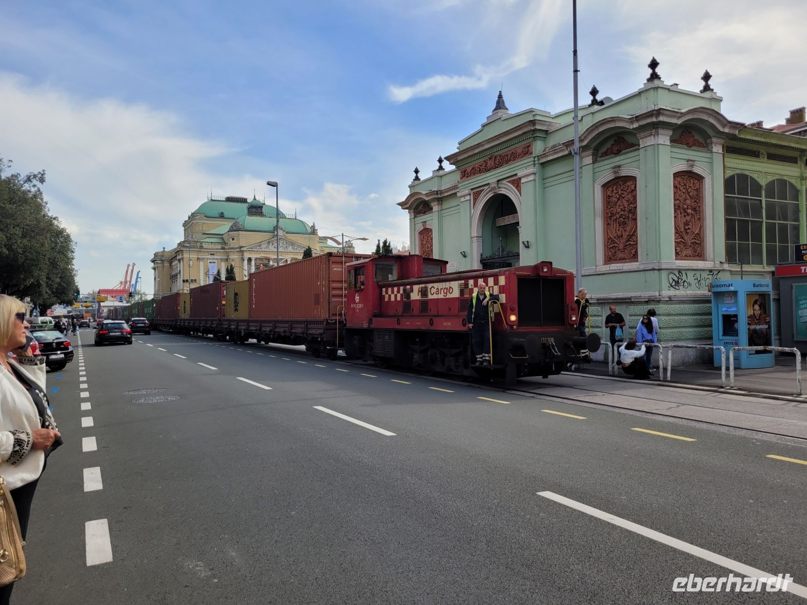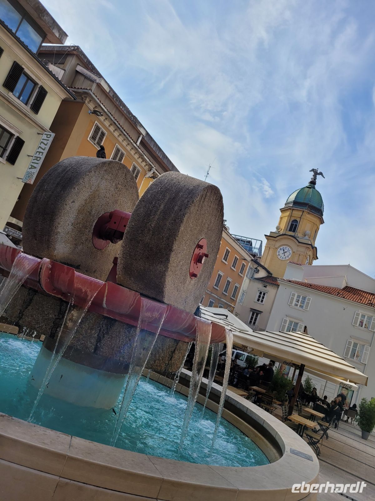 In Rijeka angekommen zunächst eine orientierende Rundfahrt. Der Hafen, den Zuckerpalast, den Wochenmarkt mit großem Freigelände und drei Markthallen erleben wir so. Vorbei am großen, architektonisch eindeutig von der k.u.k. Zeit geprägtem Theater gelangen wir zum Korzo; der Flaniermeile von Rijeka.