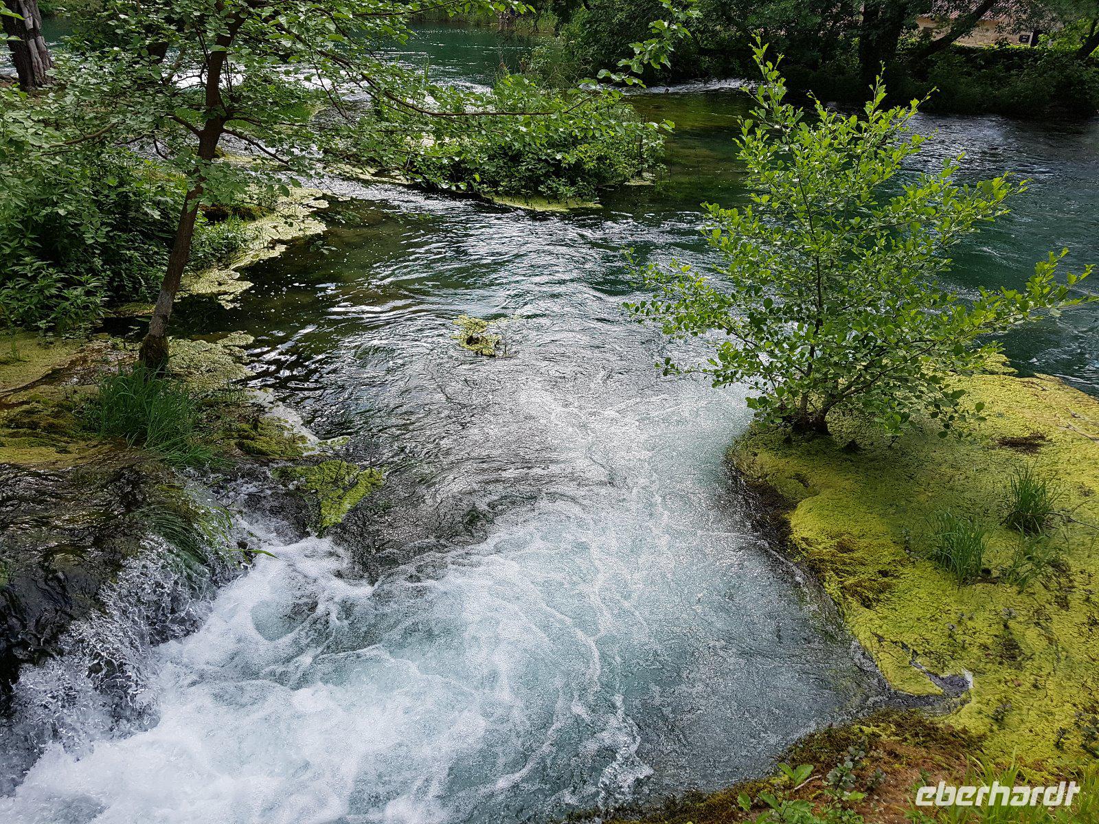 Die Krka fließt hier kilometerweit durch eine Schlucht und bildet auf dem Weg zum Meer sowie beim Durchbruch durch das Gestein zahlreiche Seen, Wasserfälle und Wildbäche.