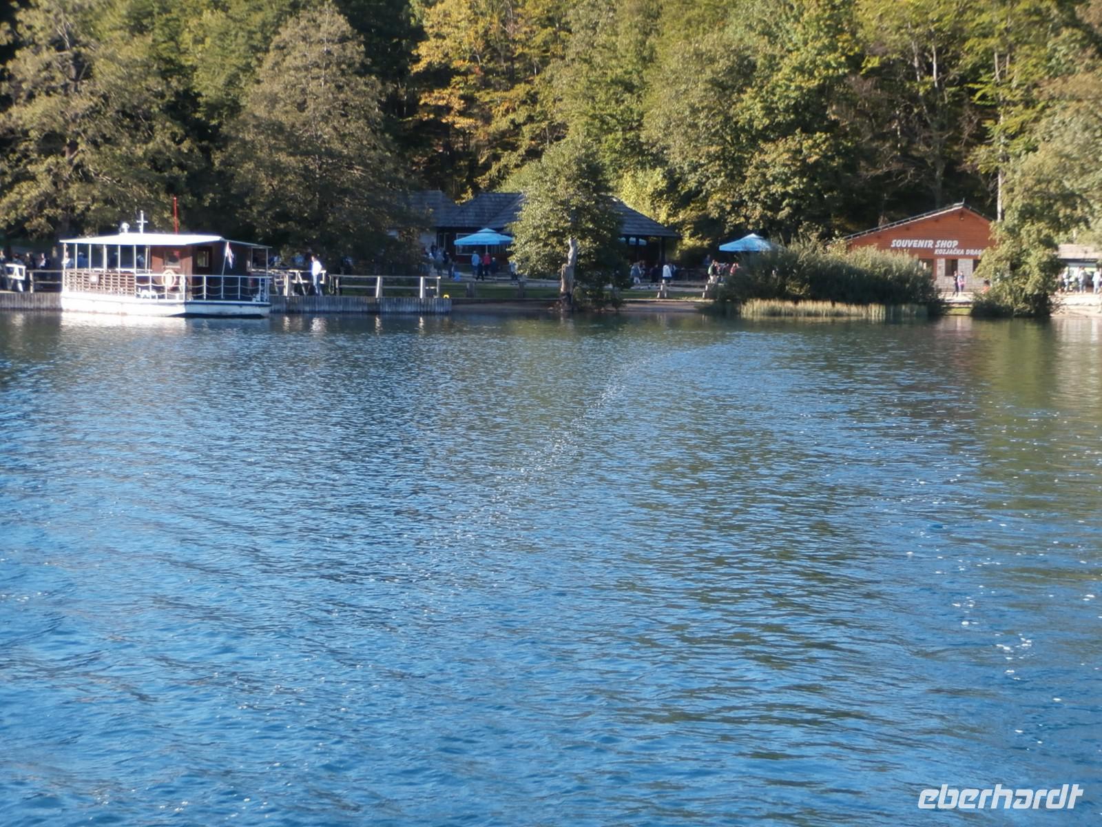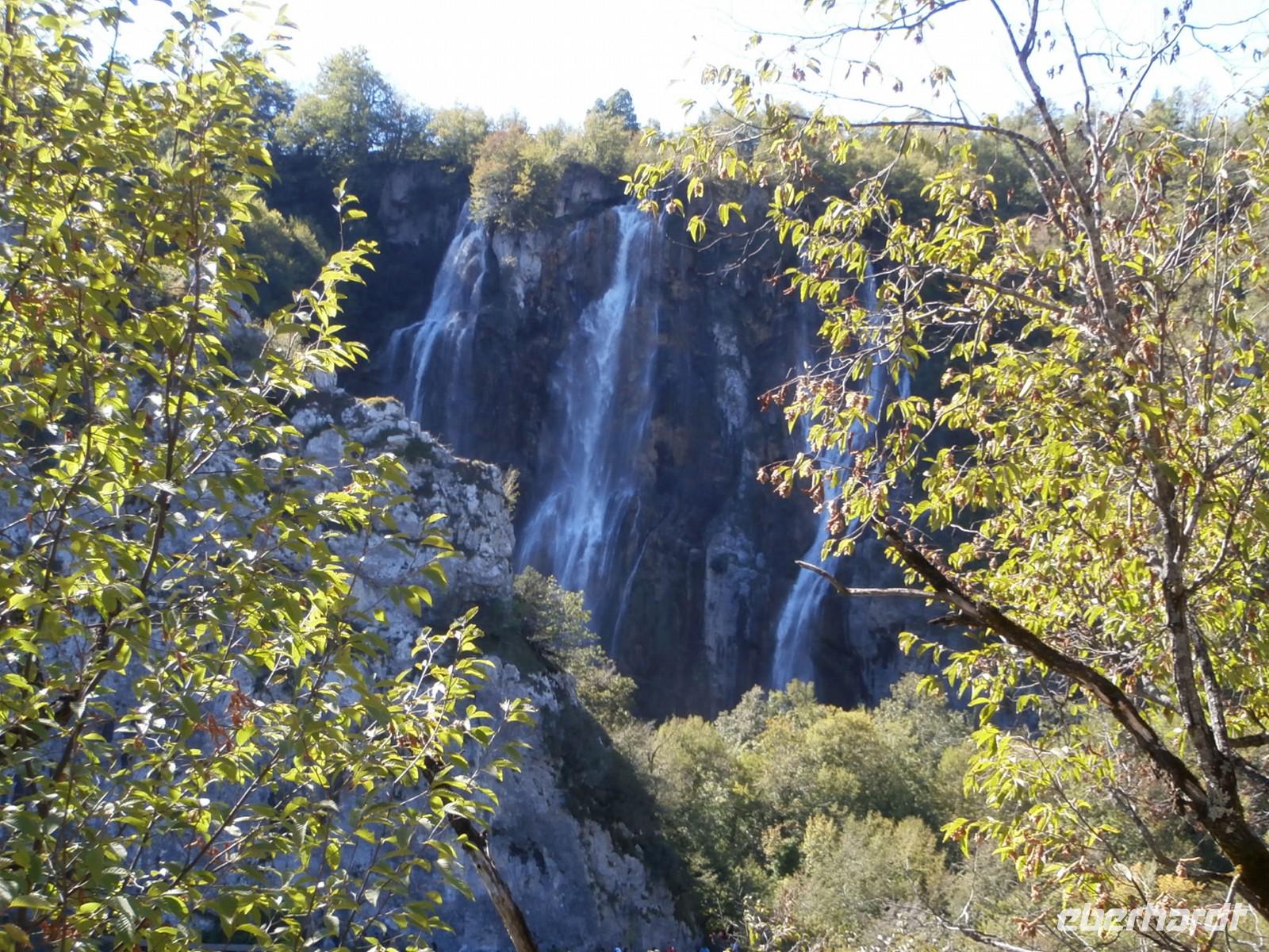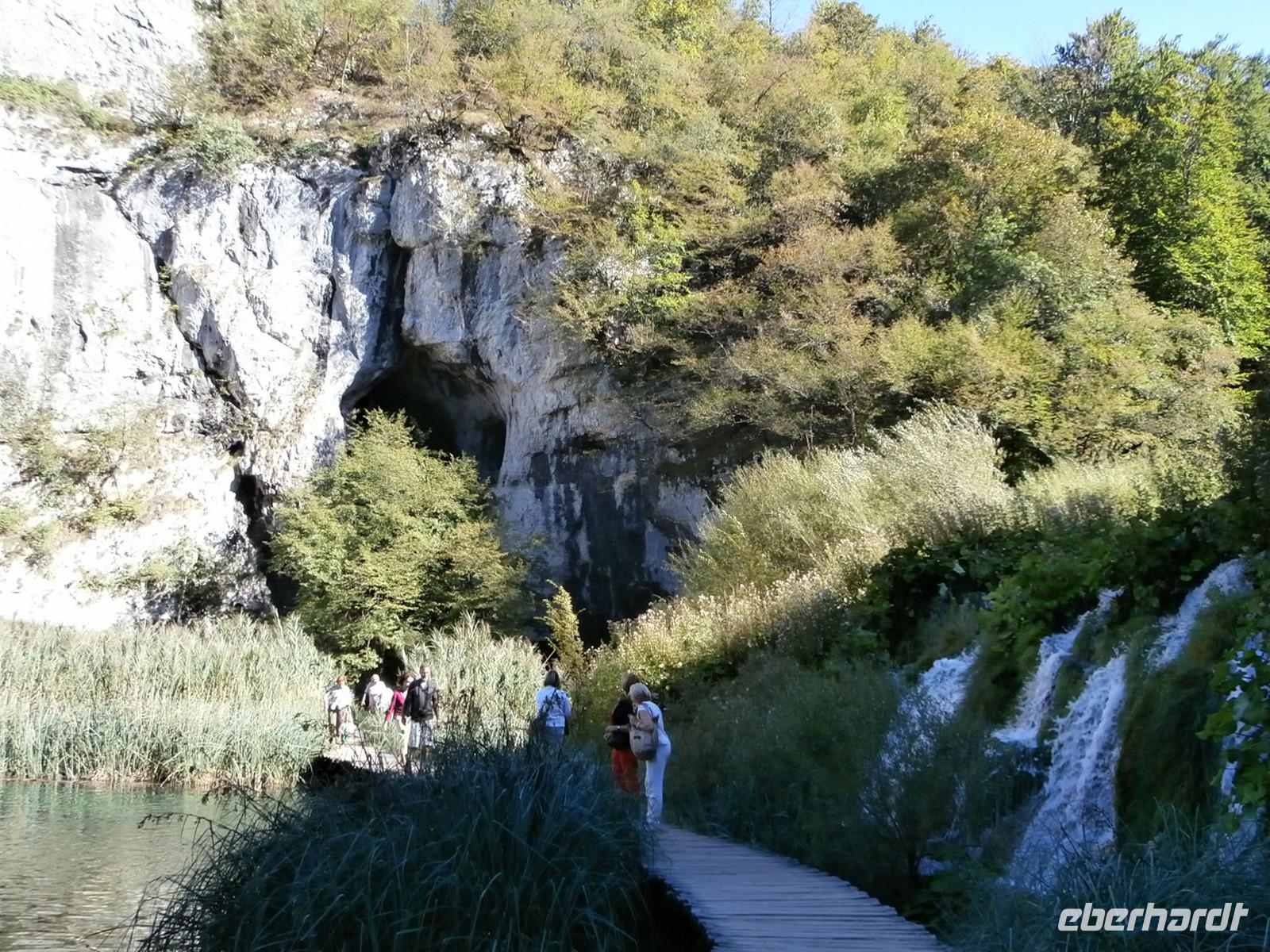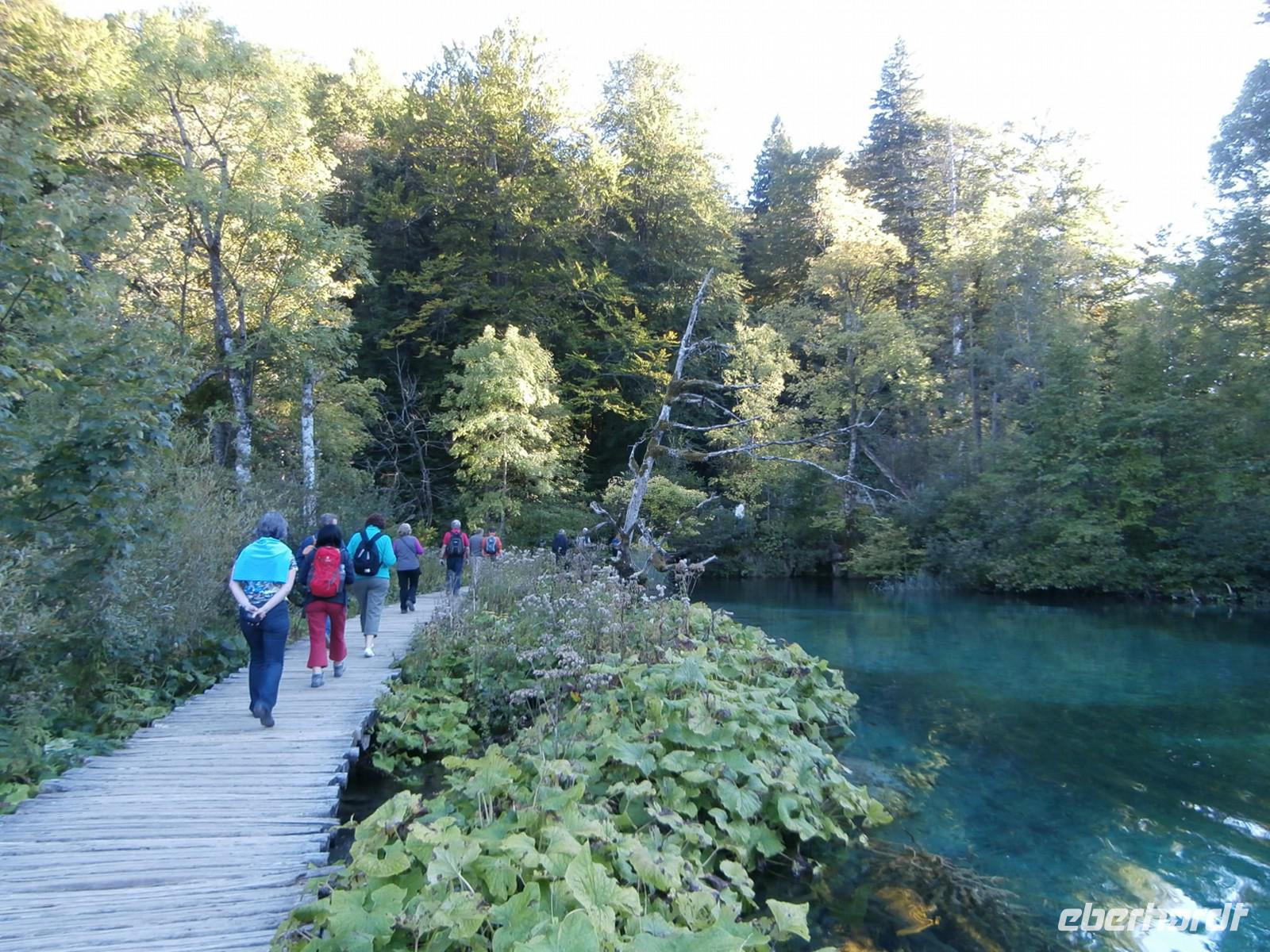 Heute Morgen werden wieder alle Koffer von Frank verladen und gut gelaunt reisen wir weiter. Für kurze Zeit fahren wir ganz nah entlang der Grenze zu Ungarn, in Mursko Sredisce reisen wir in Kroatien ein, unsere Fahrt geht vorbei an Varazdin und durch das sanfte Hügelland der Hrvatske Zagorje. Mit azurblauen Himmel und Sonne erreichen wir am Nachmittag unser Hotel Jezero in Plitvice. Nach kurzer Frischepause begeben wir uns auf eine abenteuerliche Wanderung mit Benutzung von Bus und Schiff, auf den Spuren der Karl-May-Helden. Die Filme wurden in den 1960er Jahren hier im Nationalpark in der phantastischen Naturkulisse gedreht. Auf dem Rundwanderweg gehen wir über Holzstege, kommen in Serpentinen nach unten zum grün leuchtenden Koluderovac Jezero, er war im Film der Silbersee. Über Knüppeldämme queren wir so einige Seen im Park, sehen viele Wasserfälle, unter ihnen einer 78 Meter hoch. Hier nehmen wir unser Gruppenfoto auf. Dann geht's aufwärts weiter, vorbei an der Schatzhöhle und weiteren Seen, die alle höher liegen, ihr Wasser ergießt sich in schäumenden Kaskaden. Nach einer Rast besteigen wir das Elektroboot und fahren zum anderen Ufer, von wo aus weiter bei leicht einsetzender Laubfärbung gewandert wird. Begeistert kehren wir zum Hotel zurück und treffen uns zum Abendessen im Restaurant.