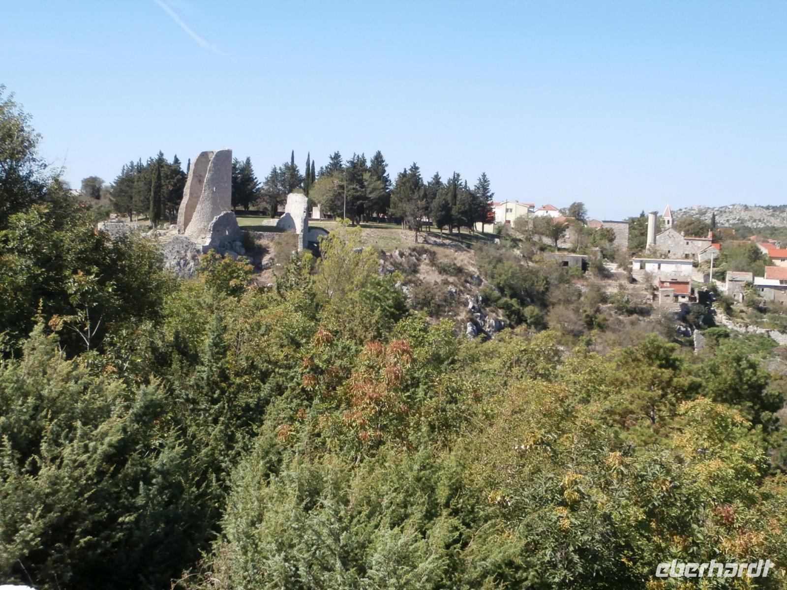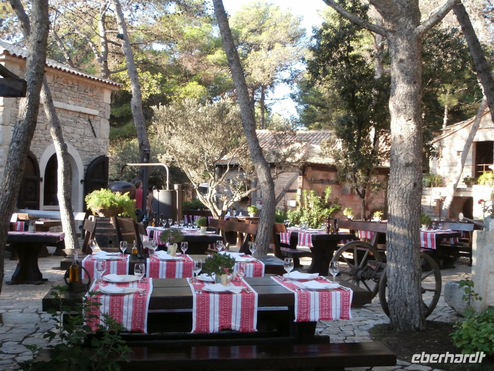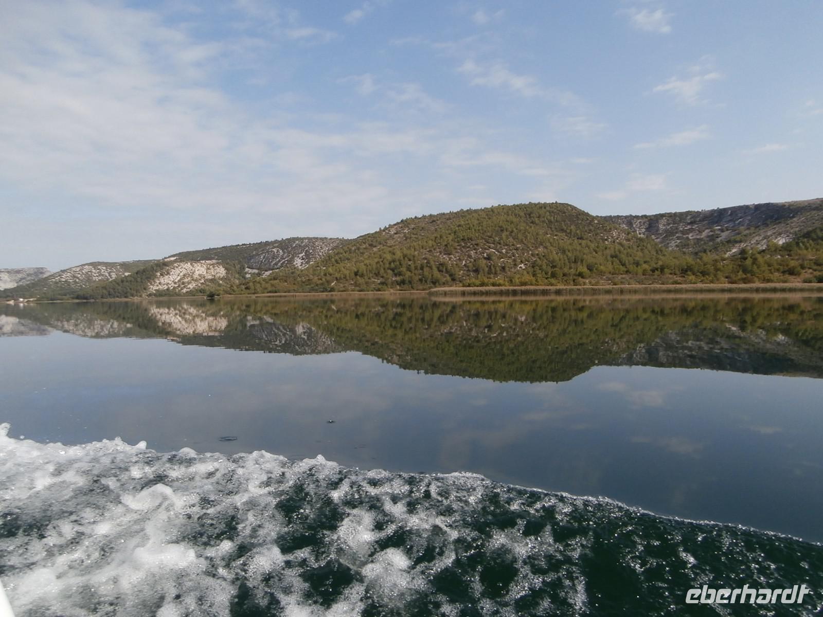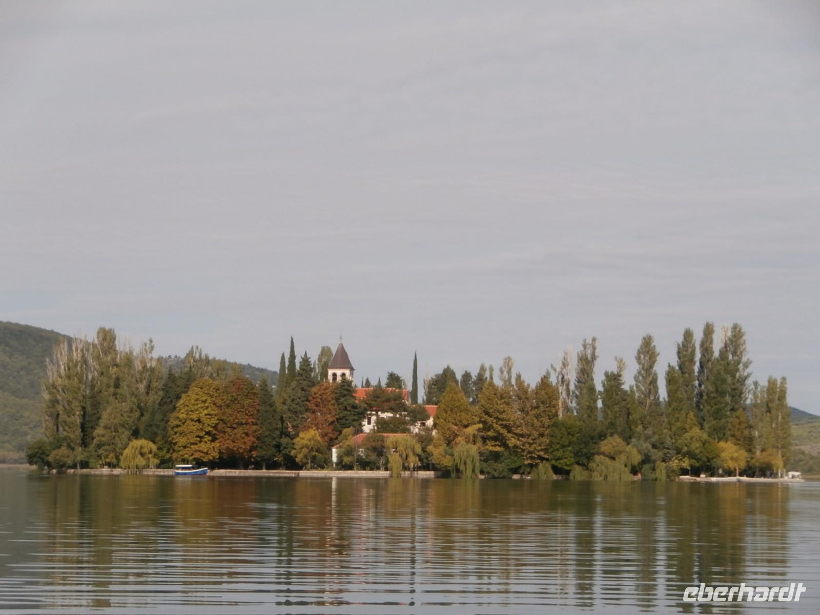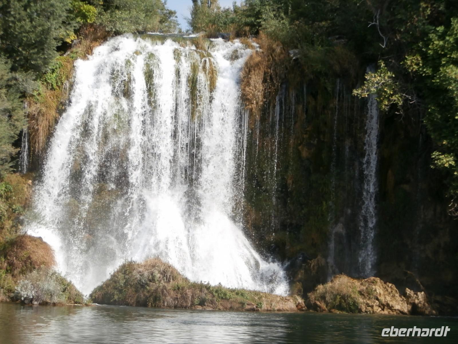 Mit dem Bus fahren wir die Serpentinenstrecke hinunter, es eröffnet sich uns ein toller Blick auf das blaue Wasser der Krka. Wir verlassen unseren Bus, laufen zur Bootsanlegestelle und begeben uns auf große Fahrt mit einem kleinen Schiff zum Roski Slap. Zwischen ihm und dem Skradinski buk, die zwei schönsten Wasserfälle im Park, steht auf der Insel Visovac ein Franziskanerkloster. Bei einer Führung sehen und hören wir viel von der fleißigen Arbeit der Mönche, die im Laufe der Jahrhunderte den über dem Wasser ragenden steinernen Felsen in eine Insel voller grüner Bäume, Obst und bunter Blumen verwandelt haben. Wir setzen unsere Fahrt mit dem Boot zum Roski slap fort, dort geht's auf einen kleinen Landgang mit anschließenden typisch kroatischen Essen beim Bauern Ante und seinem Sohn. Mit selbst hergestellten Schinken, Käse und Rotwein. werden wir verwöhnt und als Krönung lädt uns der Hausherr zur Schnapsverkostung ein. Der köstliche Rotwein, mit dem wir auf viele schöne Erlebnisse anstoßen, schmeckt vorzüglich. Gut gelaunt und gestärkt gehen wir singend an Bord. Wir laufen auf einem Rundwanderweg um den Skradinski buk, dem spektakulärsten Wasserfall im Park. Am Nachmittag holt uns Frank mit dem Bus wieder ab und weiter geht die Fahrt nach Starigrad Paklenica zum Hotel Vicko, hier bleiben wir für drei Nächte.