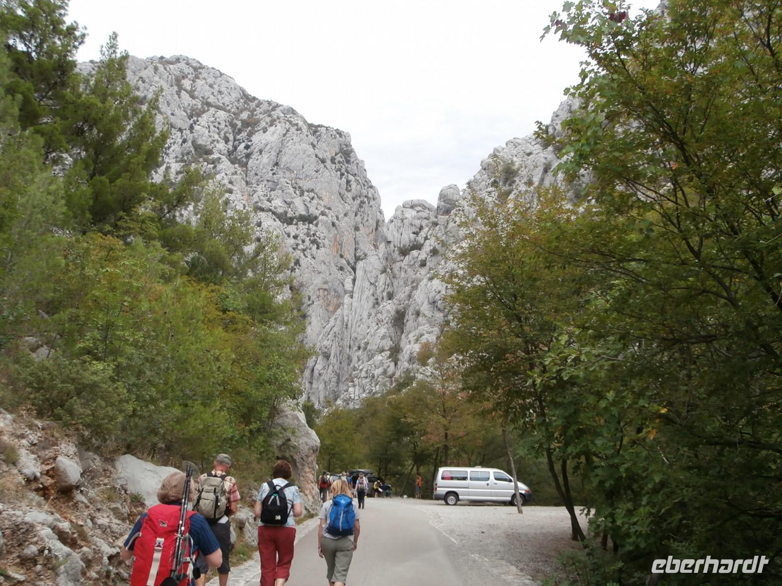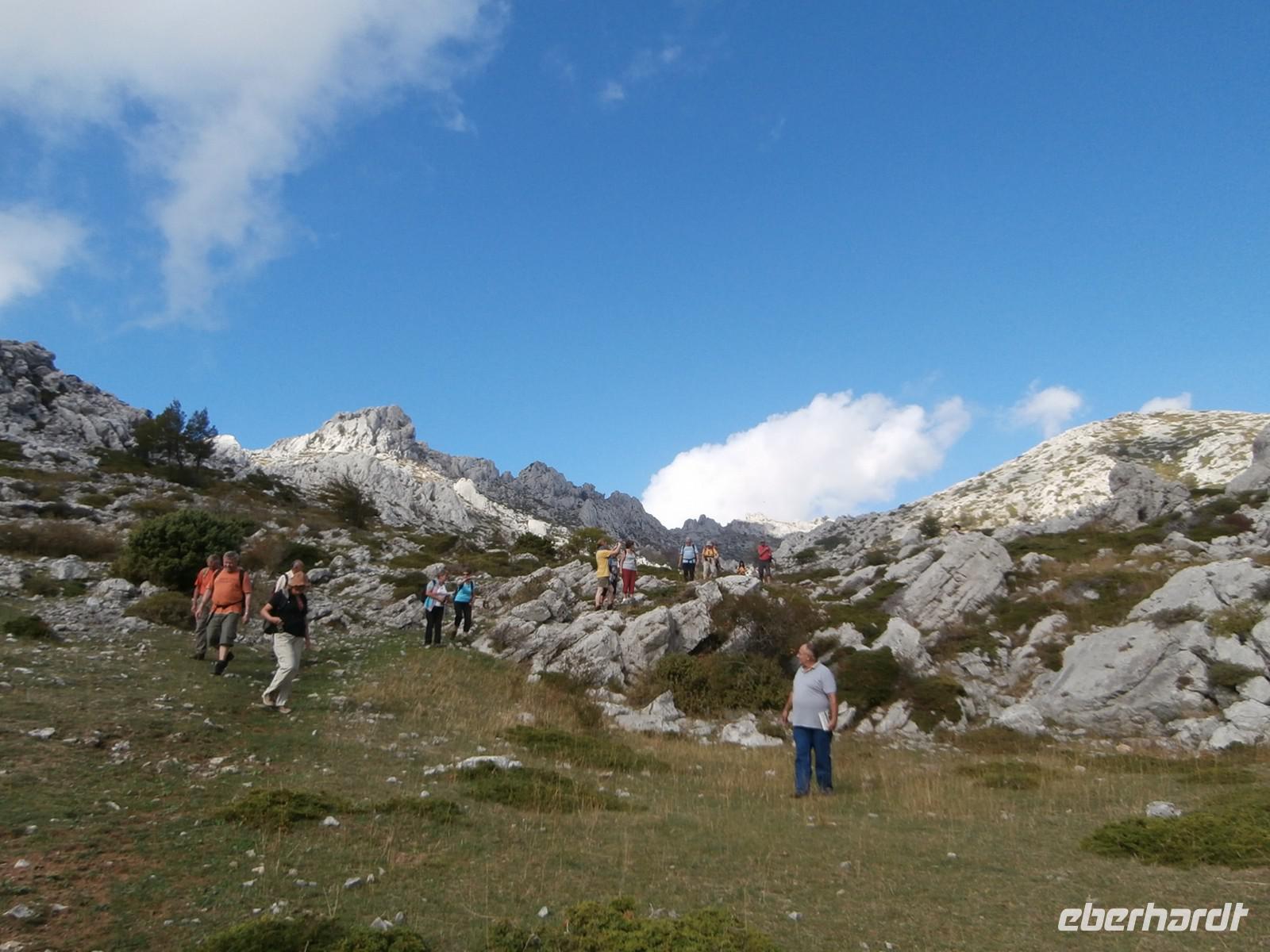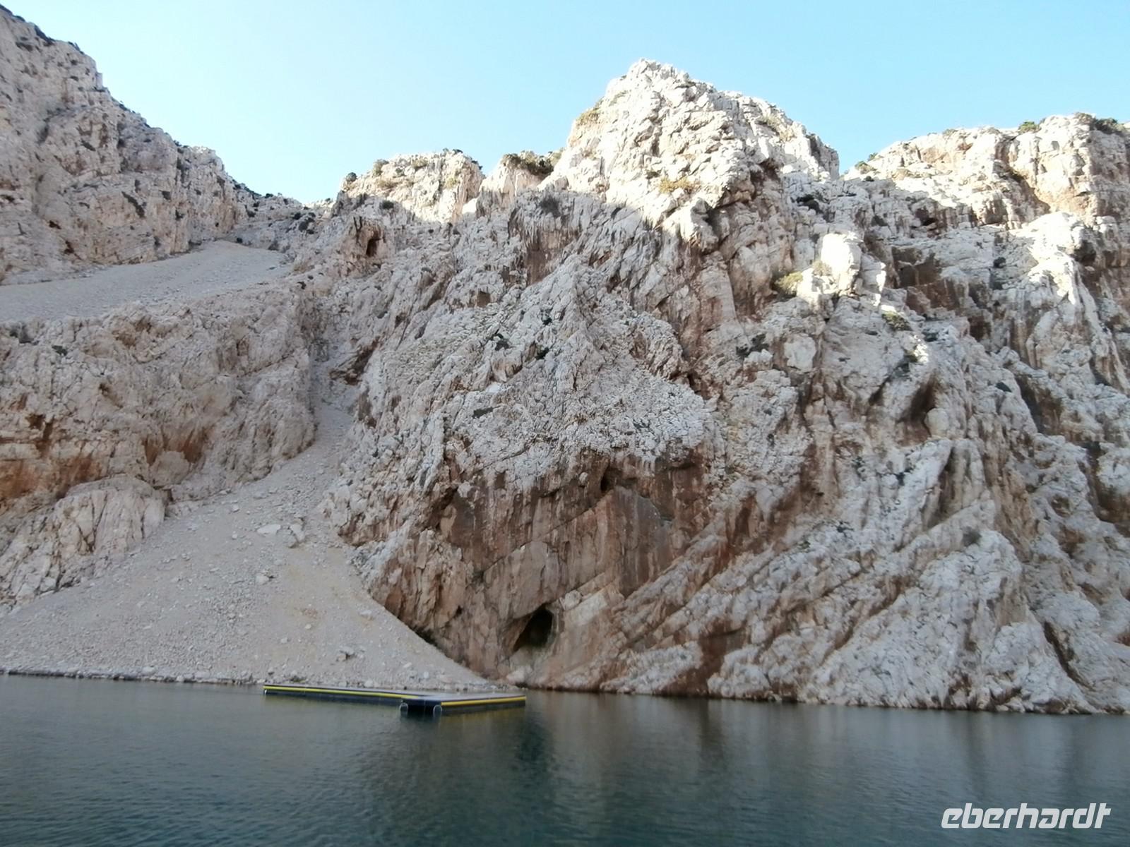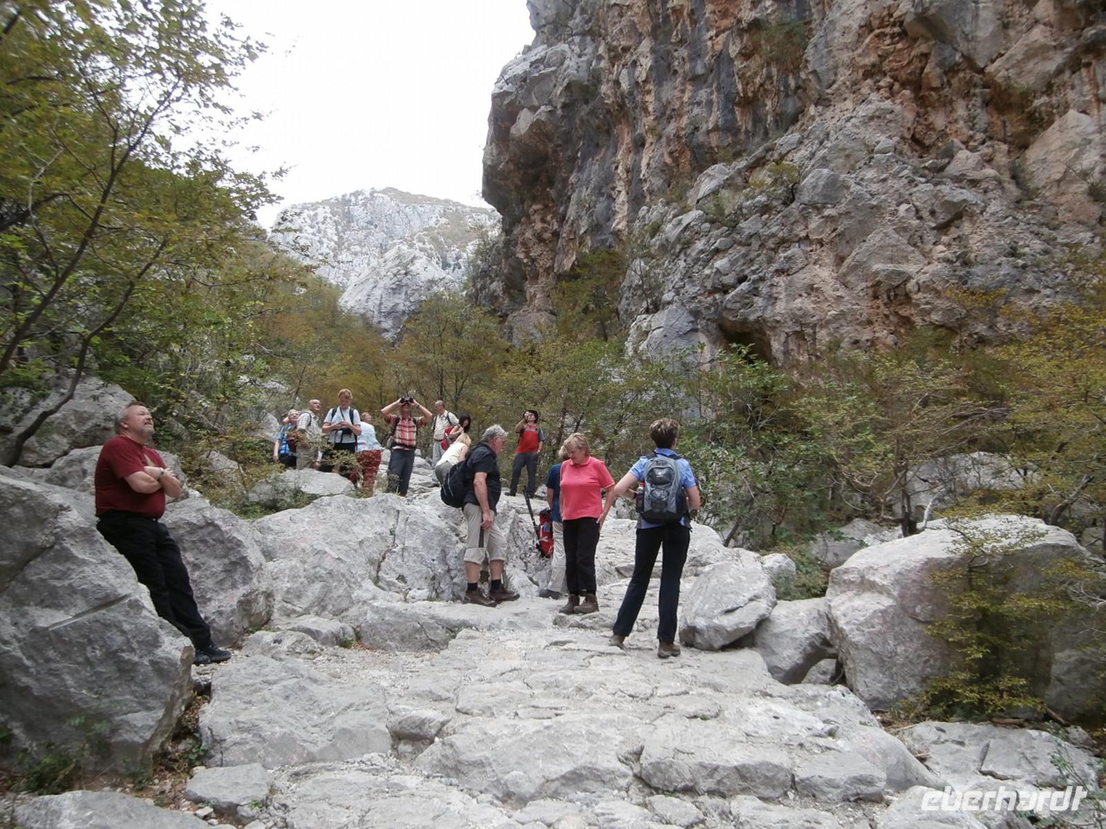 Paklenica erhielt seinen Namen vom Schwarzkieferharz, der wird Paklina" genannt und findet Verwendung beim Bestreichen der Schiffe. Zum Eingang im Nationalpark wandern wir heute direkt ab Hotel und gehen gemeinsam bis zum Eingang. Ich kaufe die Tickets und treffe unseren örtl. Reiseleiter Ante, der schon ein alter Bekannter ist. Mit einführenden Worten und vielen Erklärungen marschieren wir los. Es gibt die große und kleine Paklenica im seit 1978 unter Naturschutz stehenden Park und wir wandern und klettern teilweise durch die große Paklenica Schlucht. Immer wieder sehen wir an den steilen Felswänden Kletterer. Ein halbes Jahrhundert Tradition im Bereich des Alpinismus und Sportkletterns kann Paklenica vorweisen. Auch Schauplatz für den Dreh zahlreicher Szenen der Filme um Winnetou ist die Schlucht Velika Paklenica. An der Berghütte angekommen können wir ein leckeres Picknick genießen, gegrillte Wurst mit Fladenbrot dazu bestellen wir uns Bier, Cola oder Kaffee. Viele Wanderfreunde gehen mit mir noch hoch zur anderen Hütte und weiter zum Ivancev Dom, hier werden wir herzlich empfangen und genießen guten Kaffee und schöne Aussicht. Begeistert vom Ausflug kehren wir später zum Hotel zurück. Bei Ankunft gibt es heute Aufruhr, es ist kein Wasser da, im Ort wurde die Hauptleitung bei Baumaßnahmen zerstört. Da wir gleich in Wassernähe wohnen, geht es für Viele von uns zur Abkühlung ins kalte Wasser des Velebitkanals. Mit Rotwein erleben wir so noch einen fantastischen Sonnenuntergang. Am Abend gibt es wieder ein schmackhaftes Essen mit Muscheln und Fisch. Wasser läuft später auch wieder durch die Leitung, welch ein Glück für uns alle.