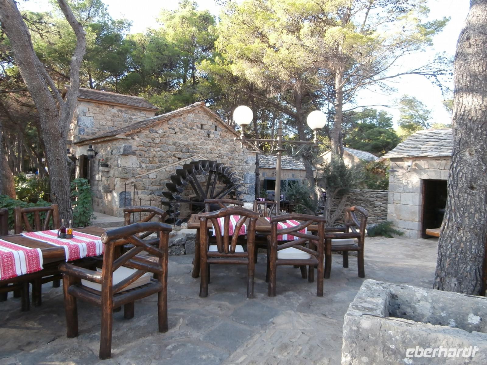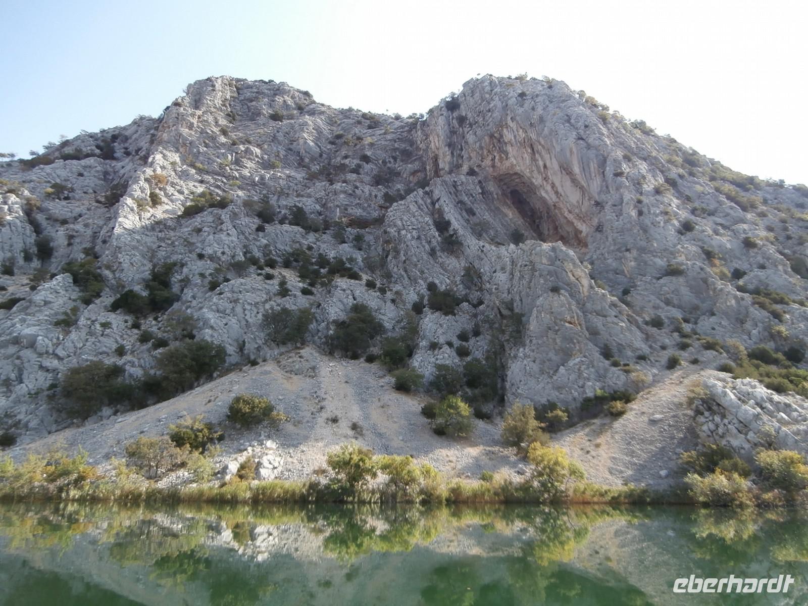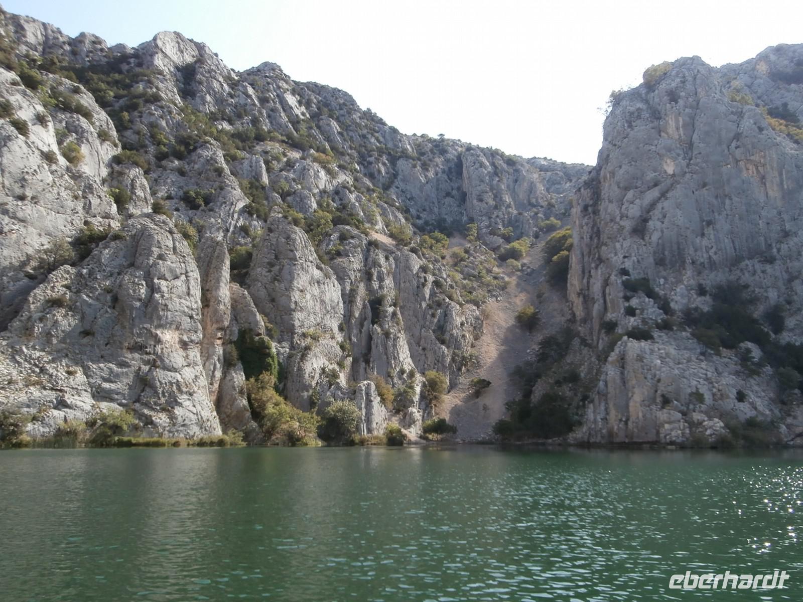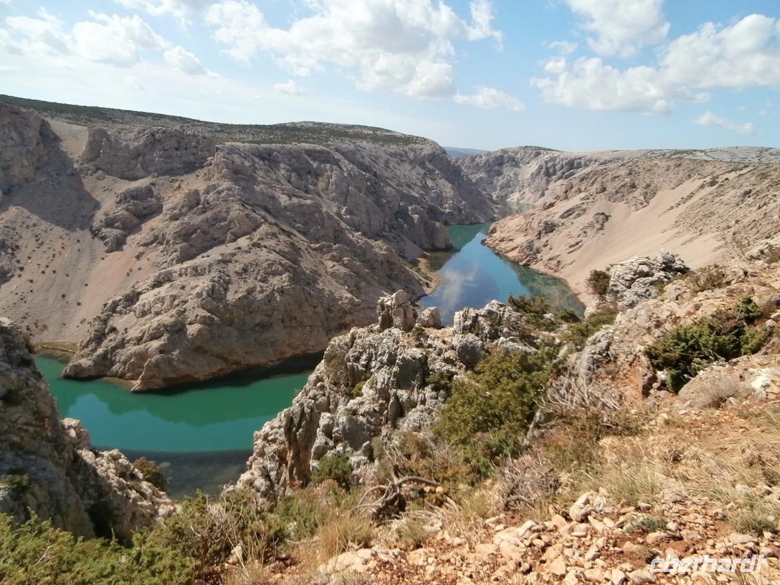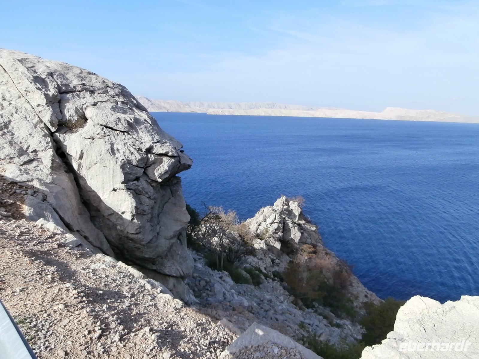 Paklenica erhielt seinen Namen vom Schwarzkieferharz, der wird Paklina" genannt und findet Verwendung beim Bestreichen der Schiffe. Zum Eingang im Nationalpark wandern wir heute direkt ab Hotel und gehen gemeinsam bis zum Eingang. Ich kaufe die Tickets und treffe unseren örtl. Reiseleiter Ante, der schon ein alter Bekannter ist. Mit einführenden Worten und vielen Erklärungen marschieren wir los. Es gibt die große und kleine Paklenica im seit 1978 unter Naturschutz stehenden Park und wir wandern und klettern teilweise durch die große Paklenica Schlucht. Immer wieder sehen wir an den steilen Felswänden Kletterer. Ein halbes Jahrhundert Tradition im Bereich des Alpinismus und Sportkletterns kann Paklenica vorweisen. Auch Schauplatz für den Dreh zahlreicher Szenen der Filme um Winnetou ist die Schlucht Velika Paklenica. An der Berghütte angekommen können wir ein leckeres Picknick genießen, gegrillte Wurst mit Fladenbrot dazu bestellen wir uns Bier, Cola oder Kaffee. Viele Wanderfreunde gehen mit mir noch hoch zur anderen Hütte und weiter zum Ivancev Dom, hier werden wir herzlich empfangen und genießen guten Kaffee und schöne Aussicht. Begeistert vom Ausflug kehren wir später zum Hotel zurück. Bei Ankunft gibt es heute Aufruhr, es ist kein Wasser da, im Ort wurde die Hauptleitung bei Baumaßnahmen zerstört. Da wir gleich in Wassernähe wohnen, geht es für Viele von uns zur Abkühlung ins kalte Wasser des Velebitkanals. Mit Rotwein erleben wir so noch einen fantastischen Sonnenuntergang. Am Abend gibt es wieder ein schmackhaftes Essen mit Muscheln und Fisch. Wasser läuft später auch wieder durch die Leitung, welch ein Glück für uns alle.