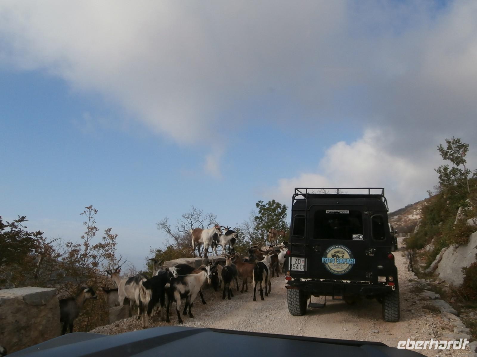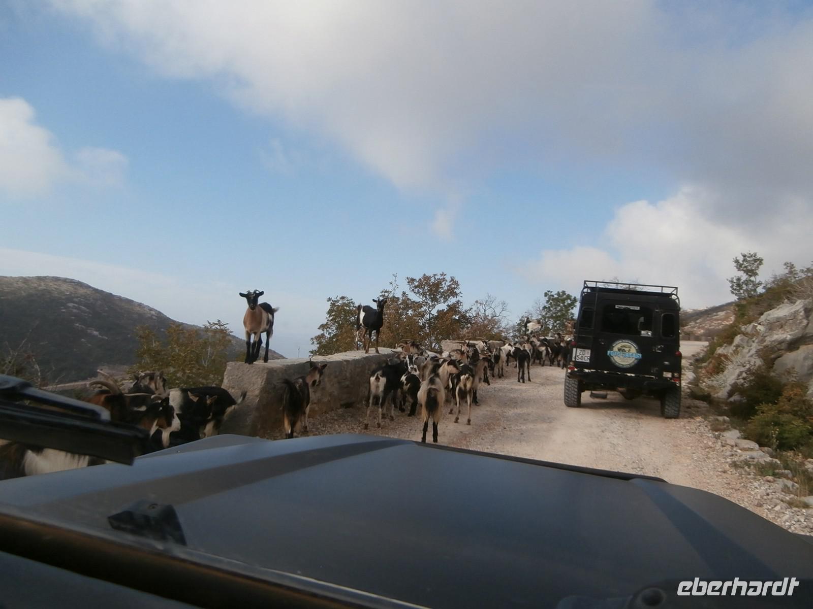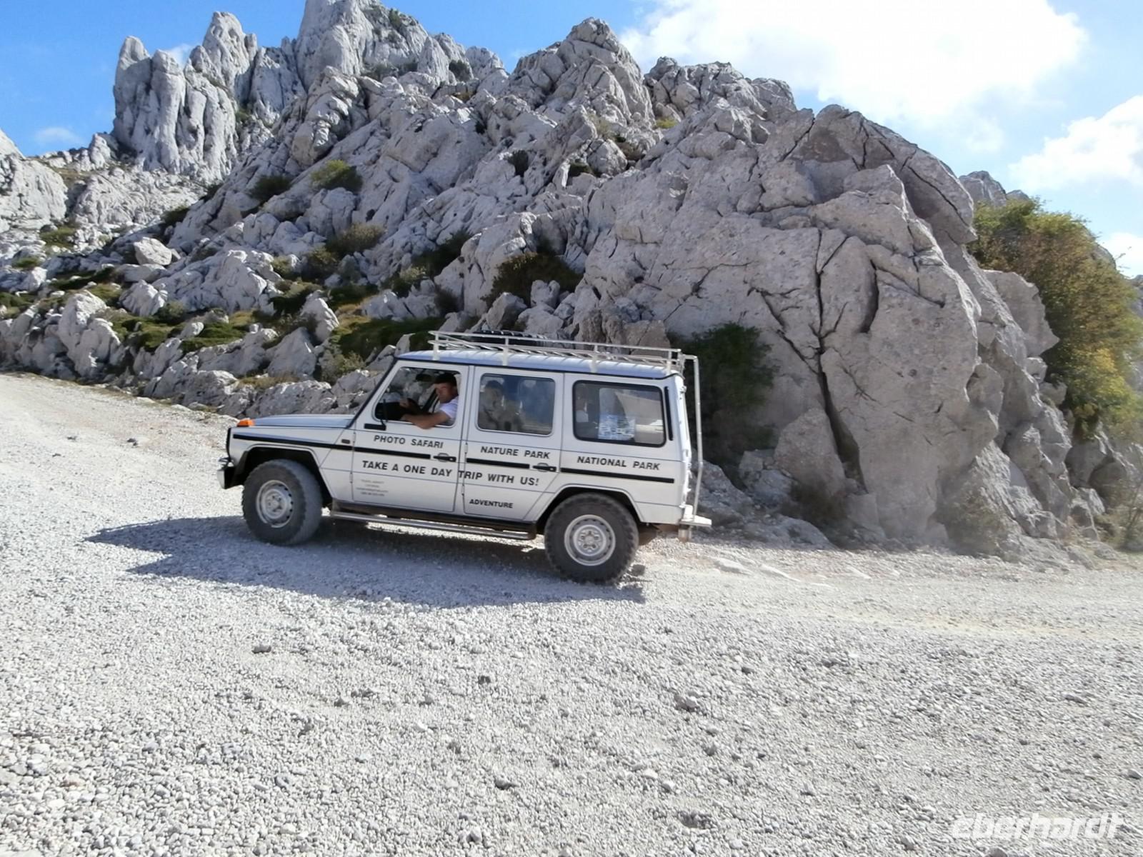 Mit unserem Bus fahren wir bis zur Kreuzung SV Rock / Obrovac. Hier stehen 3 Jeeps bereit und auch Ante und Marijana, unsere Reiseleiterin, erwarten uns hier. Unsere 4 Busgäste starten mit Frank und Reiseleitung zur Stadterkundung nach Zadar. Wir verteilen uns auf die Jeeps und starten die Abenteuerfahrt hinauf zur Felsformation Tulove Grete. Später steigen wir aus und wandern auf der alten Straße zum Plateau. Es gibt von unserer Reiseleitung Informationen zur Umgebung und zu Zadar. Zu den Gräbern am Mali Alan wandern wir auch. Viele Winnetou Filme wie: Winnetou Teil 1 und Teil 3, Unter Geiern, Old Surehand und Winnetou und das Halbblut Apanatschi wurden hier aufgenommen. Vor den 2 Steingräbern aus den Winnetou Filmen bleiben wir stehen und fotografieren. In der Karl May Fan Box hinter einer Mauer verewigen wir uns mit einem Eintrag im Fan Buch. Wir verlassen zu Fuß begeistert das Indianerland, begeben uns später zu den Jeeps. Im Auto geht es hinunter und weiter zum Pueblo, auch Schauplatz der Filmaufnahmen. Wir genießen noch einen schönen Blick hinunter in den Canyon der Zrmanja, auf diesem Fluss haben wir am Nachmittag unsere Bootstour. Wir fahren bis Obrovac, hier warten wir bei Kaffee und Bier auf unsere Zadar Gäste, gemeinsam fahren wir weiter nach Krusevo, wo auf uns ein zünftiges Mittagsmahl wartet. In geselliger Runde genießen wir einen opulenten Grillteller mit Salat, als Vorspeise lassen wir uns Käse und Schinken schmecken. Gestärkt geht es zur Bootstour auf dem Zrmanja Fluss. Im Film ist der Fluss der Rio Pecos, an diesem Ort befand sich das Indianer-Pueblo. Ein Tag auf den Spuren der Karl May Filme findet wieder mit einem sehr guten Abendessen seinen Abschluss.
