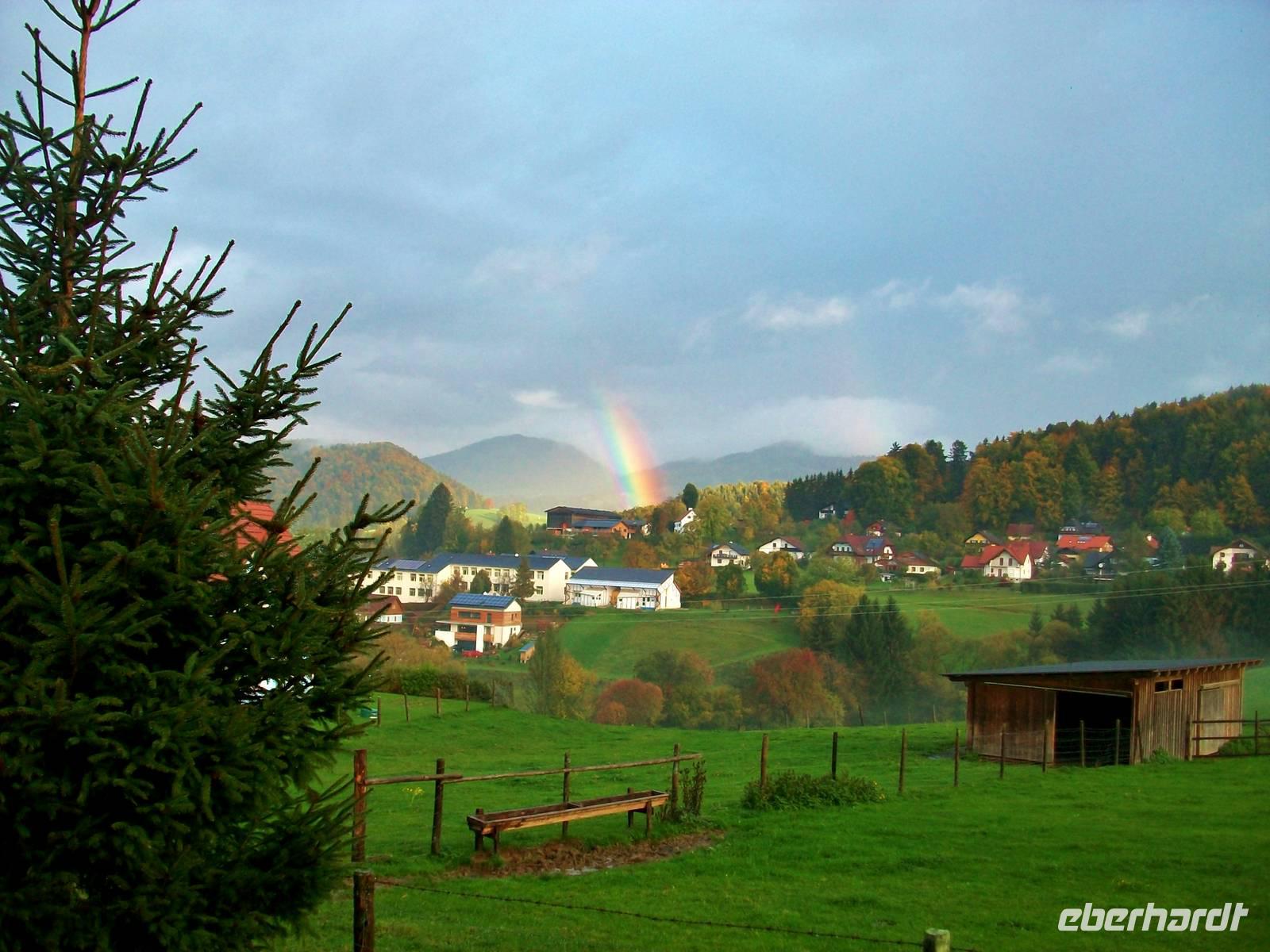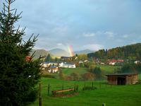 Kurz nach halb neun brechen wir auf; leichter Regen fällt, aber die Sonne hat durchaus ihre Chance und malt uns einen schönen Regenbogen vor die Berge die östlich von Semriach liegen.