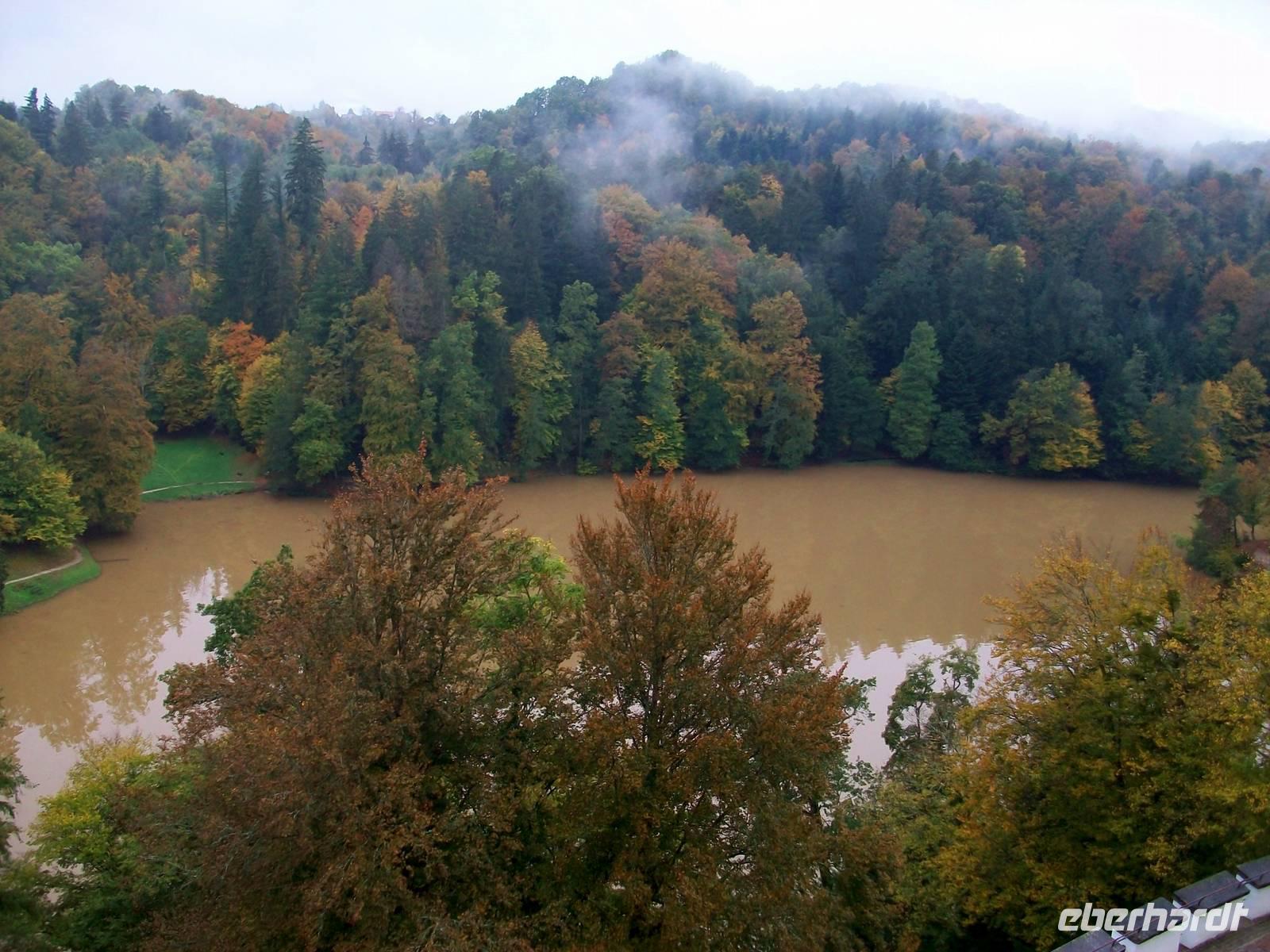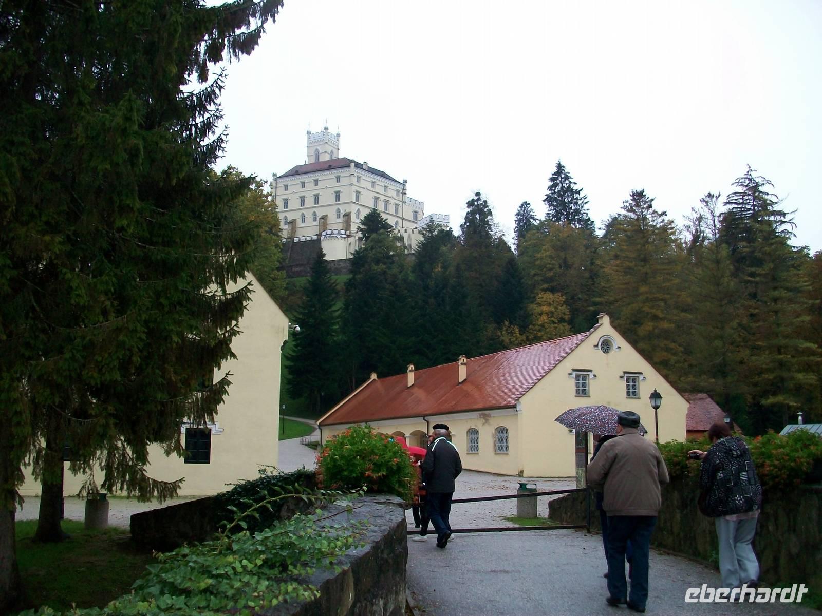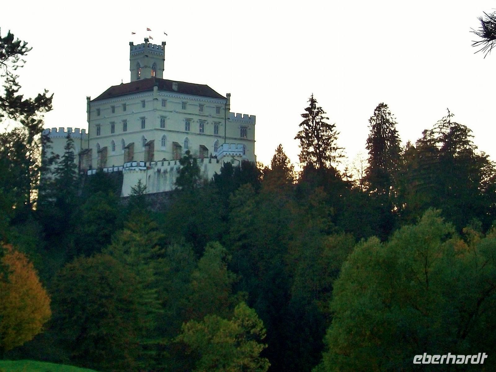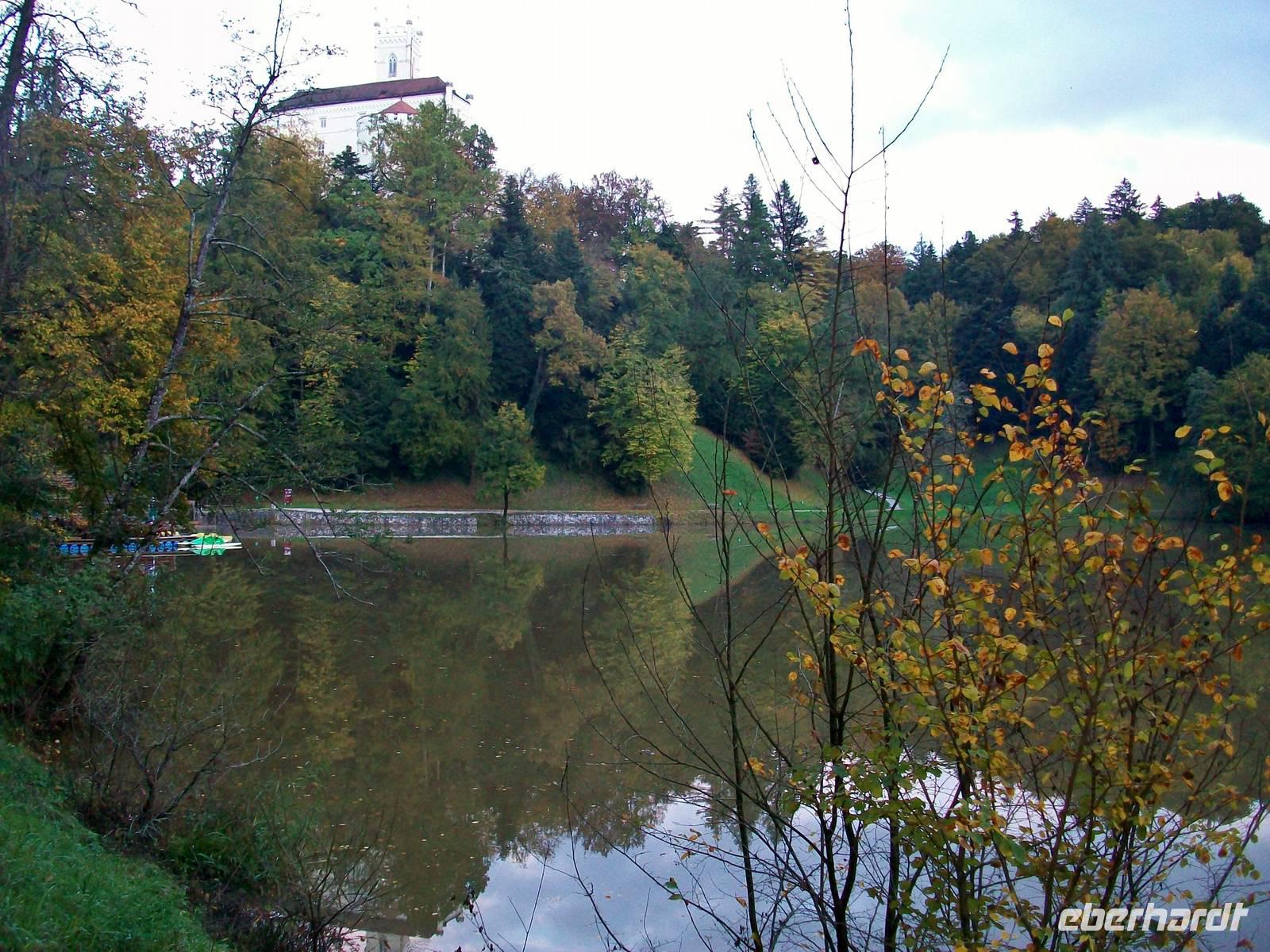 Ein leichter Regen begleitet uns auf dem Fußweg hinauf zum Schloss. Viele Sagen ranken sich um diesen Hügel den zu Urzeiten feuerspeiende Drachen umflogen haben sollen, deshalb heißt das Anwesen auch zu Deutsch „Drachenstein". Wir gewinnen langsam an Höhe und auf dem Weg sehen wir wie schön der Ort gelegen ist. Überall Wald, die Blätter an den Bäumen tragen schon bunt- herbstlichen Schmuck und unten im Tal sehen wir den romantischen See der den Schlosshügel umgibt.