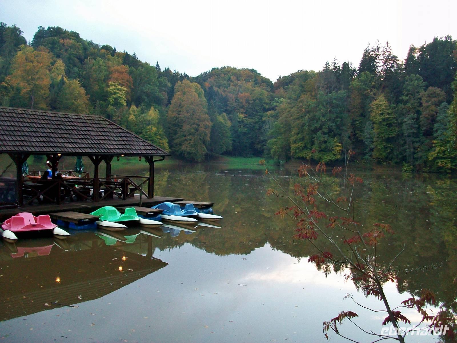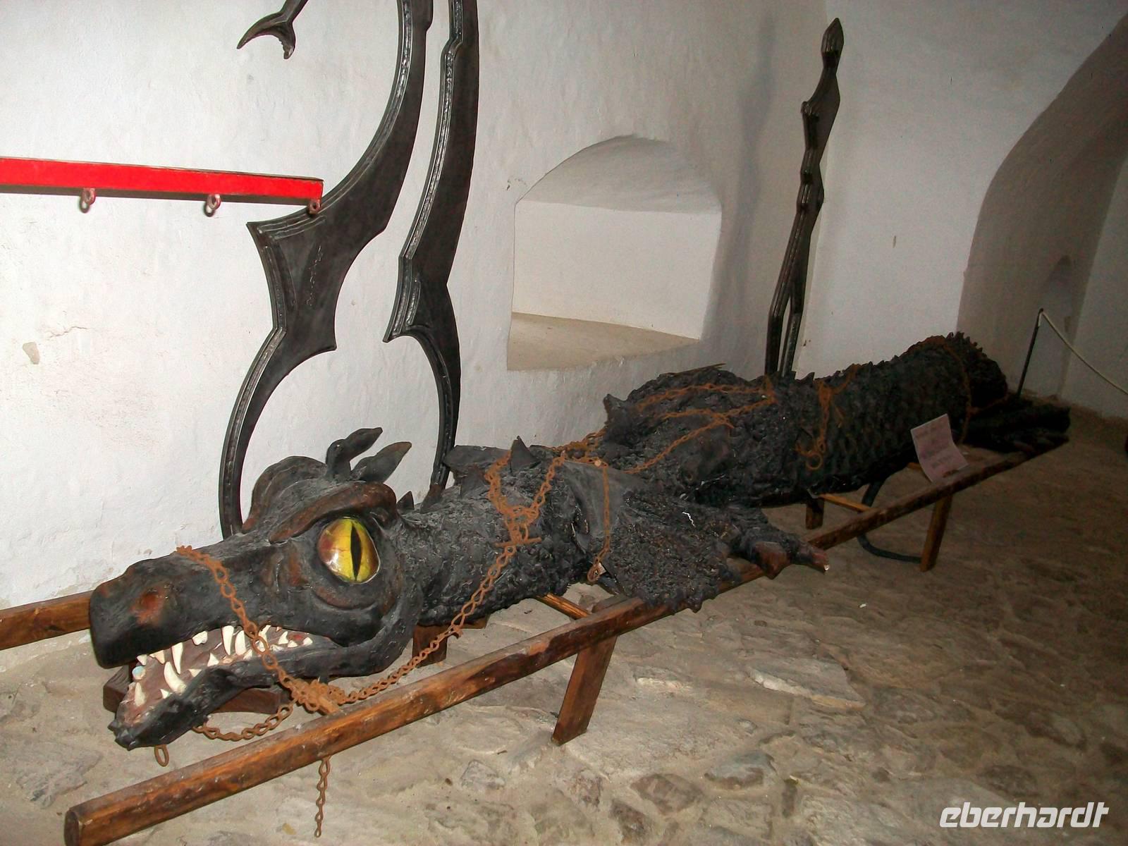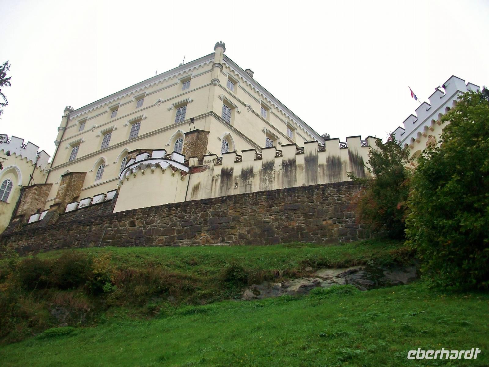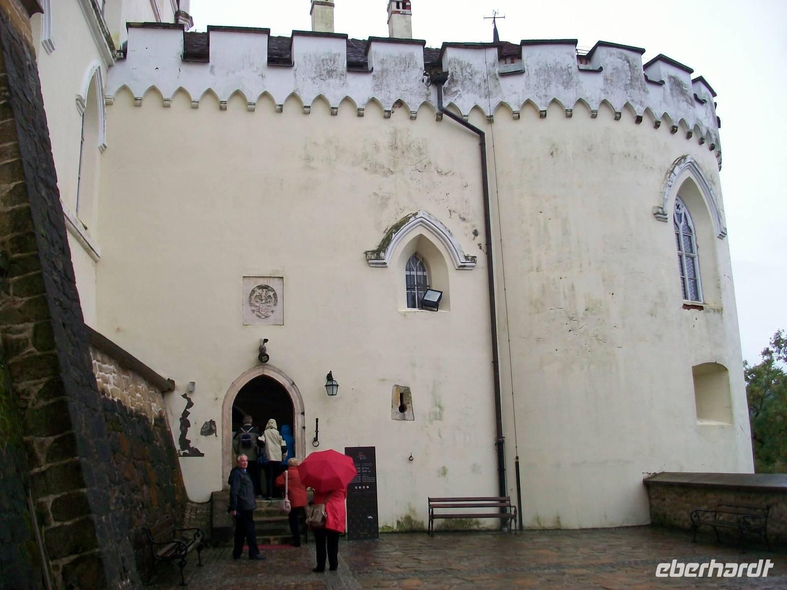 Ein leichter Regen begleitet uns auf dem Fußweg hinauf zum Schloss. Viele Sagen ranken sich um diesen Hügel den zu Urzeiten feuerspeiende Drachen umflogen haben sollen, deshalb heißt das Anwesen auch zu Deutsch „Drachenstein". Wir gewinnen langsam an Höhe und auf dem Weg sehen wir wie schön der Ort gelegen ist. Überall Wald, die Blätter an den Bäumen tragen schon bunt- herbstlichen Schmuck und unten im Tal sehen wir den romantischen See der den Schlosshügel umgibt.