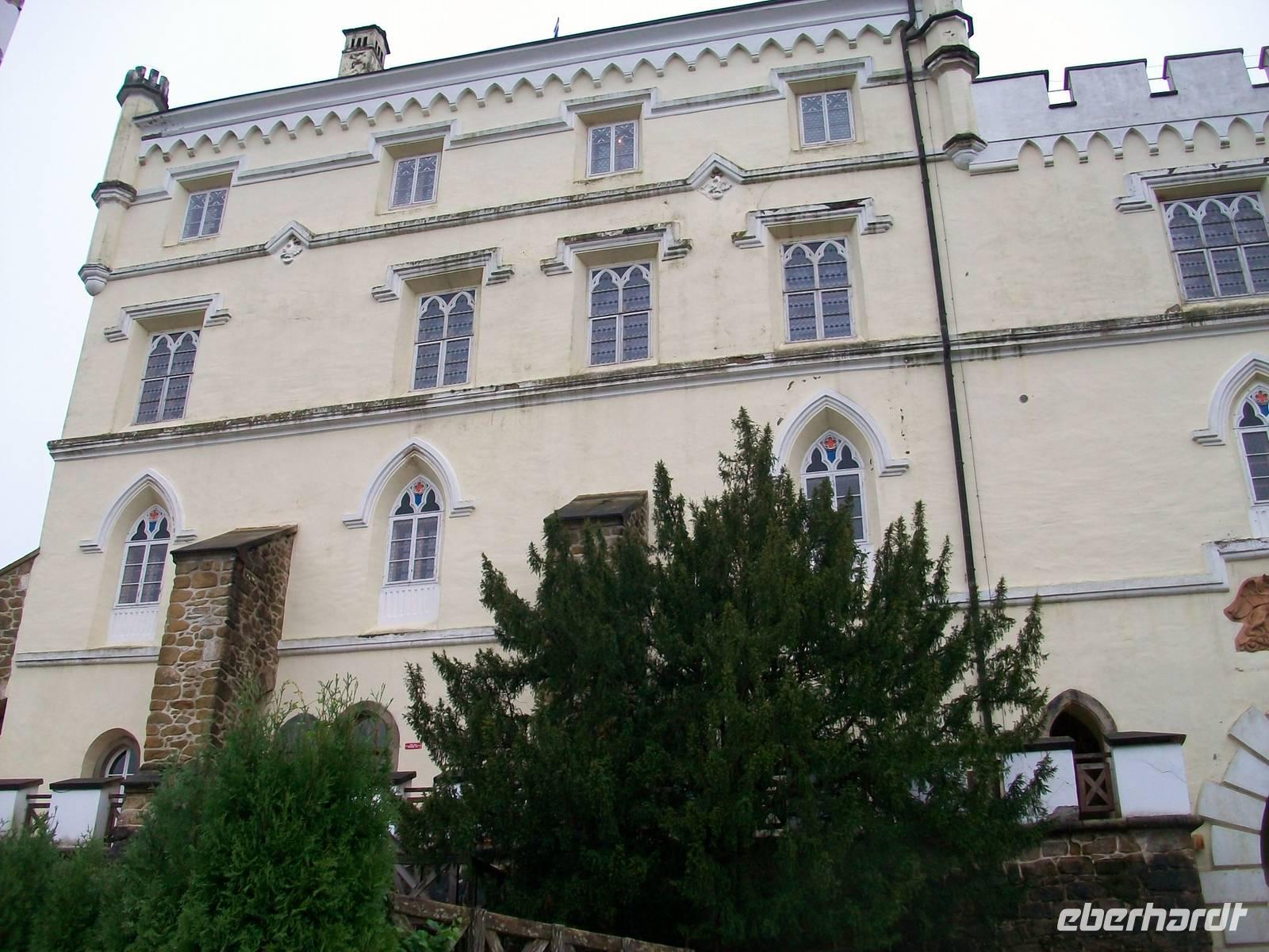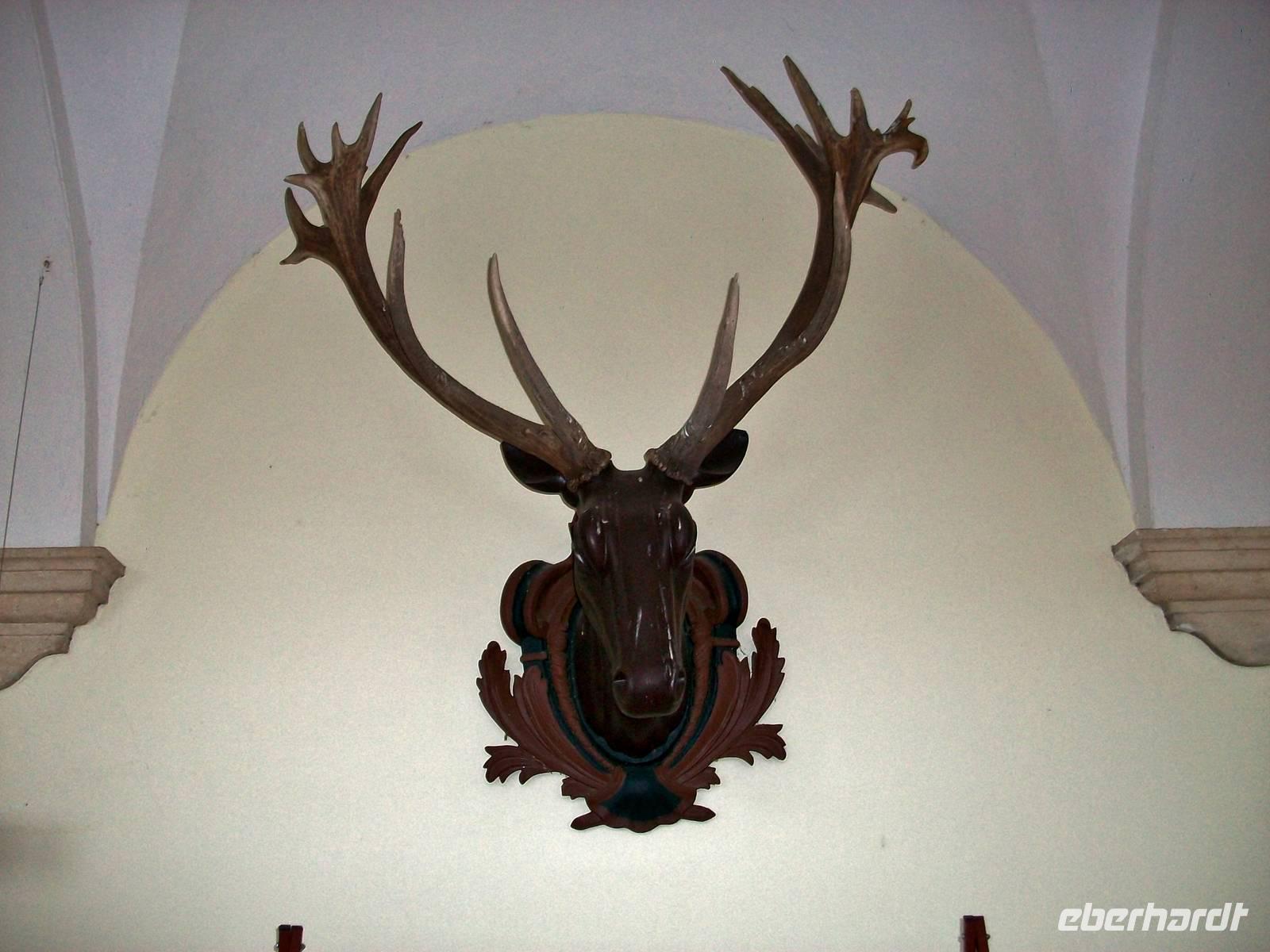 Überall an den Wänden hängen Jagdtrophäen, wir befinden uns in einem traditionellen Jagdgebiet welches tiefe Wälder umfasst, und bestaunen auch die schönen Gemälde die vielleicht kunsthistorisch wenig bedeutend sind, aber dennoch in ihrer Natürlichkeit den Besucher in den Bann ziehen. Zum Schluss gelangen wir noch auf die Terrasse die uns einen schönen Panoramablick auf das pittoreske Land welches uns umgibt, bietet.
