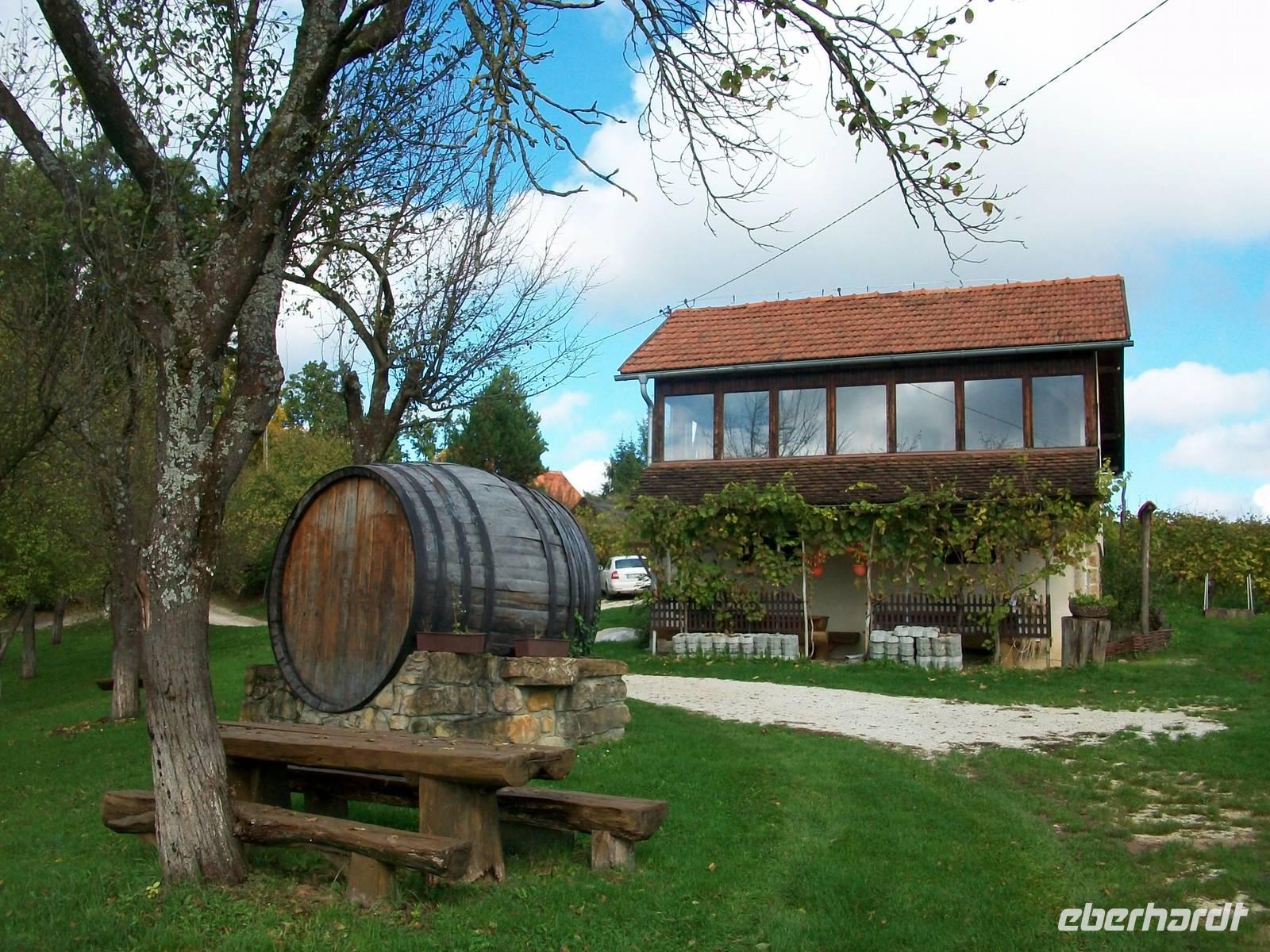 Ein kurzer Anstieg und wir gelangen zu einem Restaurant was uriger nicht sein kann. Umgeben von Weinbergen werden wir schon vom lustigen Krähen eines Hahnes begrüßt und der zutrauliche Hund des Hauses kommt schwanzwedelnd auf uns zu um auch seinen Beitrag zur Gastfreundschaft zu geben. Begrüßt werden wir nach alter Sitte mit Brot, Salz und einem Schnaps, dann dürfen wir im gemütlichen Gastraum unserer kroatischen Gastfamilie Platz nehmen. Schnell kommt eine dampfende Schüssel leckerer Rindsuppe auf den Tisch und zum Hauptgang gibt es einen großen Teller mit Entenbraten und Schweinefleisch dem auch wacker zugesprochen wird. Diese deftige Kost der Bauern hier wird gekrönt von einem guten Schluck Zagorje- Wein und den Abschluss macht noch ein guter Strudel der warm aus dem Ofen kommt.