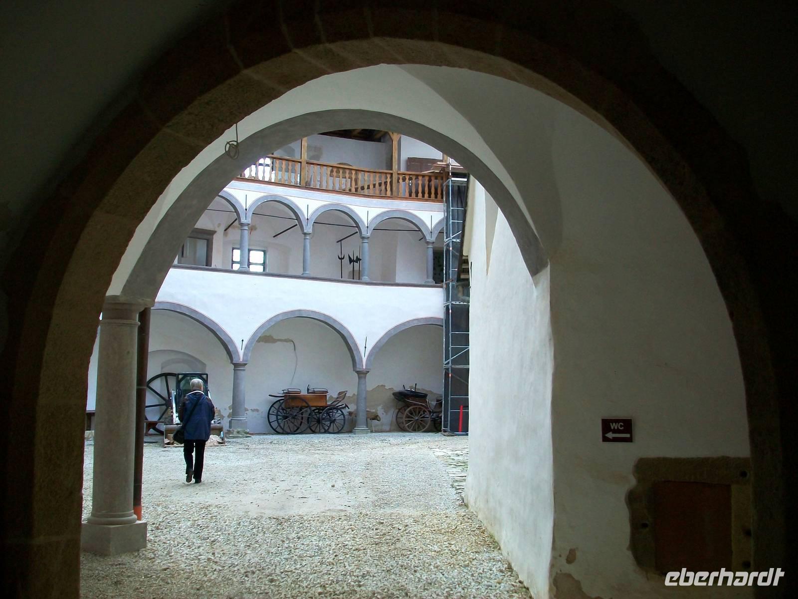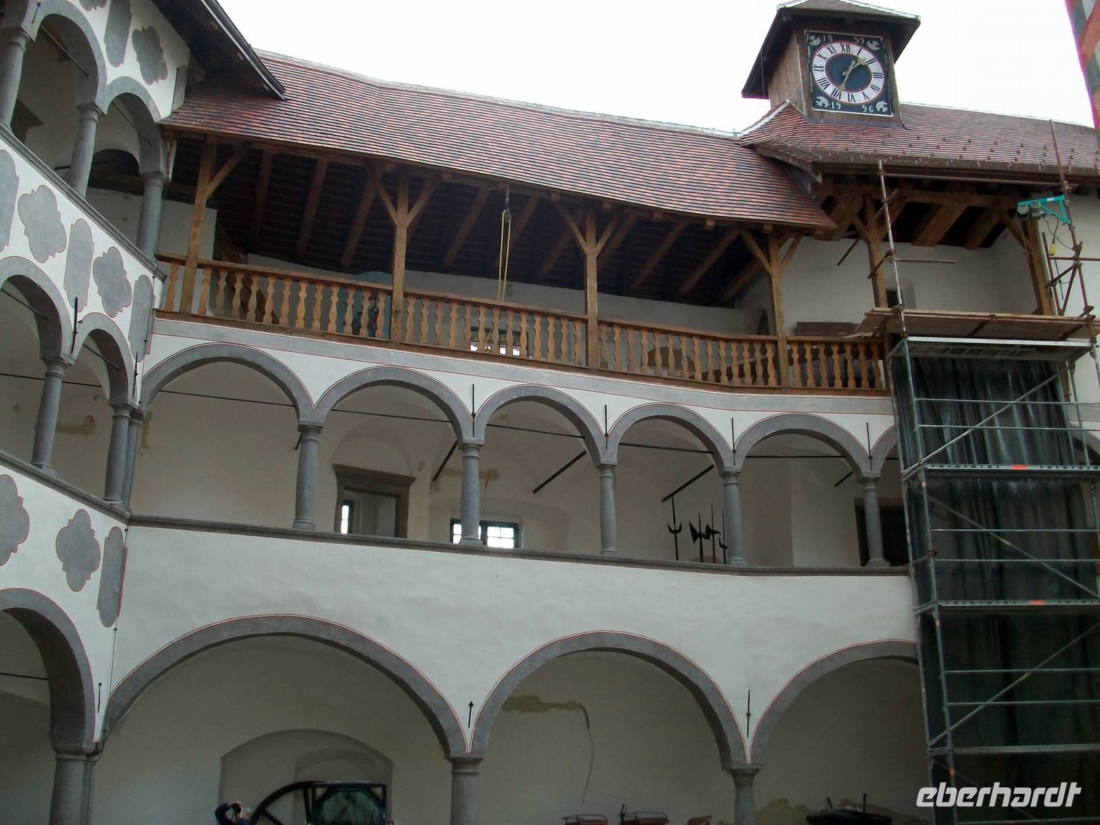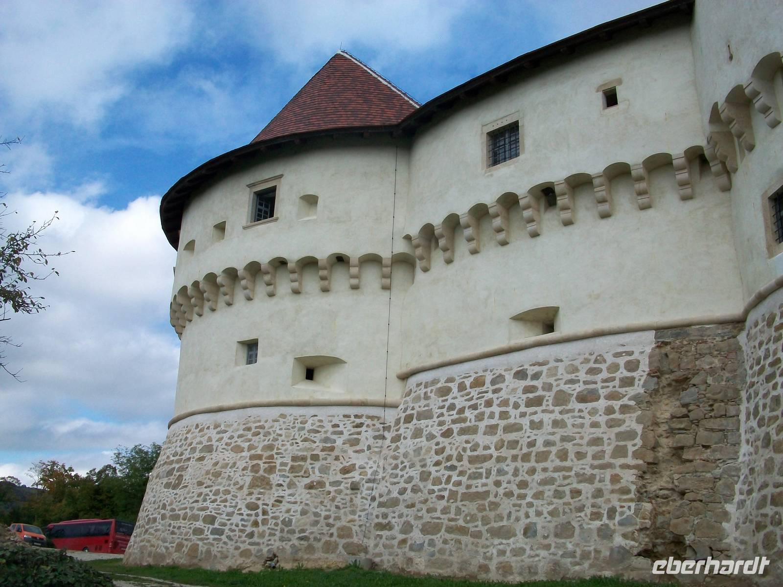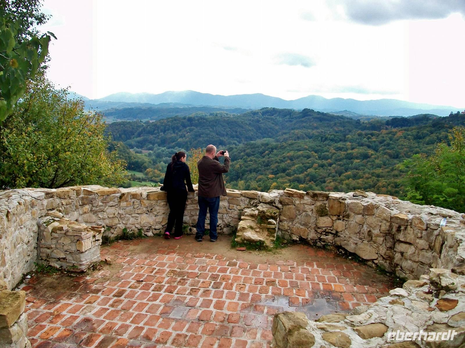 Oben angelangt erreichen wir bald den Innenhof dieser etwas verträumten Burg. Besonders eindrucksvoll sind die schönen Laubengänge die sich um den Innenhof in mehreren Etagen ziehen. Bald begrüßt uns die Führerin der Burg und mit ihr gehen wir auf eine besondere Erkundungstour. Dieses Anwesen gehörte über Jahrhunderte der Familie Ratkay und so manch Zeugnis ist aus dieser längst vergangenen Zeit erhalten geblieben. Wir bestaunen das schöne Mobiliar, gelangen hinauf in einen Raum in welchem ein uralter Kachelofen rekonstruiert wurde, und erfahren dabei auch hier wieder einiges von den uralten Sagen und Mythen dieser Region. Nach dieser wissenswerten Führung führt noch ein kurzer Weg zum Aussichtspunkt, danach nehmen wir die Fahrt wieder auf um den Rückweg anzutreten.