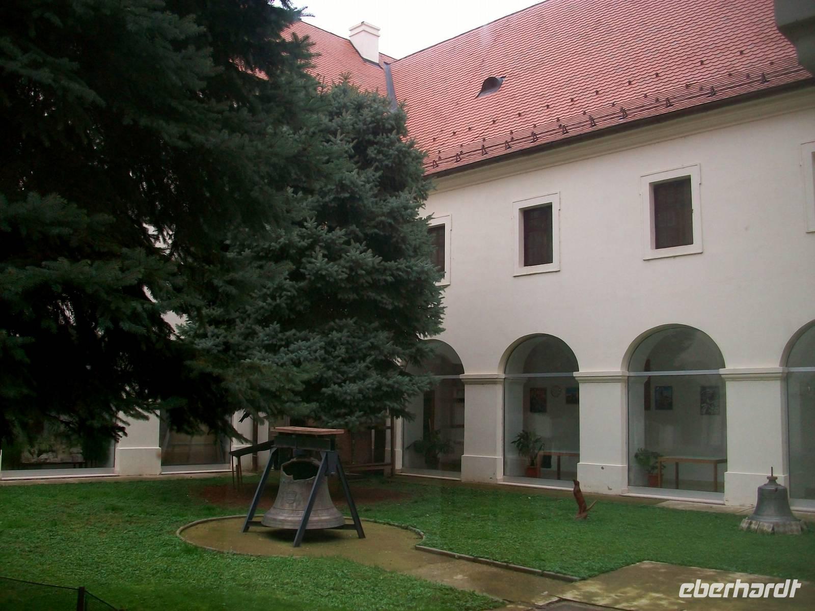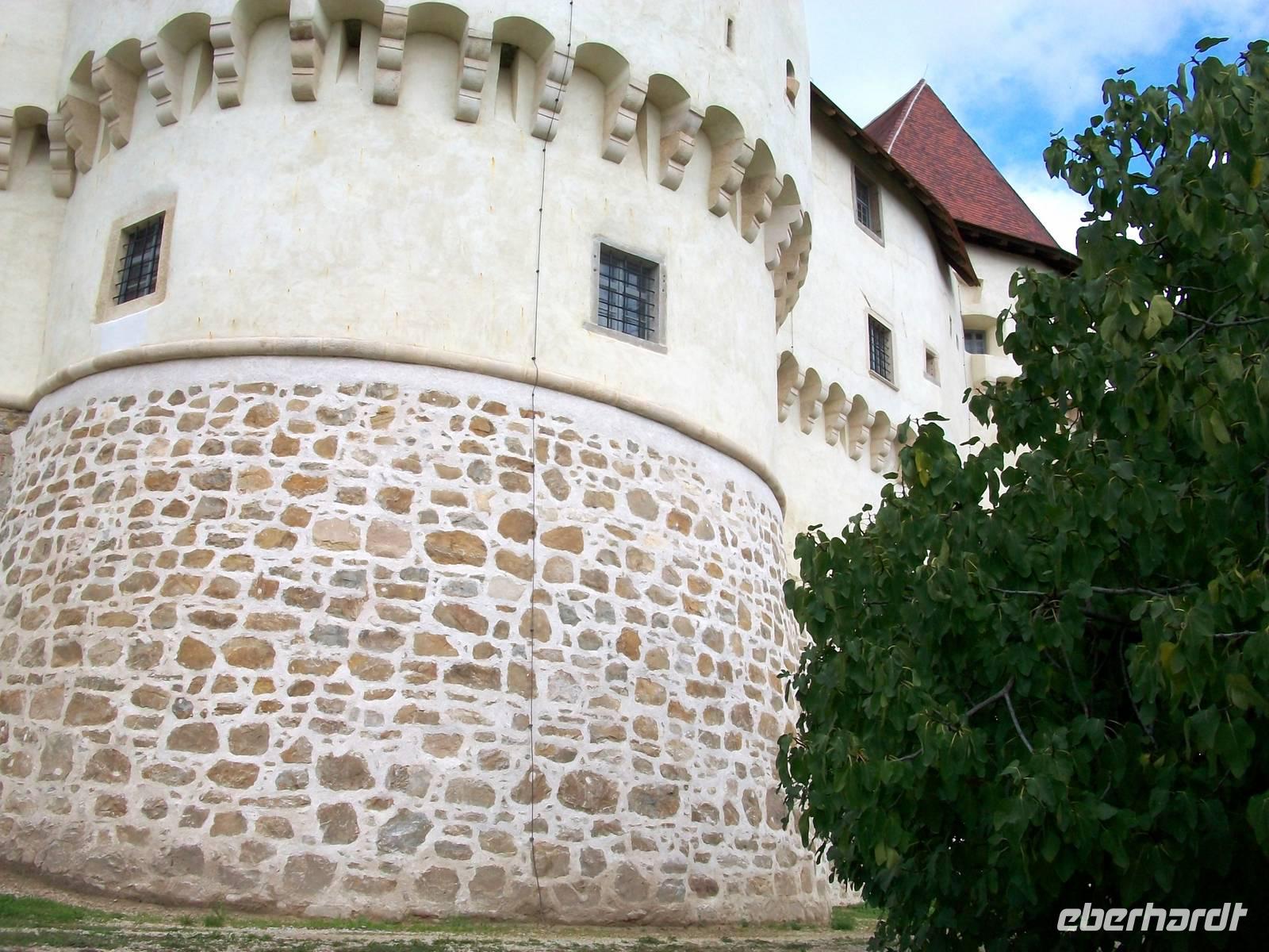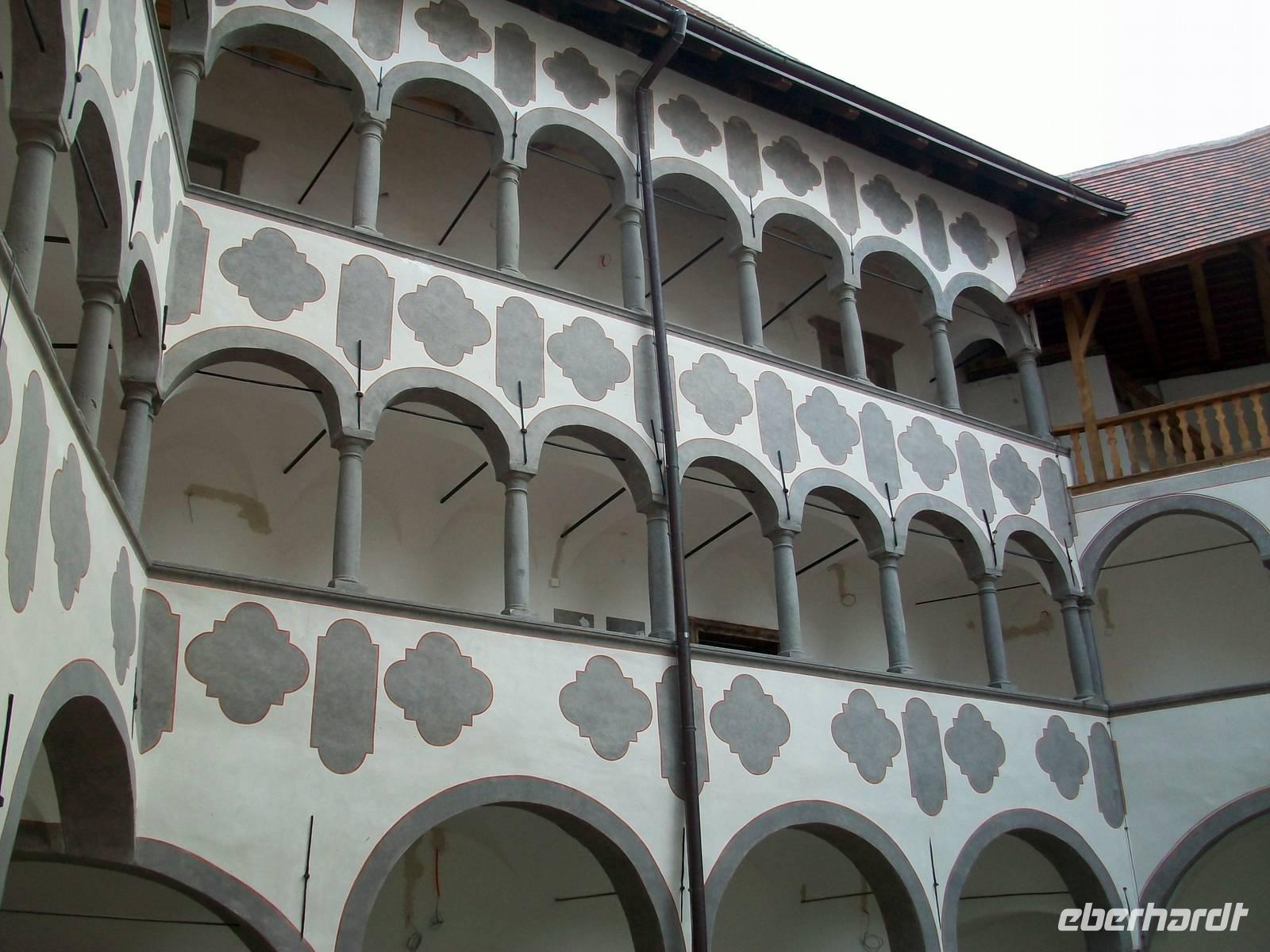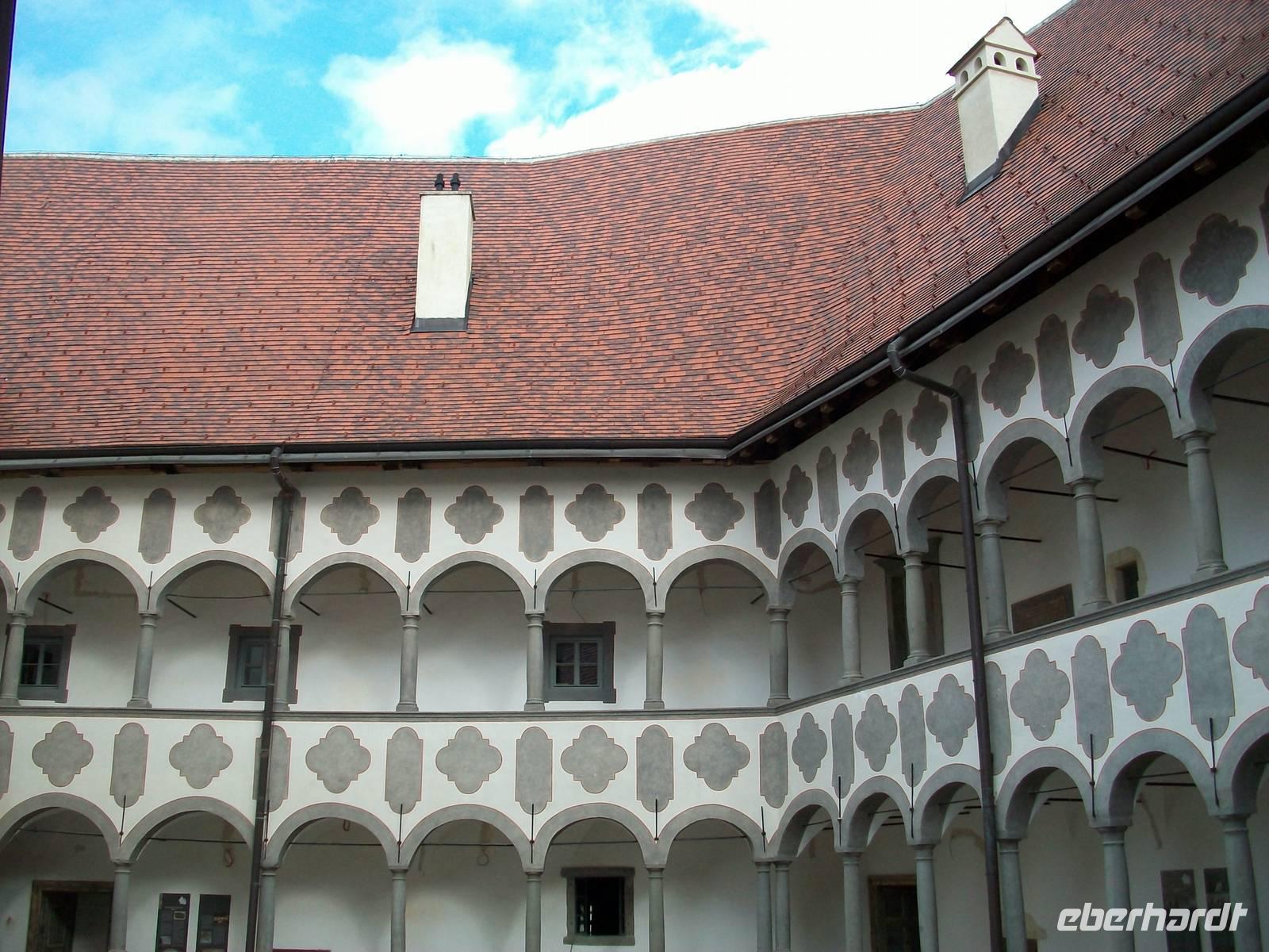 Oben angelangt erreichen wir bald den Innenhof dieser etwas verträumten Burg. Besonders eindrucksvoll sind die schönen Laubengänge die sich um den Innenhof in mehreren Etagen ziehen. Bald begrüßt uns die Führerin der Burg und mit ihr gehen wir auf eine besondere Erkundungstour. Dieses Anwesen gehörte über Jahrhunderte der Familie Ratkay und so manch Zeugnis ist aus dieser längst vergangenen Zeit erhalten geblieben. Wir bestaunen das schöne Mobiliar, gelangen hinauf in einen Raum in welchem ein uralter Kachelofen rekonstruiert wurde, und erfahren dabei auch hier wieder einiges von den uralten Sagen und Mythen dieser Region. Nach dieser wissenswerten Führung führt noch ein kurzer Weg zum Aussichtspunkt, danach nehmen wir die Fahrt wieder auf um den Rückweg anzutreten.