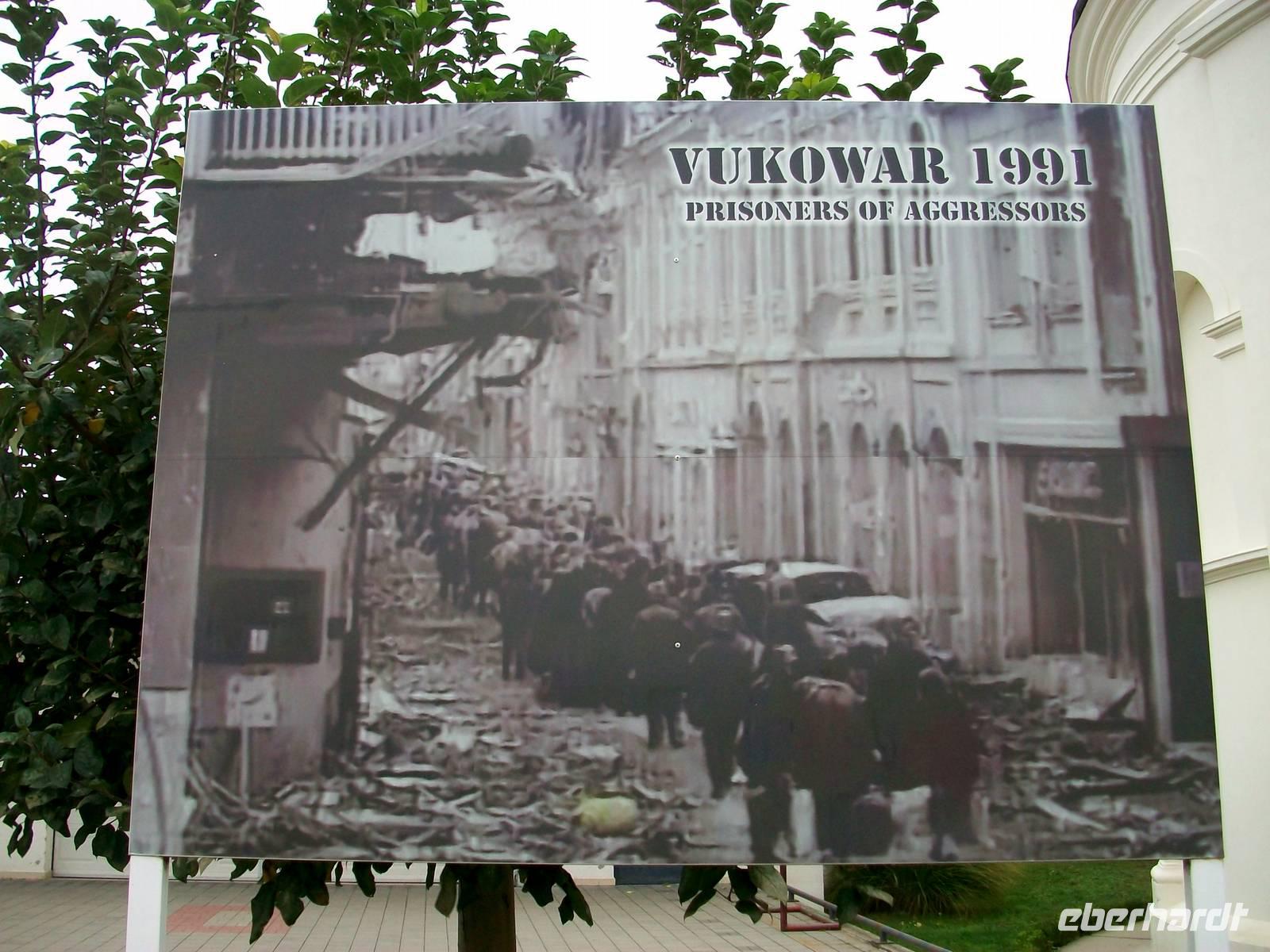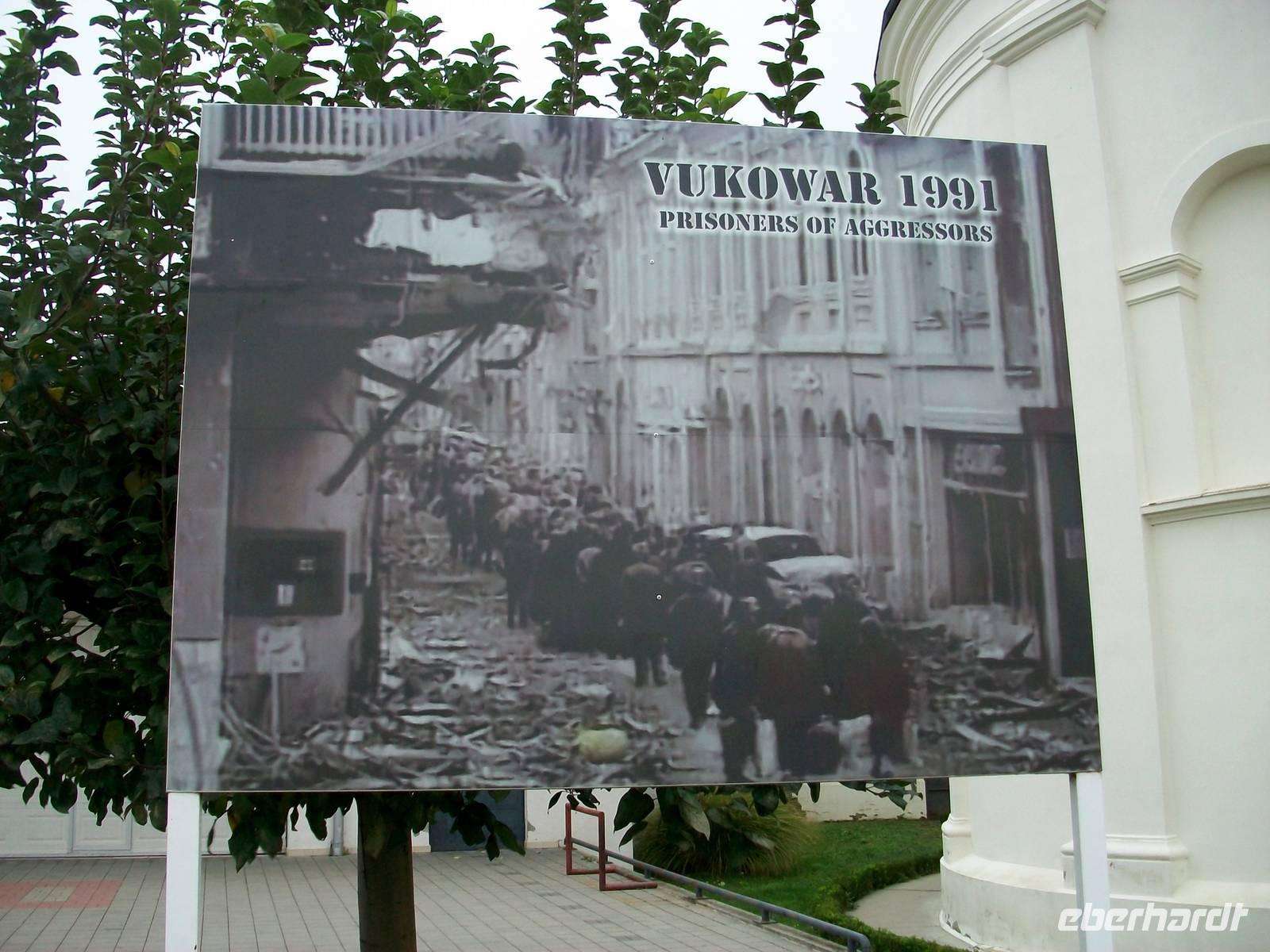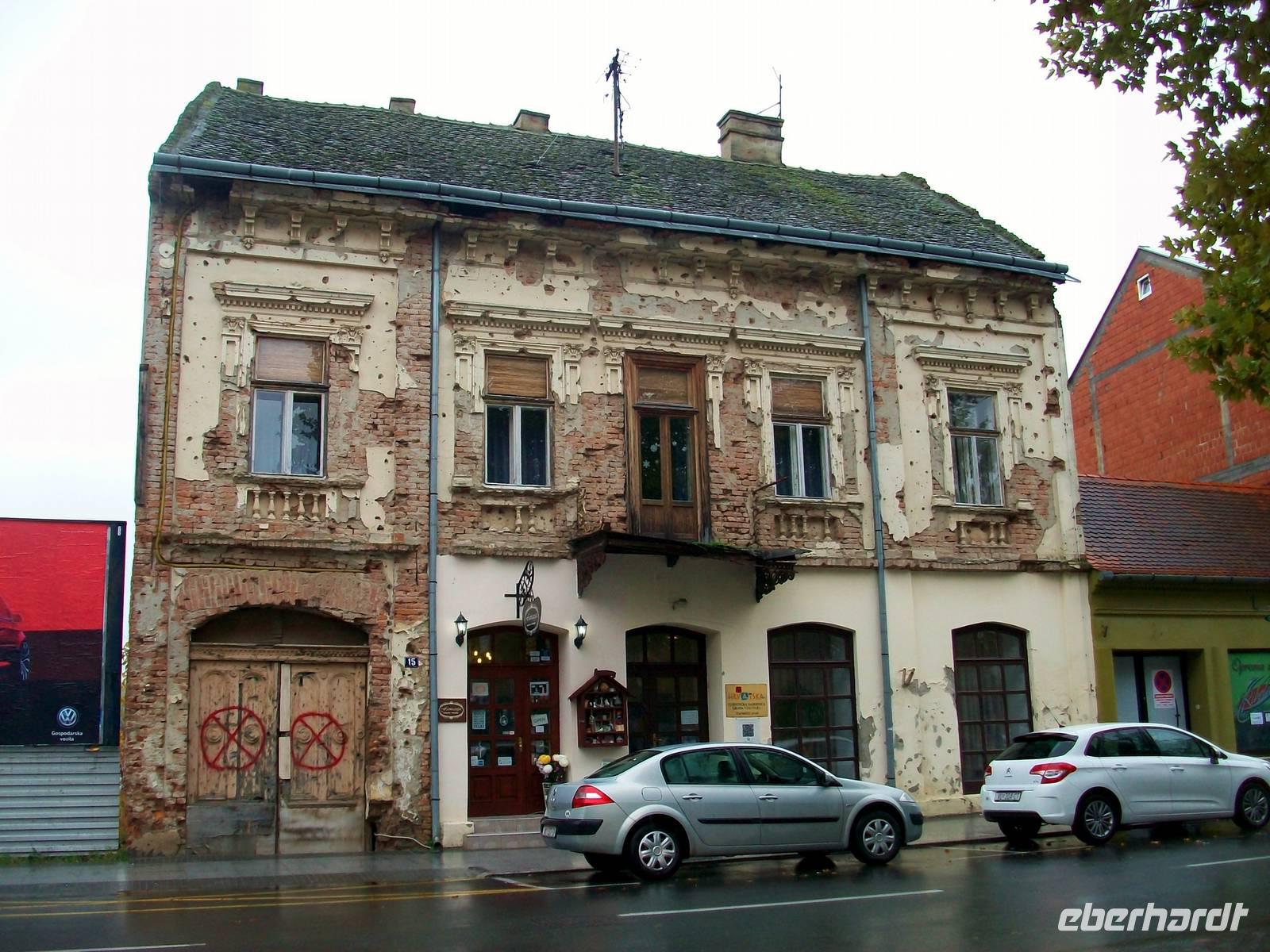 Zunächst führt uns der Weg am Donauufer entlang; drüben liegt Serbien, und wir schauen zuerst am ehemaligen Schloss des Grafen Eltz vorbei. Frisch renoviert strahlt es in einer leuchtend gelben Farbe und wir sehen uns die schöne Architektur an. Wechselvoll ist auch diese Geschichte; über den Hof und durch das Eingangstor gelangen wir auf die Hauptstraße Vukovars. Hier hat längst wieder normales Leben Einzug gehalten; es gibt zahlreiche Cafés, Läden und ein buntes Treiben auf der Straße. Viele Häuser sind wieder schön aufgebaut, aber dazwischen gibt es auch noch Gebäude die uns an die Grauen des Krieges erinnern. An einigen Häusern sind noch die zahlreiche Einschüsse zu sehen, diese Impressionen lassen uns erahnen wie furchtbar es gewesen sein muss.