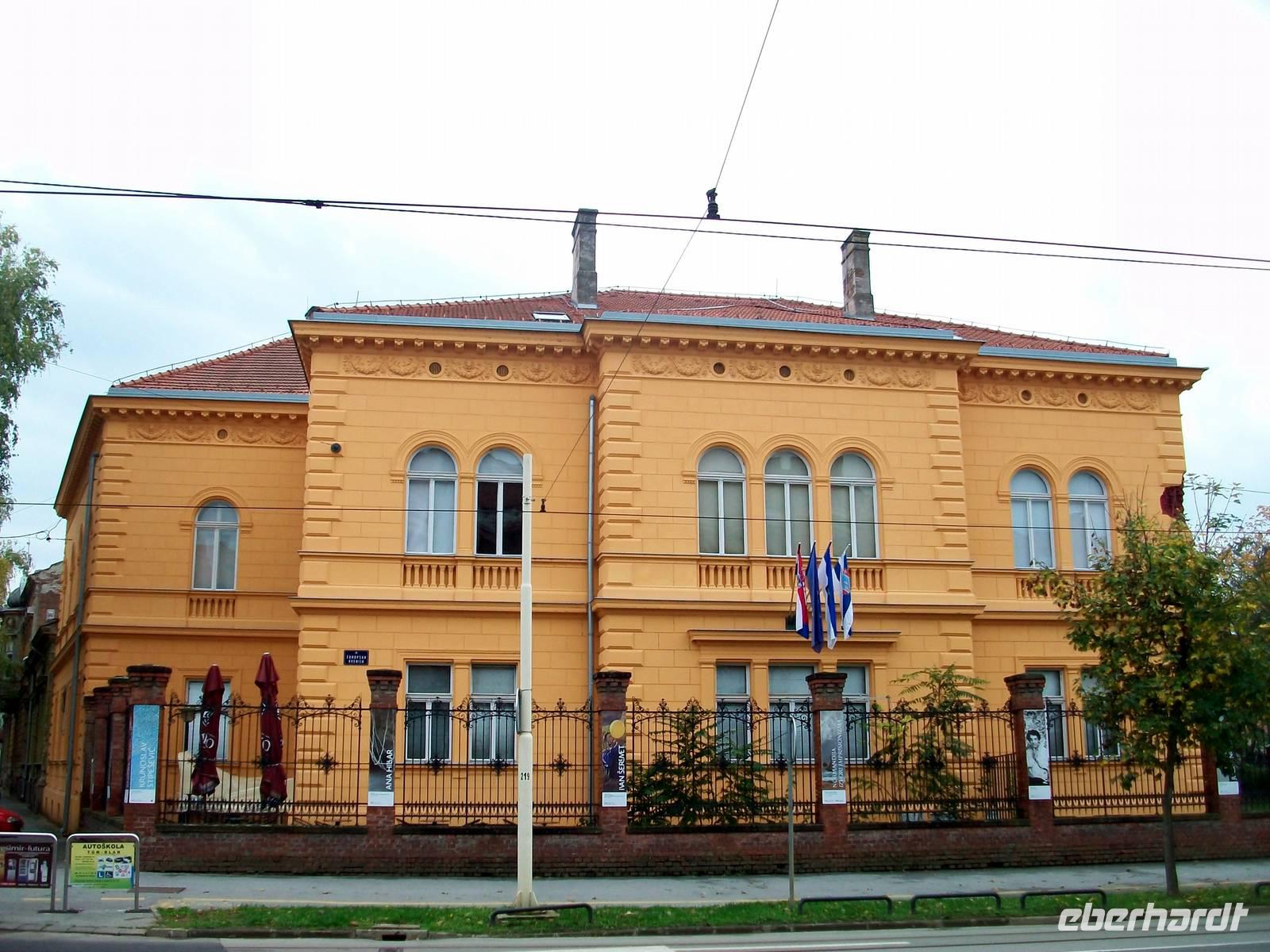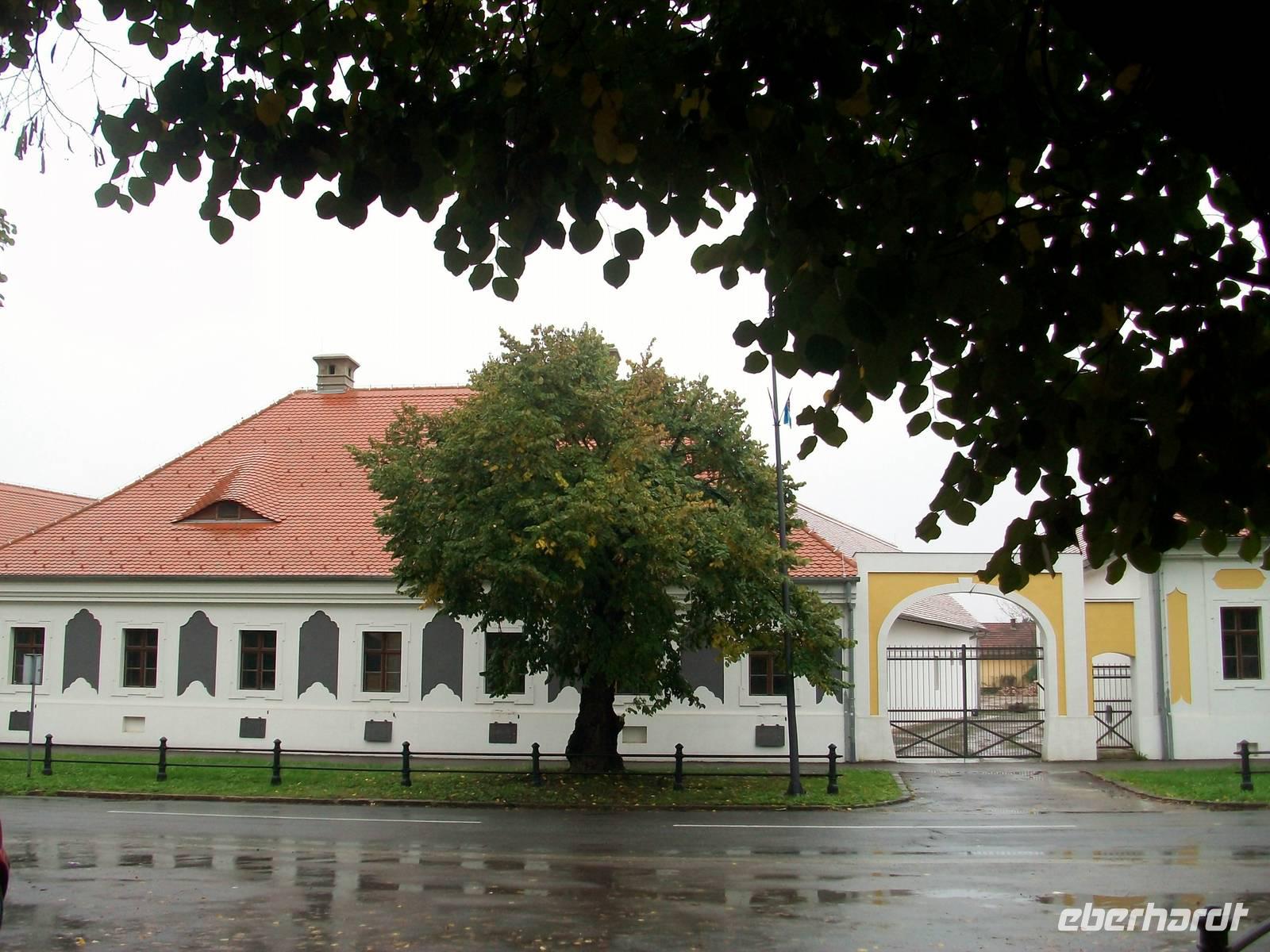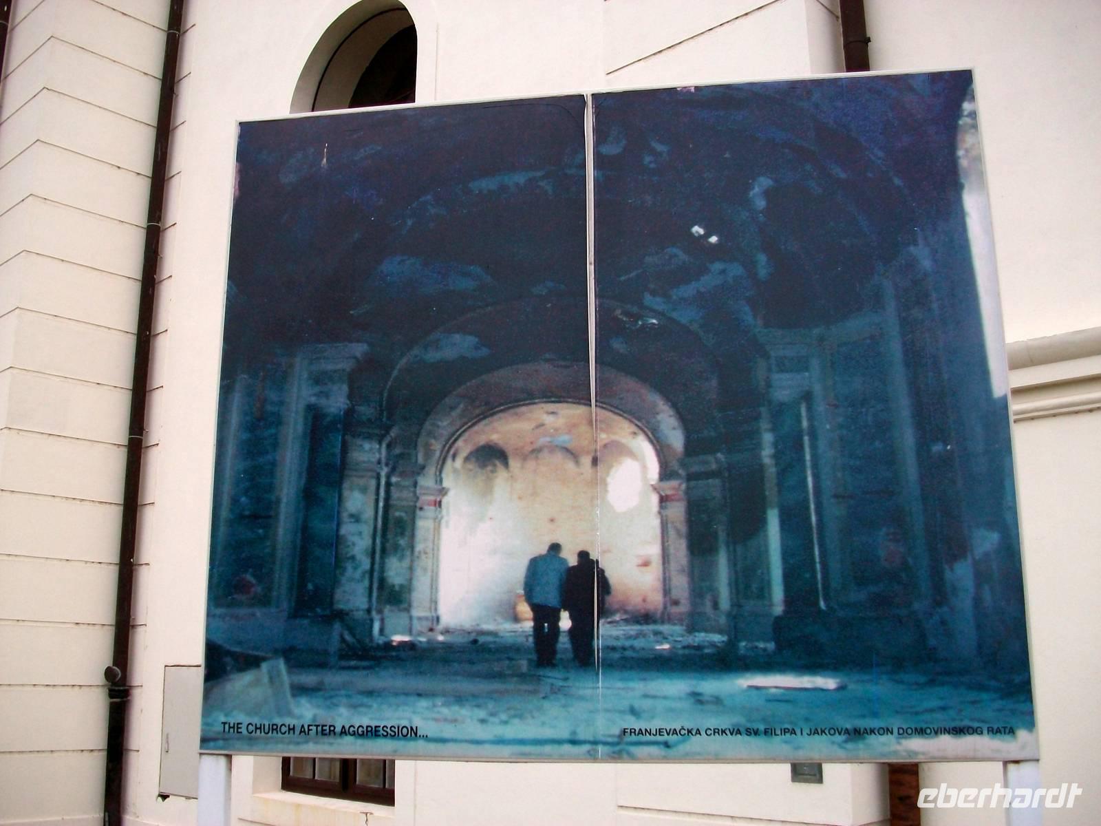 Zunächst führt uns der Weg am Donauufer entlang; drüben liegt Serbien, und wir schauen zuerst am ehemaligen Schloss des Grafen Eltz vorbei. Frisch renoviert strahlt es in einer leuchtend gelben Farbe und wir sehen uns die schöne Architektur an. Wechselvoll ist auch diese Geschichte; über den Hof und durch das Eingangstor gelangen wir auf die Hauptstraße Vukovars. Hier hat längst wieder normales Leben Einzug gehalten; es gibt zahlreiche Cafés, Läden und ein buntes Treiben auf der Straße. Viele Häuser sind wieder schön aufgebaut, aber dazwischen gibt es auch noch Gebäude die uns an die Grauen des Krieges erinnern. An einigen Häusern sind noch die zahlreiche Einschüsse zu sehen, diese Impressionen lassen uns erahnen wie furchtbar es gewesen sein muss.