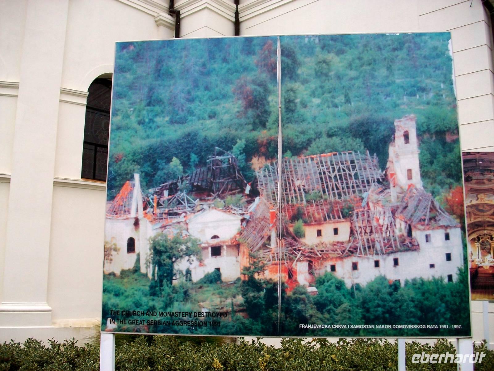 Pünktlich können wir Dara abholen und wir gelangen bald auf einen kleinen Hügel und in den Hof des Franziskanerklosters. Am Eingang sind Bilder über die Zerstörung ausgestellt und nun wird uns ganz klar, dass dieses Thema noch immer präsent ist.