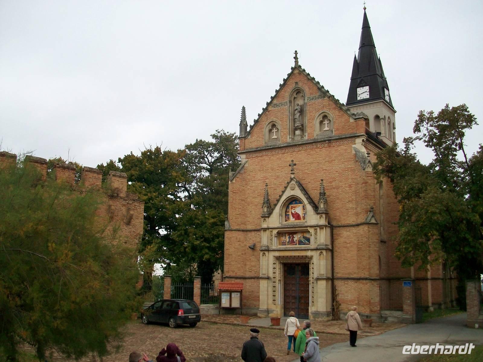 Die Regenschirme sind aufgespannt als wir uns auf den Weg zum Eingang der Kirche begeben. Im Inneren ist es recht duster und die Gestaltung dieses Backsteinbaus ist einfach aber schön, wissenswert auch die Geschichte die uns Dara näherbringt.