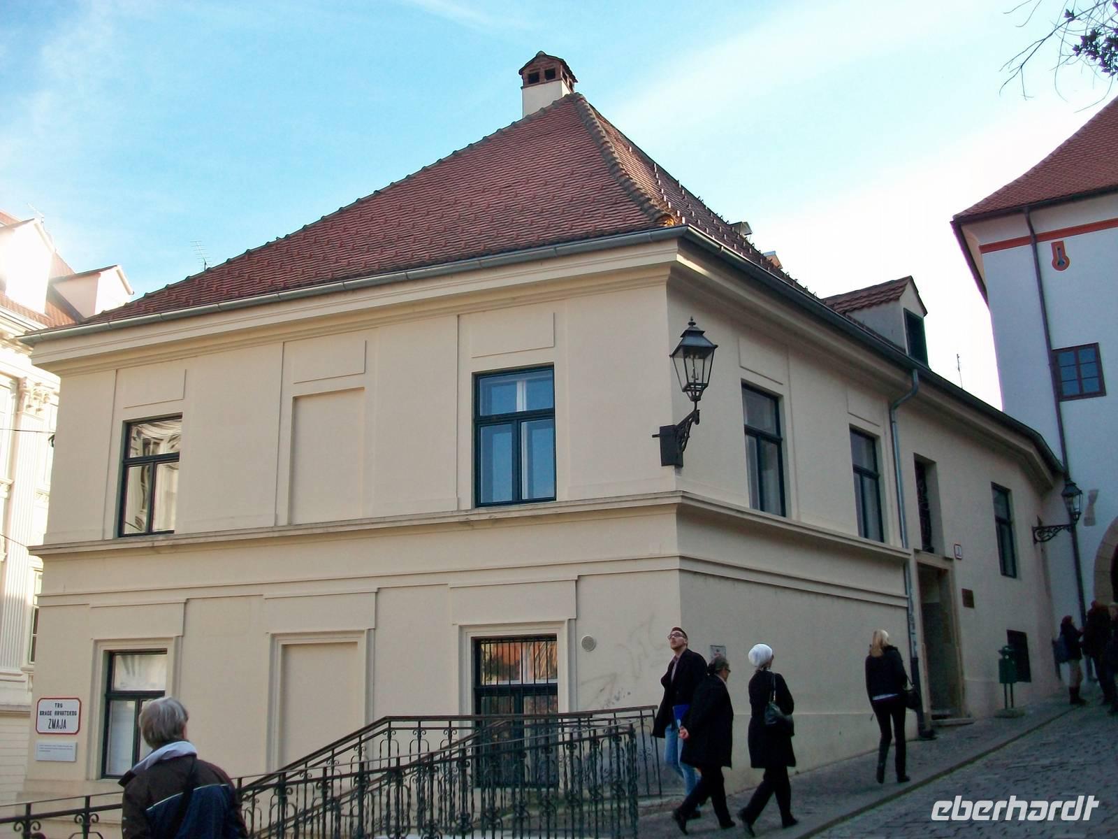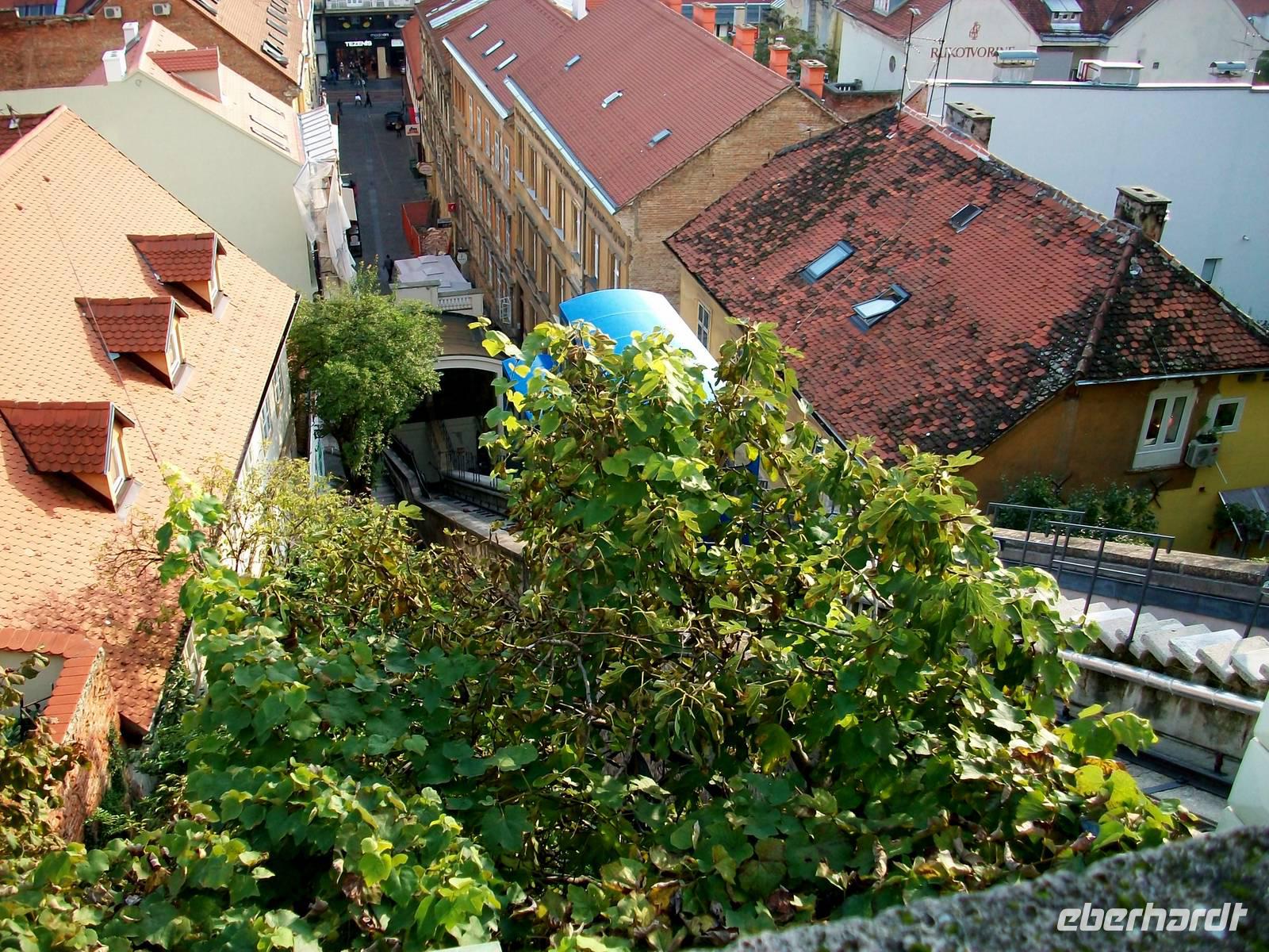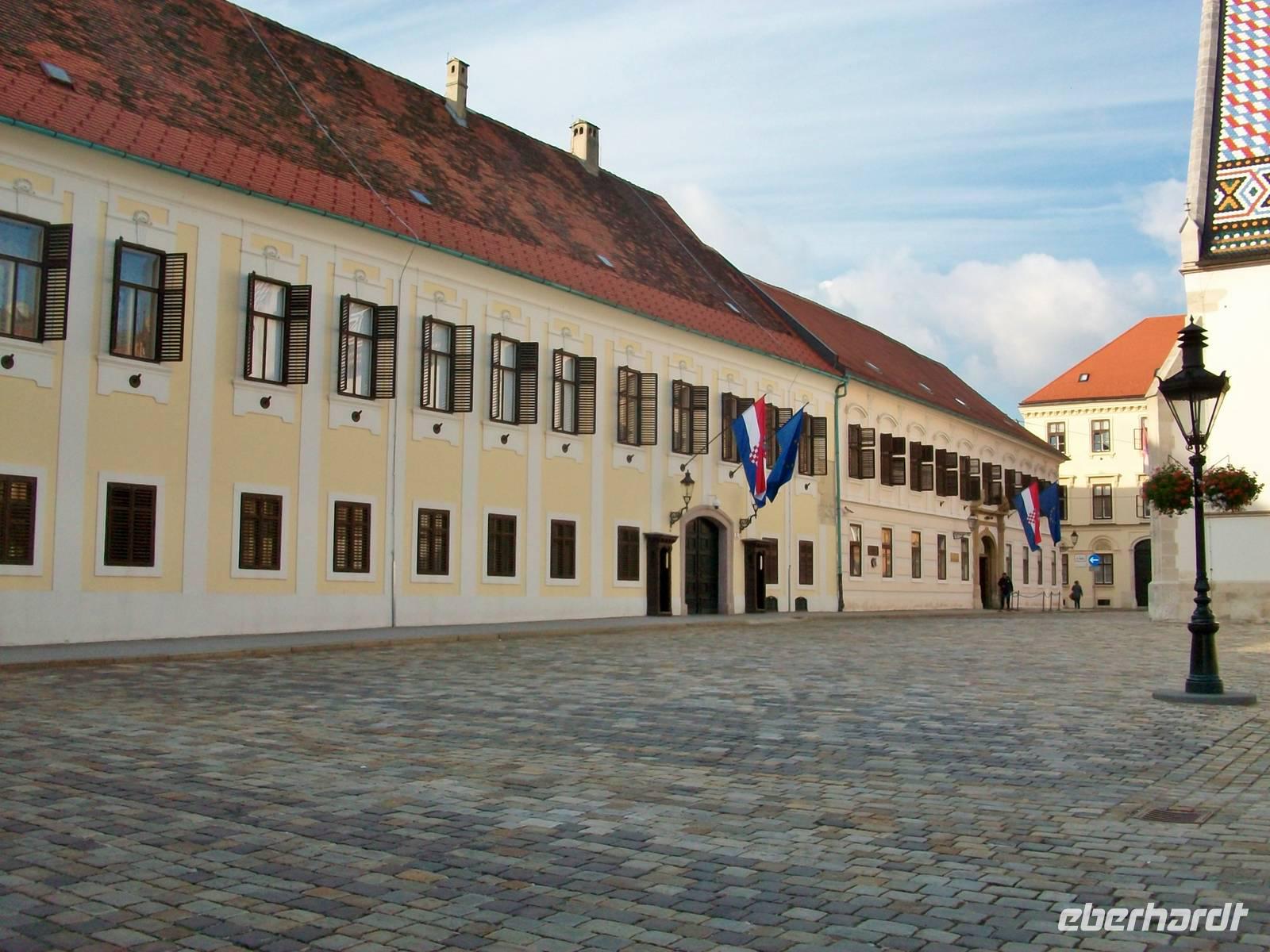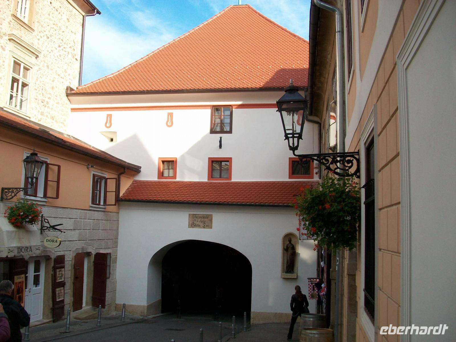 Dann geht es hinauf zur Oberstadt. Durch das Steintor, es ist das letzte noch erhaltene Stadttor welches heute eine kleine Kapelle beherbergt, gelangen wir zum Markusplatz. Hier sehen wir die wichtigen Gebäude der Stadt und des Landes: Parlament, Regierungssitz und Rathaus; dominiert wird der Platz aber von der Markuskirche mit den schönen bunten Dachziegeln aus gebrannter Keramik.