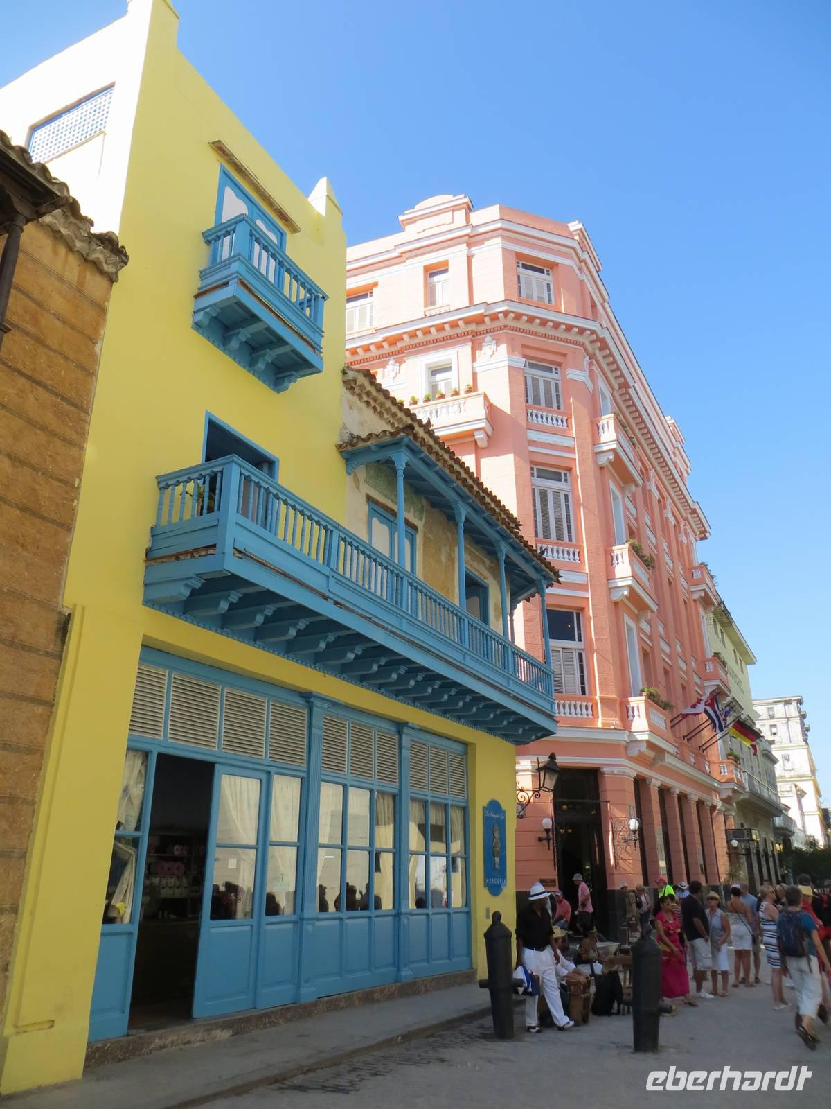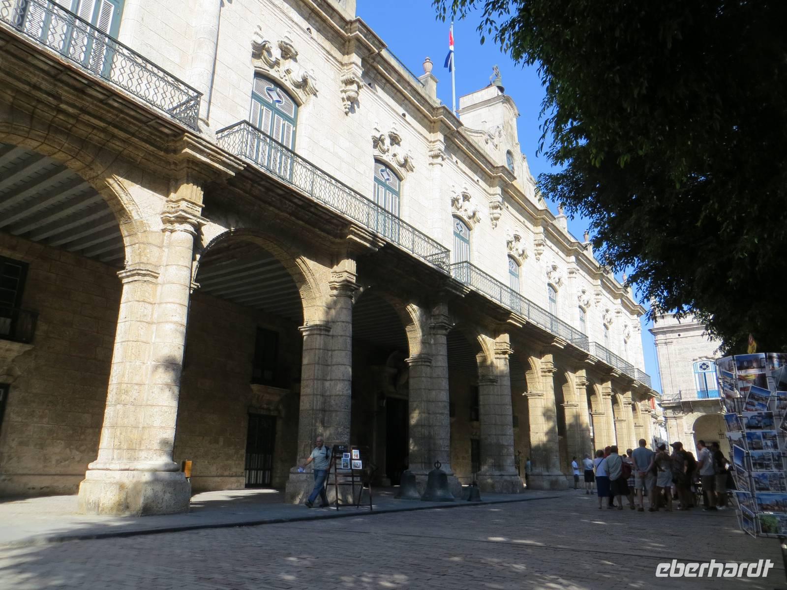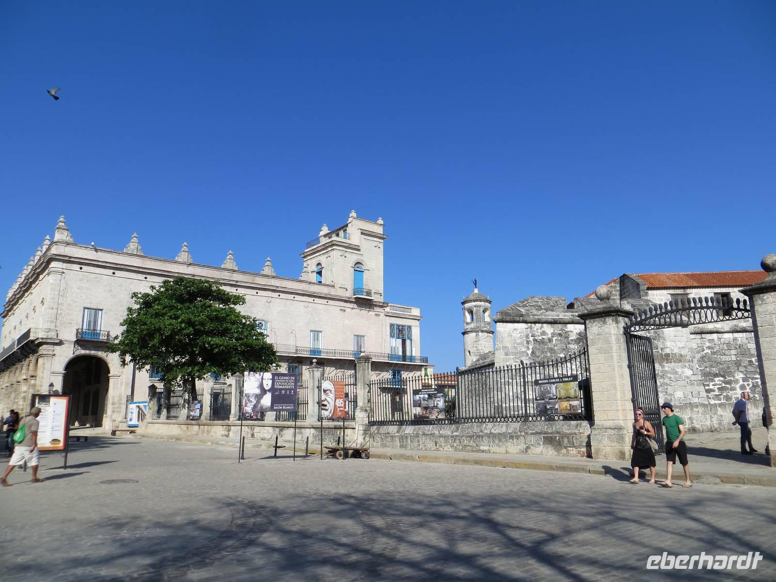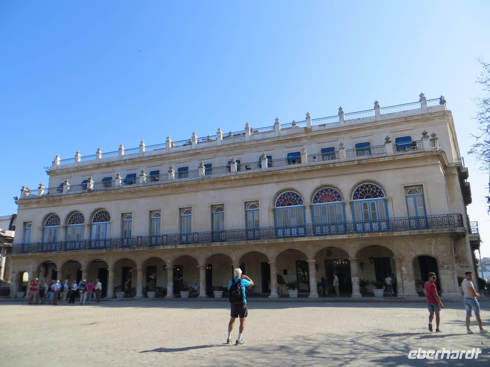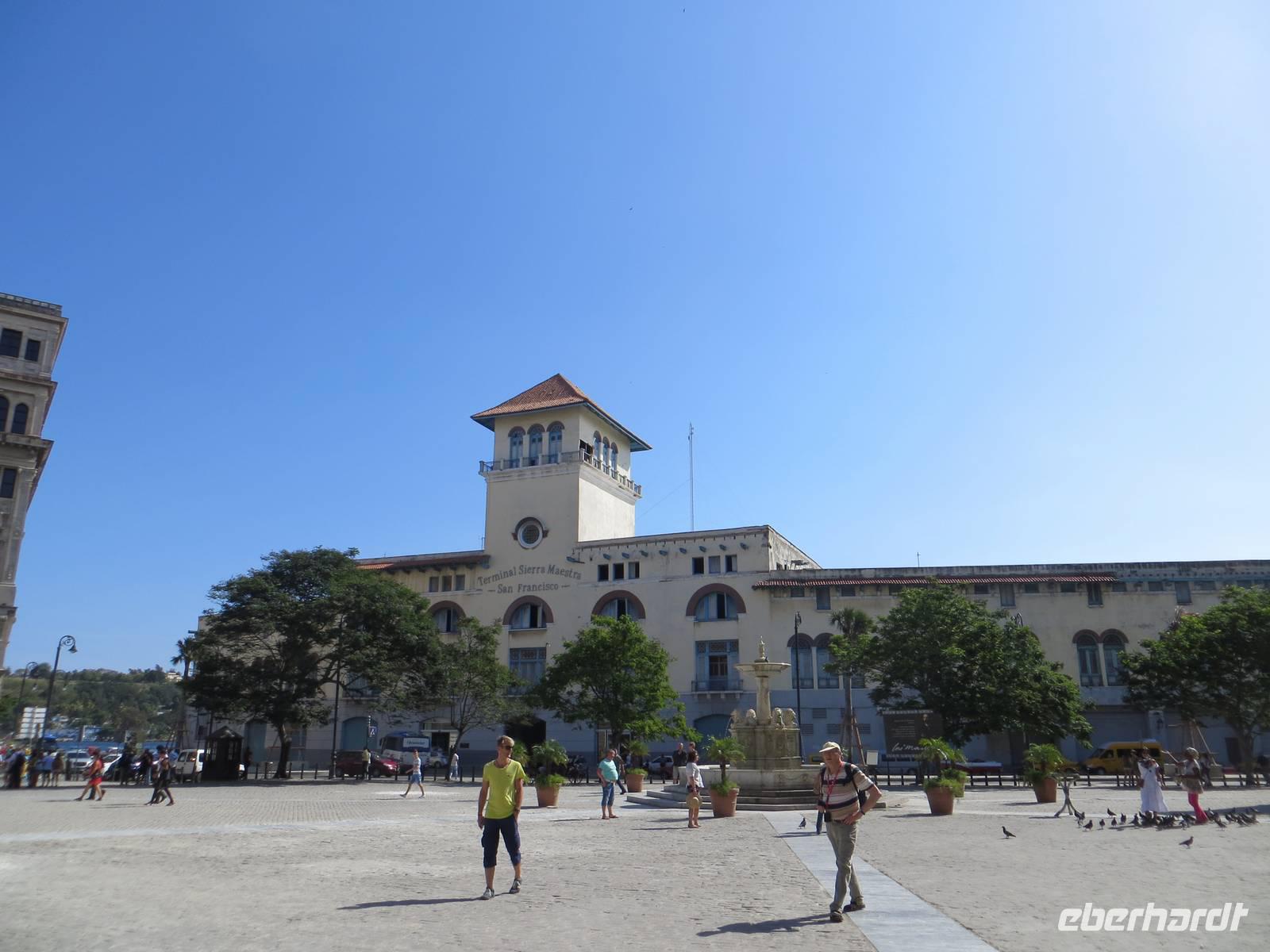 Vorbei am Hotel Ambos Mundial mit dem Eckzimmer 511, in dem Ernest Hemmingway über sechs Jahre residierte, schlendern wir in Richtung Hafen und erreichen den Plaza San Francisco de Asís. Er wird eingegrenzt vom Kreuzfahrt-Terminal Sierra Maestra und der Lonja del Comercio (Handelsbörse), welche das größte Gebäude der Stadt ist. Es wurde Anfang des 19. Jahrhunderts vom spanischen Architekt Tomas Mur im romanischen Stil errichtet. Auf dessen Kuppel thront ein bronzener Merkur, der bei den Römern als Gott der Kaufleute war. Auf der gegenüberliegenden Seite stehen die Kirche und das ehemaliger Kloster des Heiligen Franz von Assisi. Heute verwendet man dieses Komplex als Konzertsaal und als Museum der Religiösen Kunst. Ein beliebtes Fotoobjekt ist auch der Löwenbrunnen aus dem Jahre 1836.
