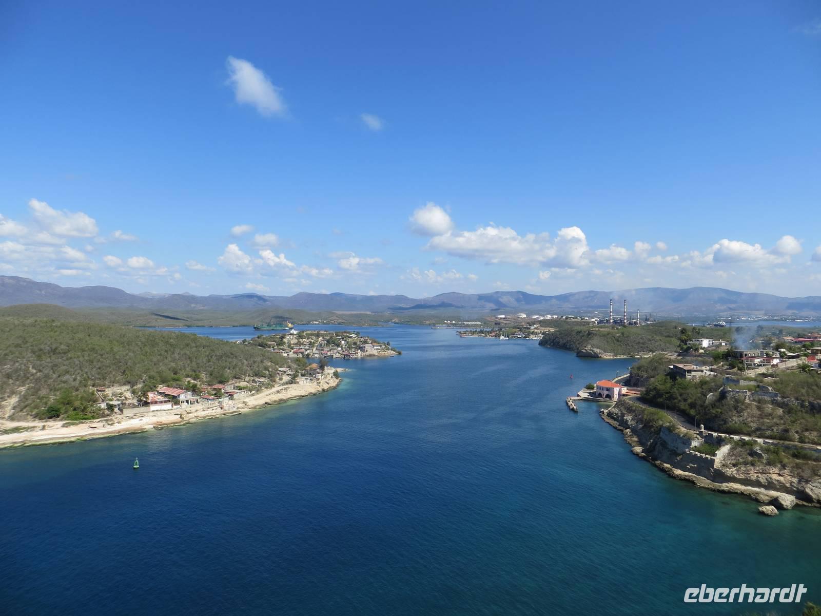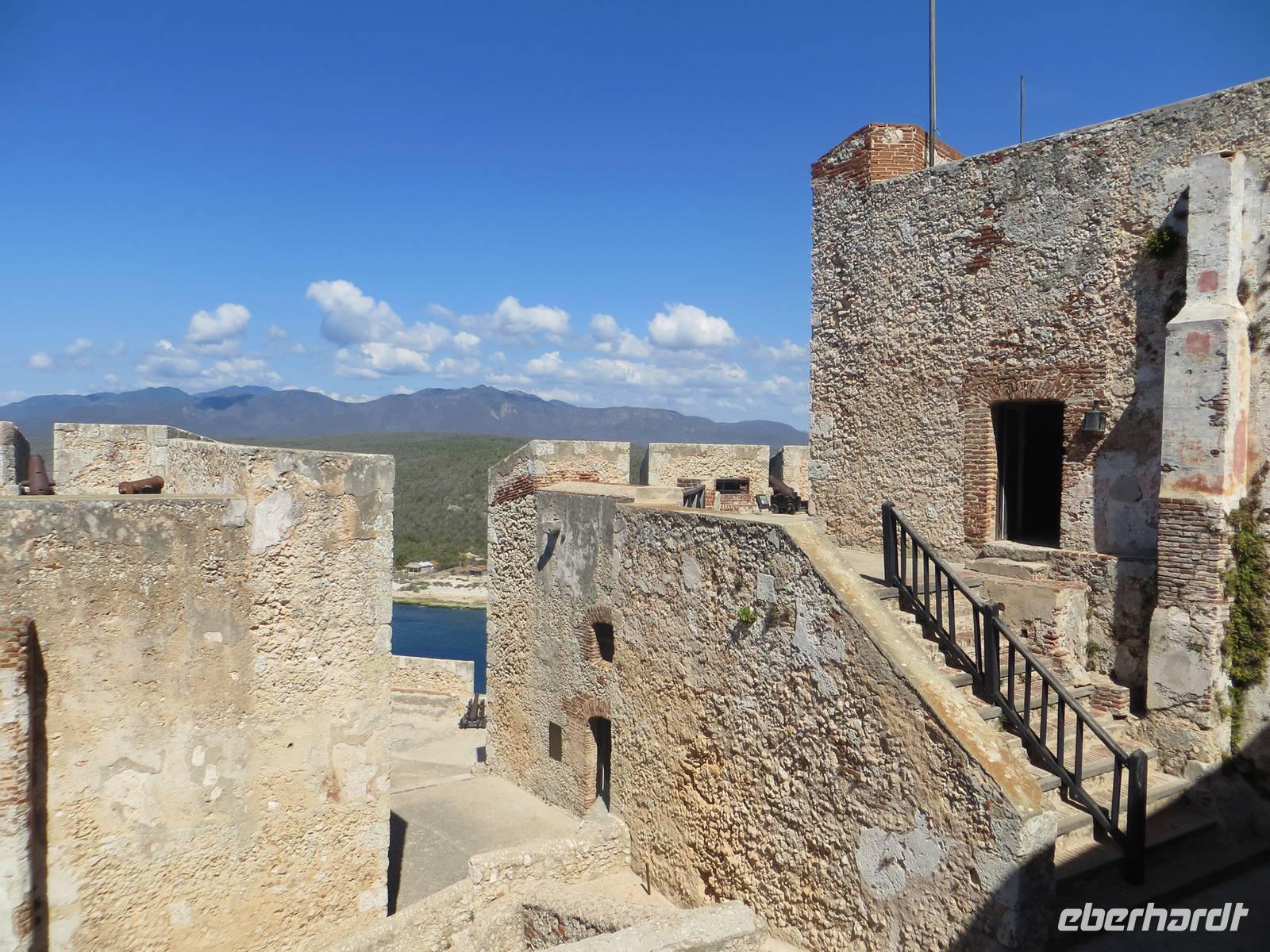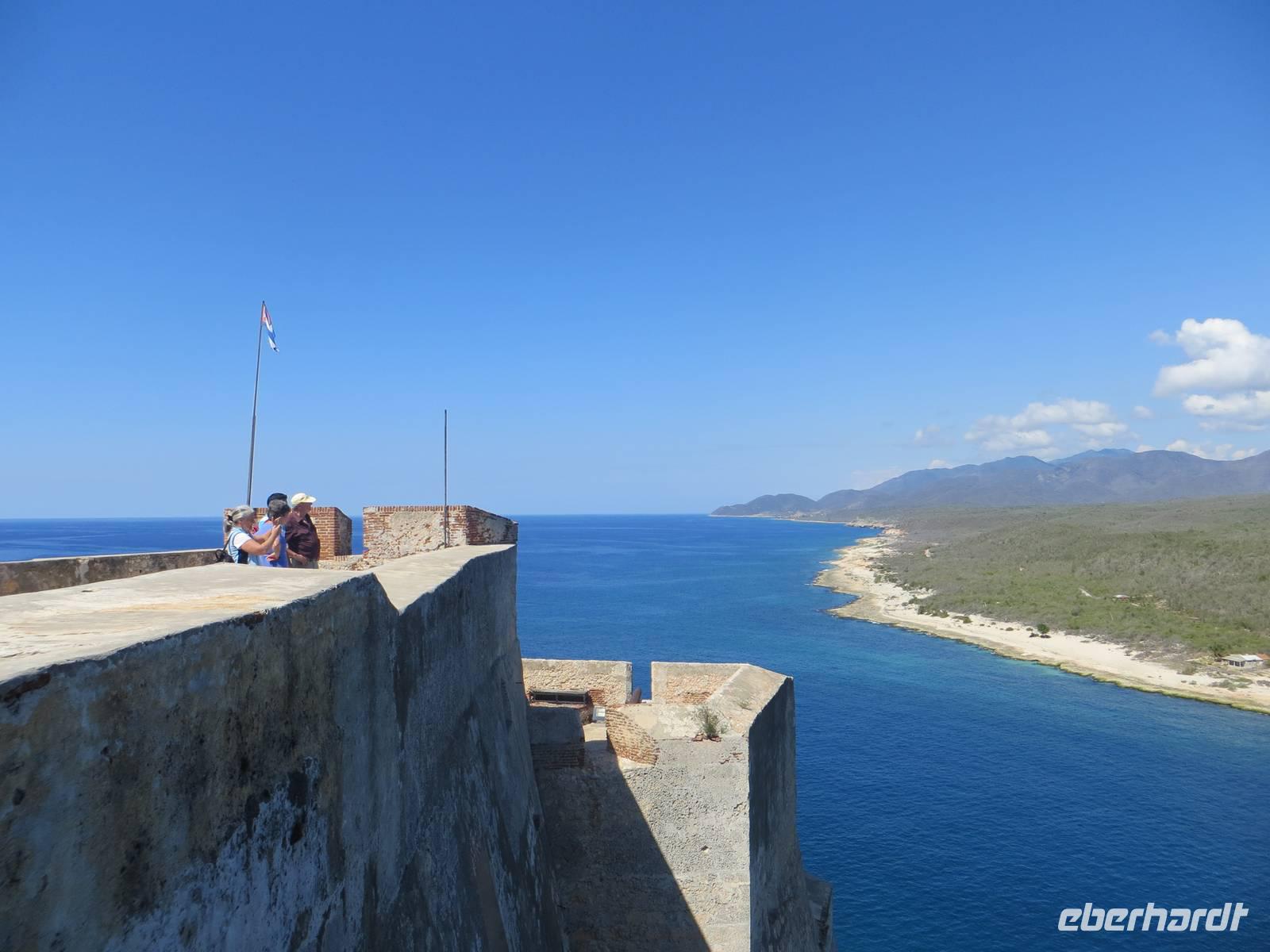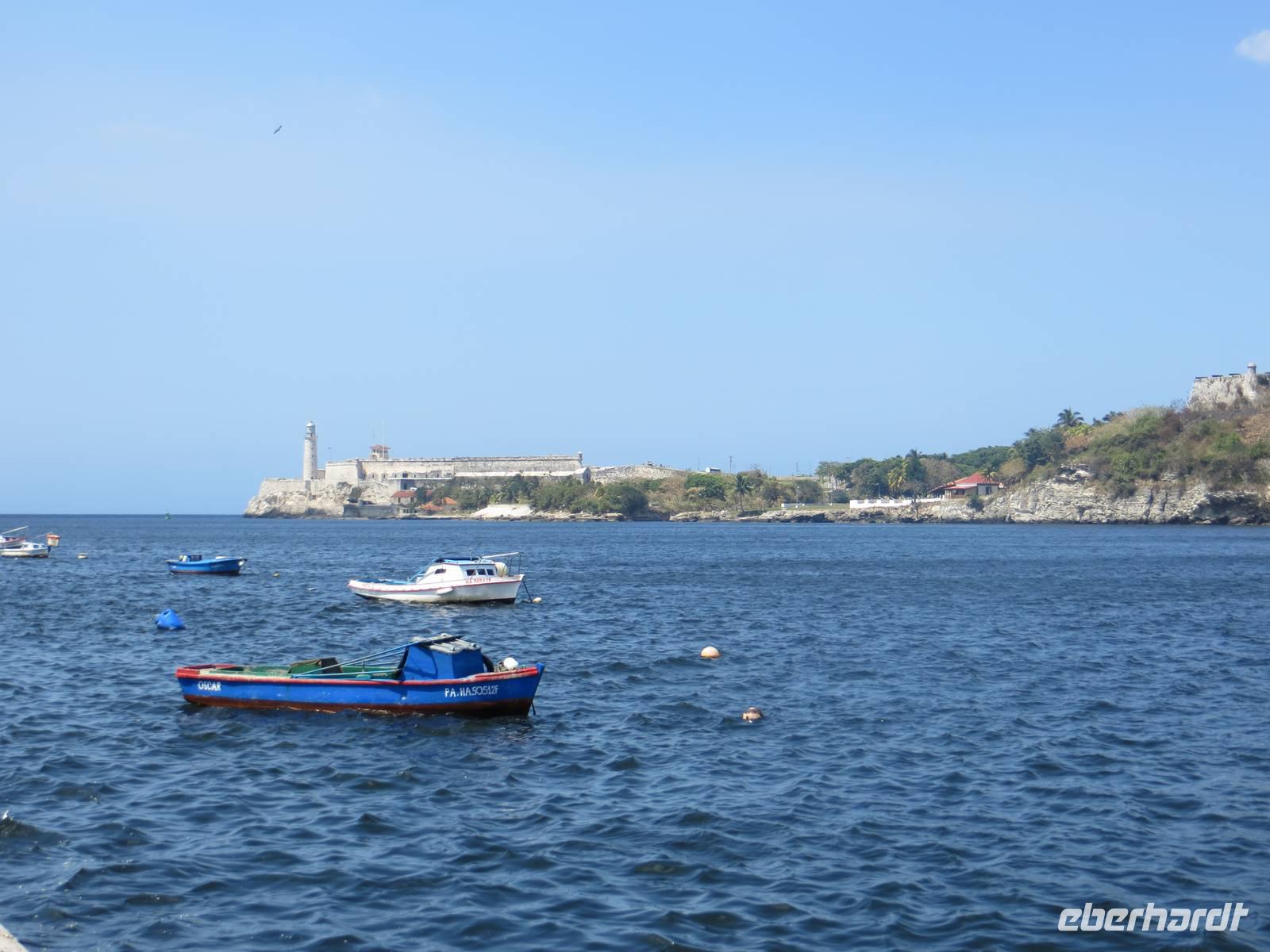 Weiter geht es entlang der belebten Gassen zur Festung Castillo el Morro im Renaissancestil. Auf der ehemaligen Anti-Piraten-Festung, durch König Philipp II erbaut, die heute zum UNESCO Weltkulturerbe gehört, haben wir eine wunderschöne Aussicht auf die Karibik bis hin zu den Sierra Maestra. Sie ist ein herausragendes Beispiel spanischer Militärarchitektur. In der Nähe auf einer kleinen Insel befindet sich unser heutiges Mittagsrestaurant, welches wir per Boot erreichen. Im kühlen Schatten genießen wir auf der Terrasse unsere Gaumenfreude und den dazu servierten Augenschmaus auf das türkisblaue Meer. Unsere Ohren lauschen dem geselligen Konzert der Möwen, wenn Sie aufgeregt in der Luft nach ihrem Futter schnappen. Bevor es an Land geht, umkreisen wir die kleine Insel und verschaffen uns auch einen Blick von der anderen Seite, wo die Fischer sehr ruhig und doch recht abgeschieden vom Lärm der quirligen Stadt leben. Zurück an Land verabschieden wir uns von unserem Chauffeur José bei einem Schluck Rum und Cola. Gut gegen die Flugangst gewappnet wollen wir nun in einem alten russischen Flugzeug zurück nach Havana fliegen. Wir merken, das Organisieren und Einchecken in Kuba dauert ewig lang, doch um so erleichterter sind wir, als endlich alles regelt ist und wir in die Maschine einsteigen dürfen. Während des Fluges verfolgen wir noch einmal unsere Route, die wir mit dem Bus durch ganz Kuba zurückgelegt haben. Herrliche Ausblicke und schöne Erinnerungen blenden wie eine Diashow vor unseren Augen ein!