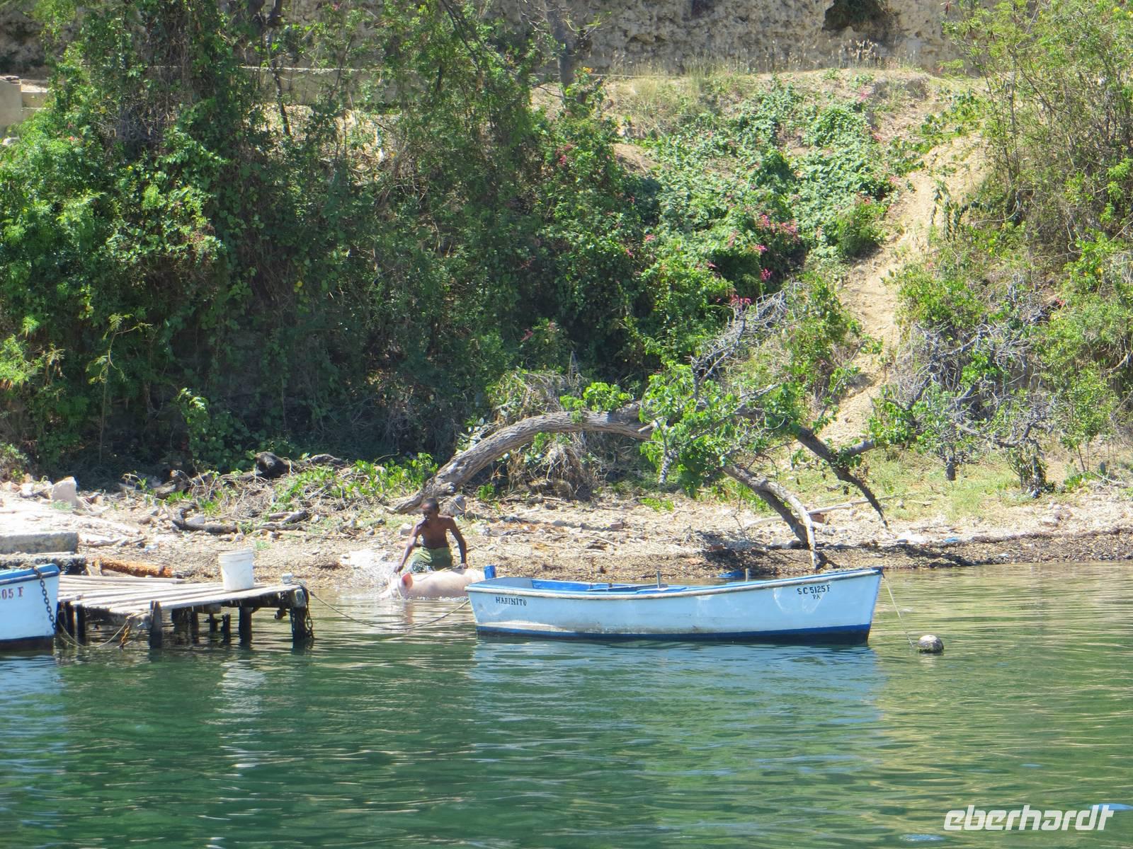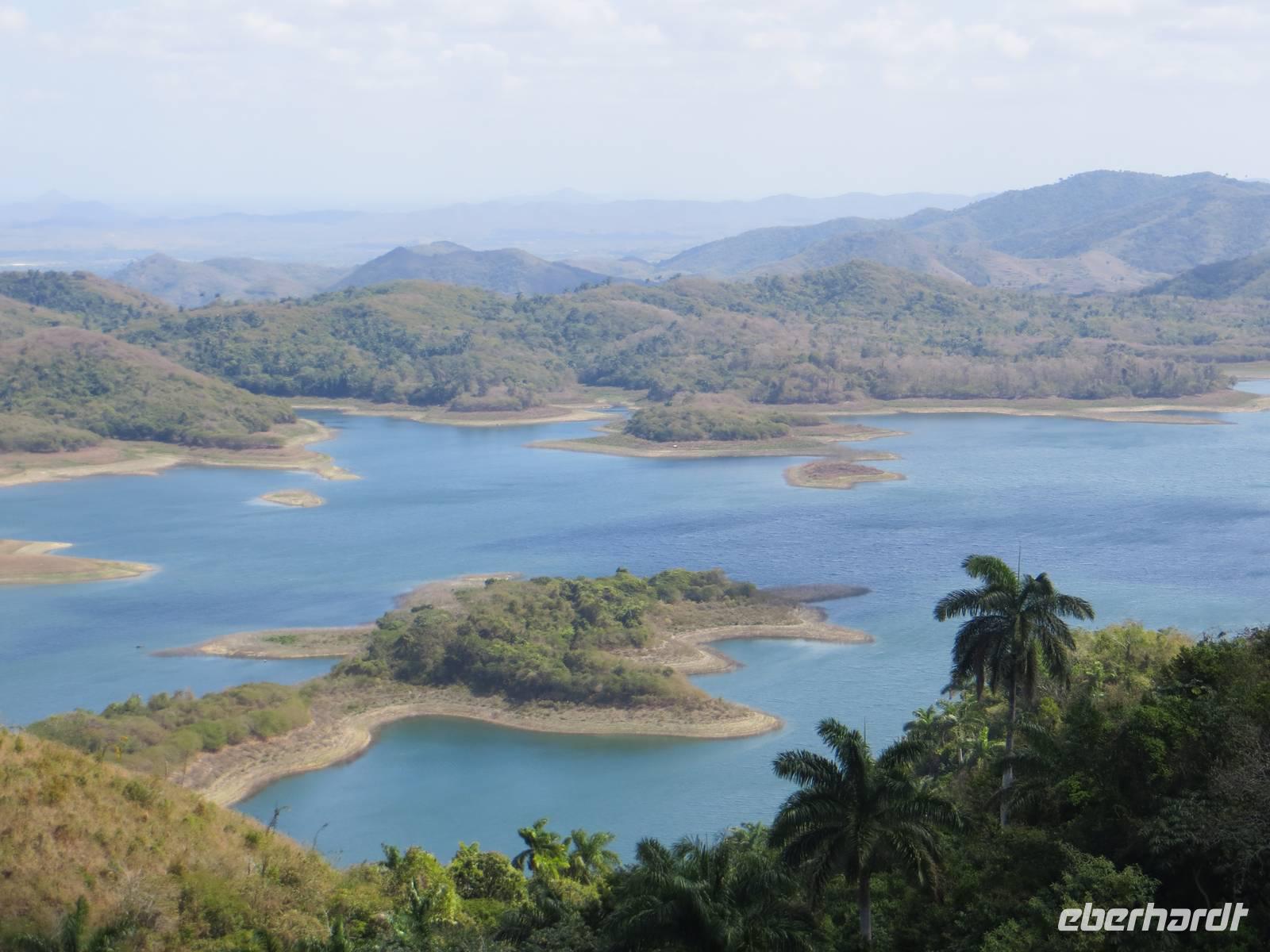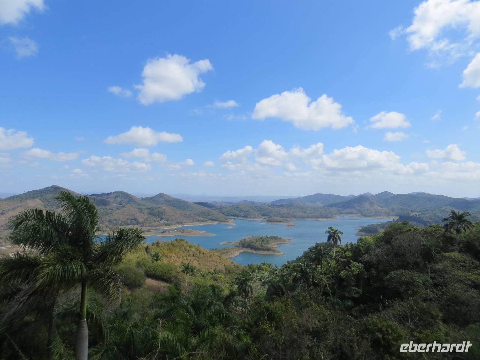 Der Lago Hanabanilla ist ein künstlich aufgestauter See und befindet sich in wunderschöner Natur der malerischen Sierra del Escambray. Dieser versorgt beide Provinzen Santa Clara und Cienfuegos mit Wasser. Ein kleines Kraftwerk erzeugt mit Wasser- und Solarengergie Strom für die Gegend. Zwar ist der Stausee ca. 24 Kilometer lang, doch an seiner breitesten Stelle nur einen Kilometer breit. Unterwegs zeigt uns Alfredo verschiedene Pflanzenarten, pflückt eine Mamay-Frucht für uns und führt uns den Lippenstiftbaum vor. Auf der Spitze ergötzen wir uns an dem grandiosen Ausblick über die Berglandschaft und den See, wie er sich fjordartig durch die grünen Berghänge schlängelt. Rückzu führt uns Alfredo zu seinen Freunden, ein paar Kleinabuern, die in einer einfachen Holzhütte am See wohnen. Abseits jeglicher Zivilisation wohnt hier ein Ehepaar mit ihren Hunden, Schweine und Hühner. Sie leben von dem, was sie anbauen (Mango, Taro (Malanga)) und vom Fischen (Bachforellen). Die Rationen, die sie vom Staat erhalten reichen kaum zum Leben. Dennoch werden wir mit so viel Herzlichkeit und Lebensfreude zum Kaffee eingeladen und verkosten rote Wasseräpfel und Cherimoyas (vom Geschmack her eine Mischung aus Ananas und Banane, aus der Anona-Familie).