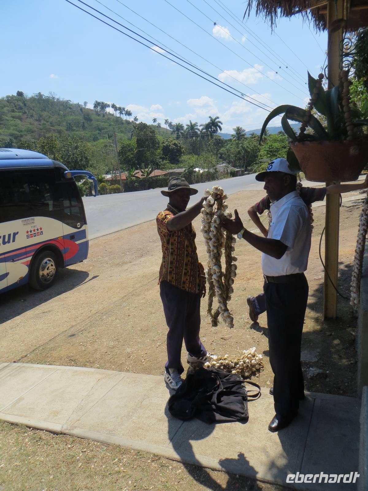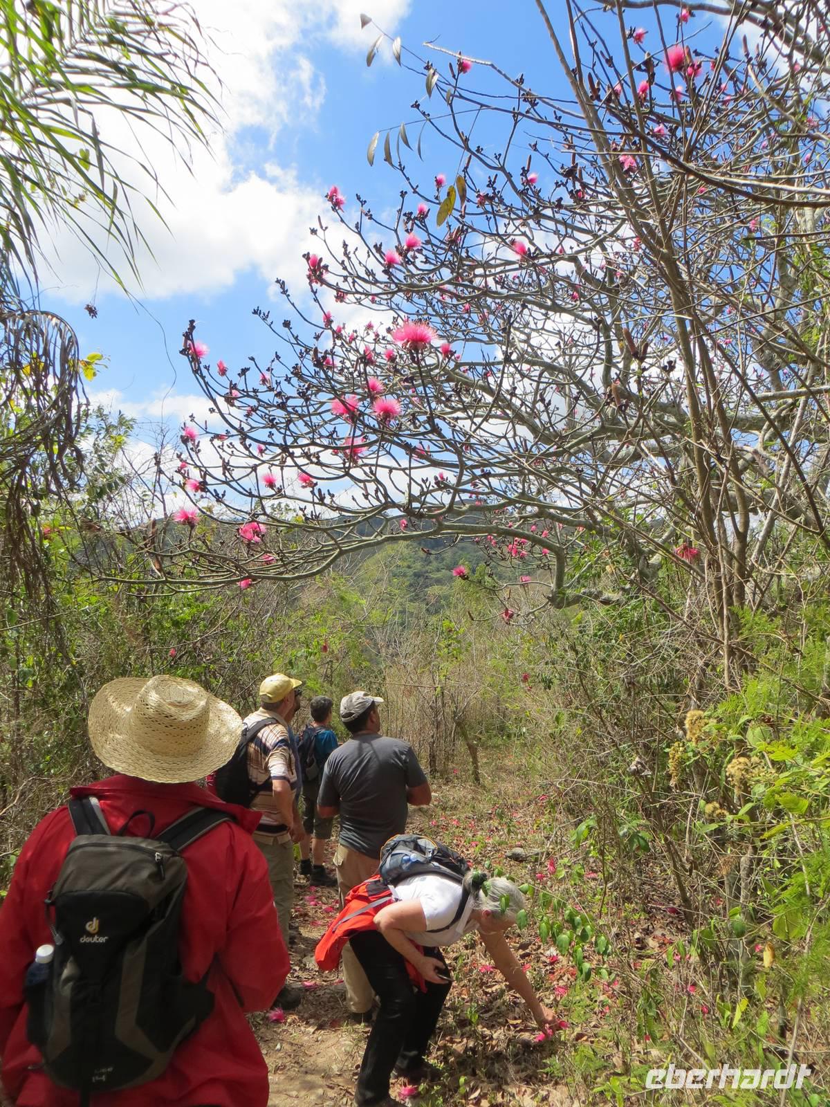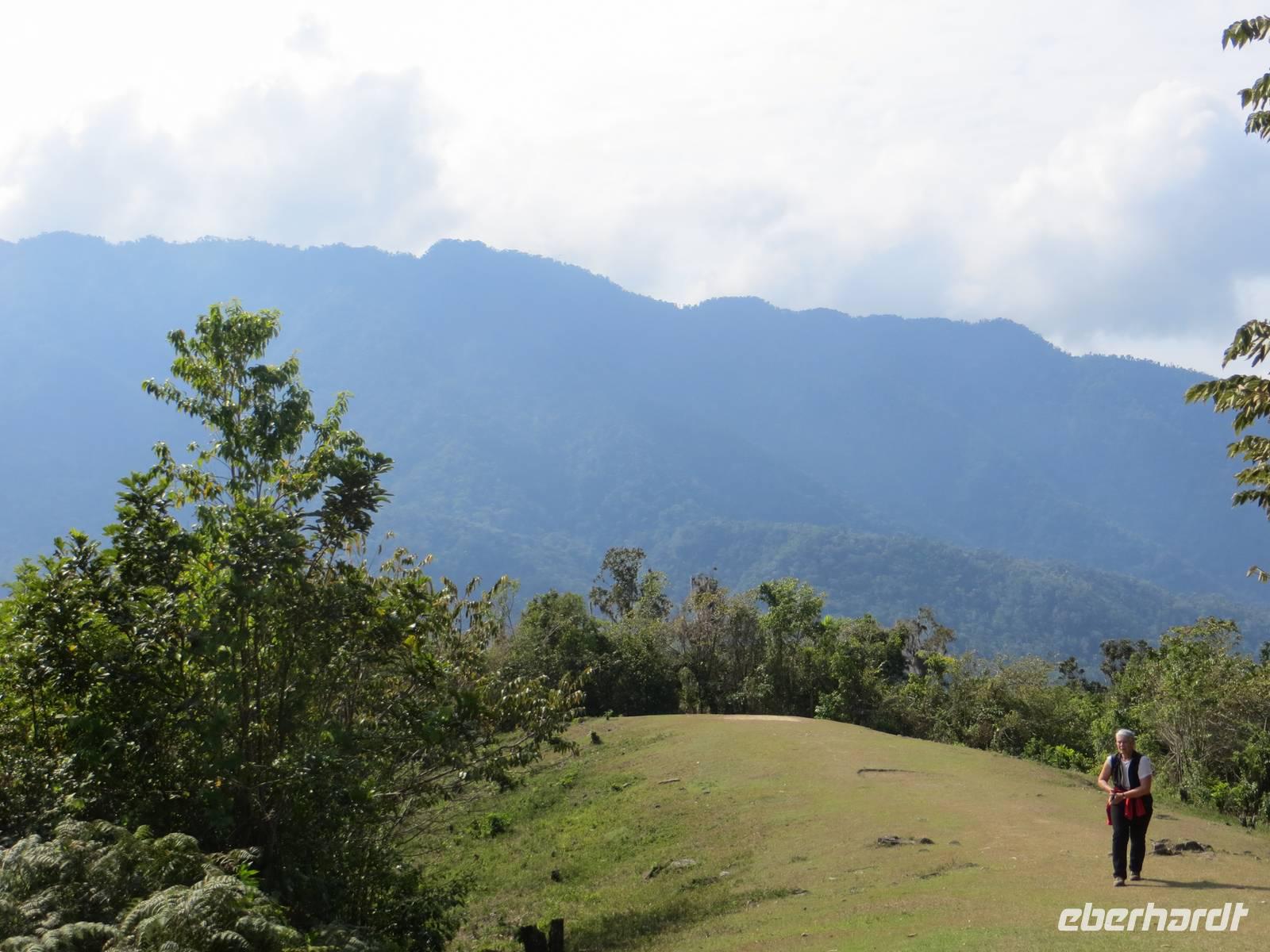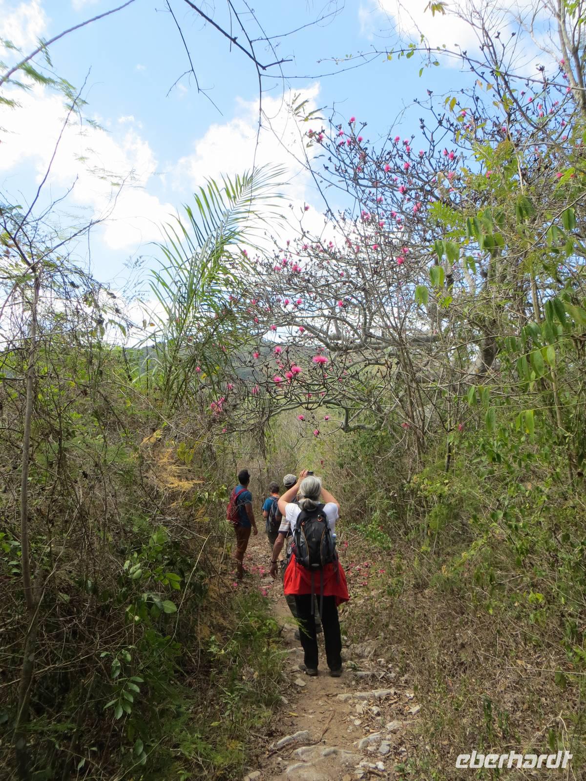 Zwei Jeeps holen uns vom Hotel ab. Unterwegs halten wir bei Villa Santo Domingo, um unseren Wanderführer und eine weitere kleine deutsche Gruppe abzuholen. Gemeinsam wollen wir die Spitze des Berges erklimmen. Zahlreiche Serpentinen und steile Pfade holpern wir in den Geländefahrzeugen bis zum Alto de Naranjo auf ca. 750 Metern über dem Meeresspiegel. Von hier aus beginnen wir unsere Wanderung.