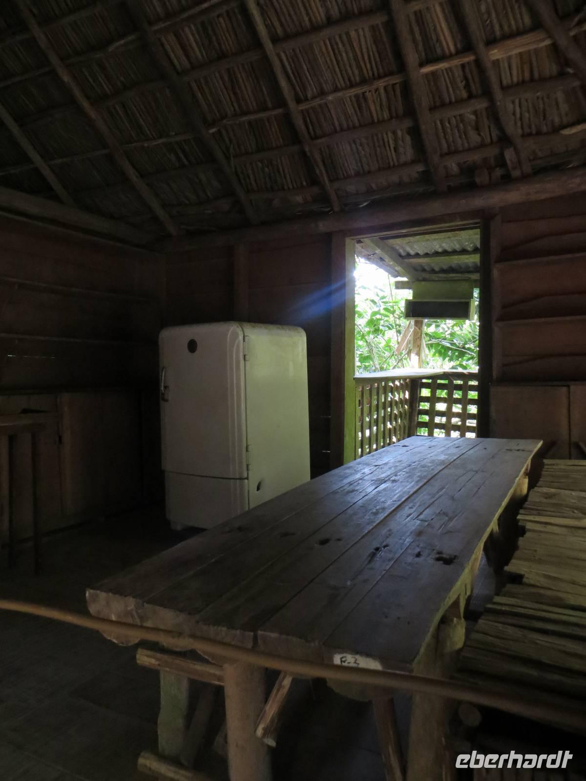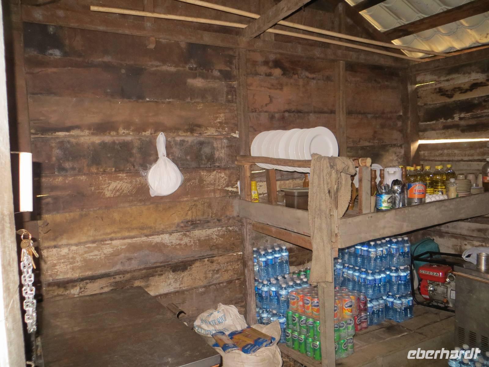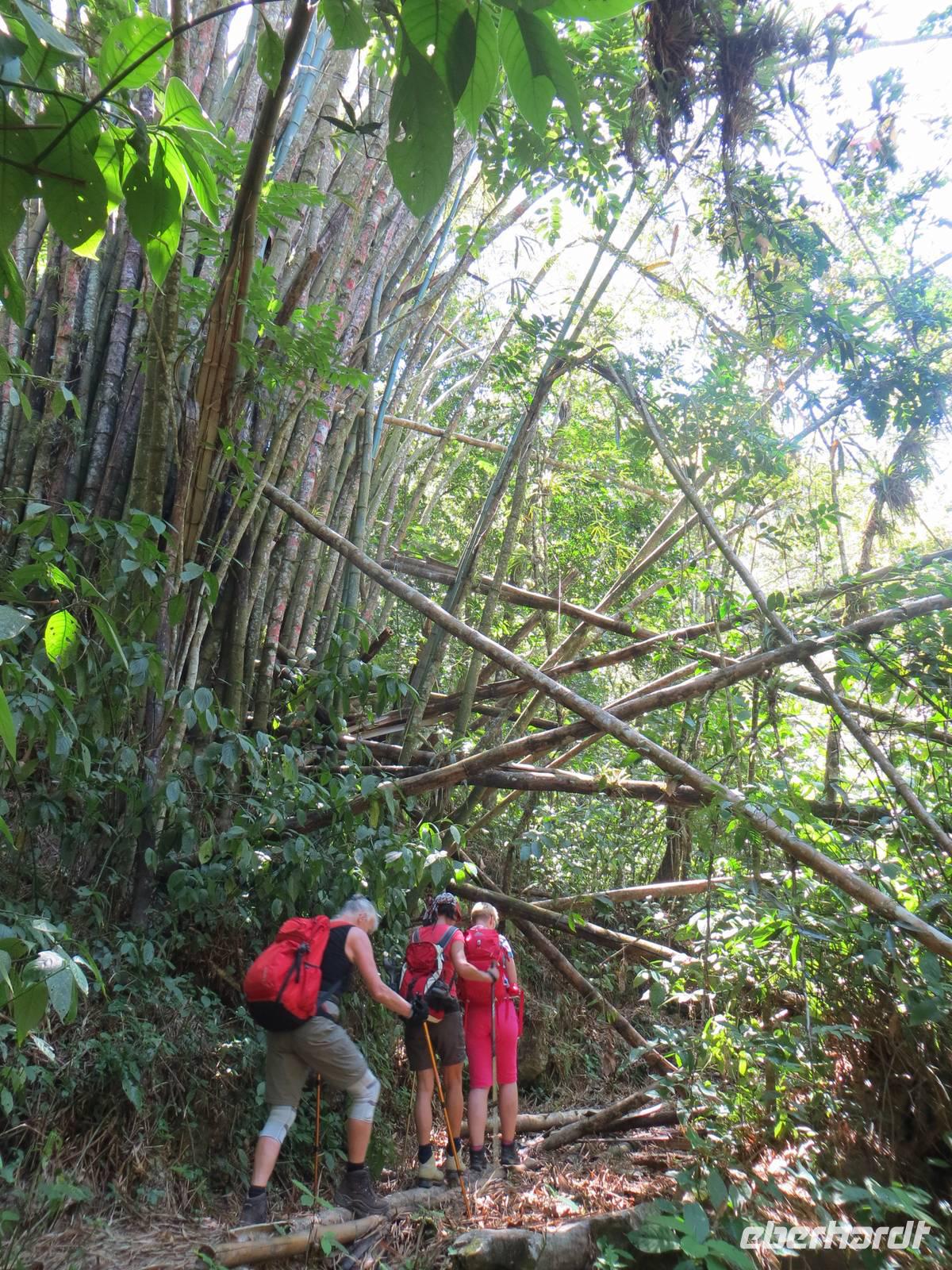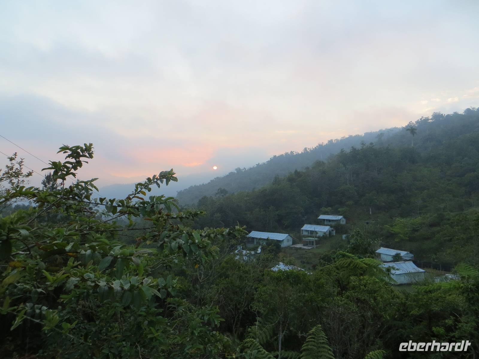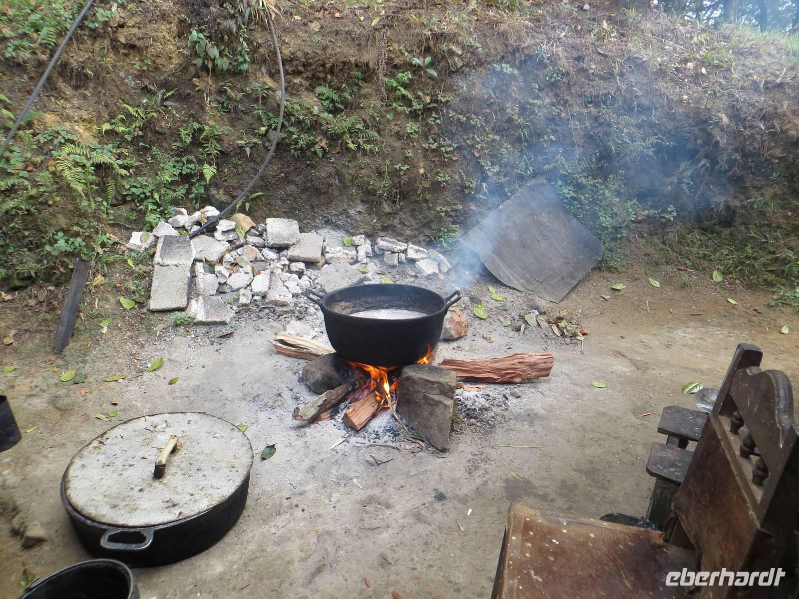 Die Ranger haben bereits für uns das Mittagessen gekocht, auf offenem Feuer: Nudelsuppe mit Reis und Zitrusblättertee. Anschließend tauschen wir unsere Eindrücke mit den anderen deutschen Gästen aus, lassen die Seele in der schönen Natur baumeln und stoßen mit kubanischem Rum auf den erfolgreichen ersten Anstieg an. In der Nacht fängt es an zu regnen. Wir können über die Blechdächer gut hören, wie es aus Eimern auf uns herabfällt.