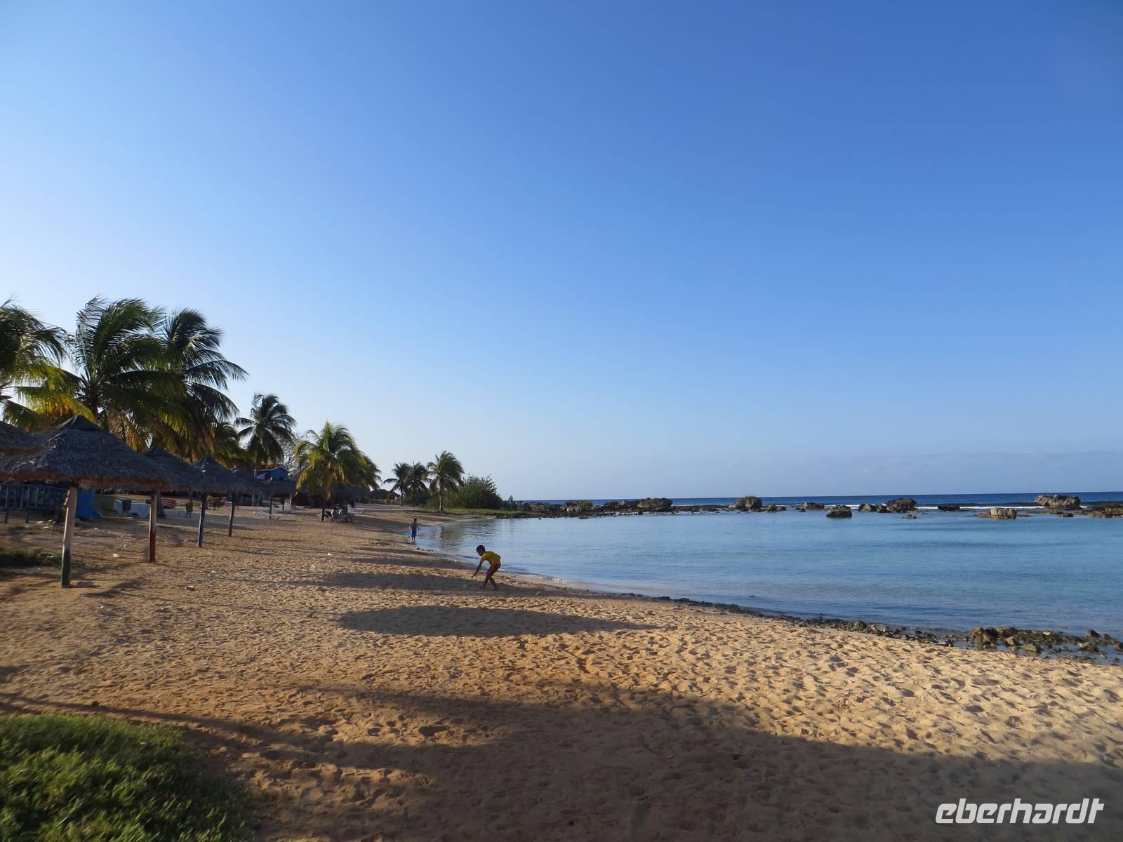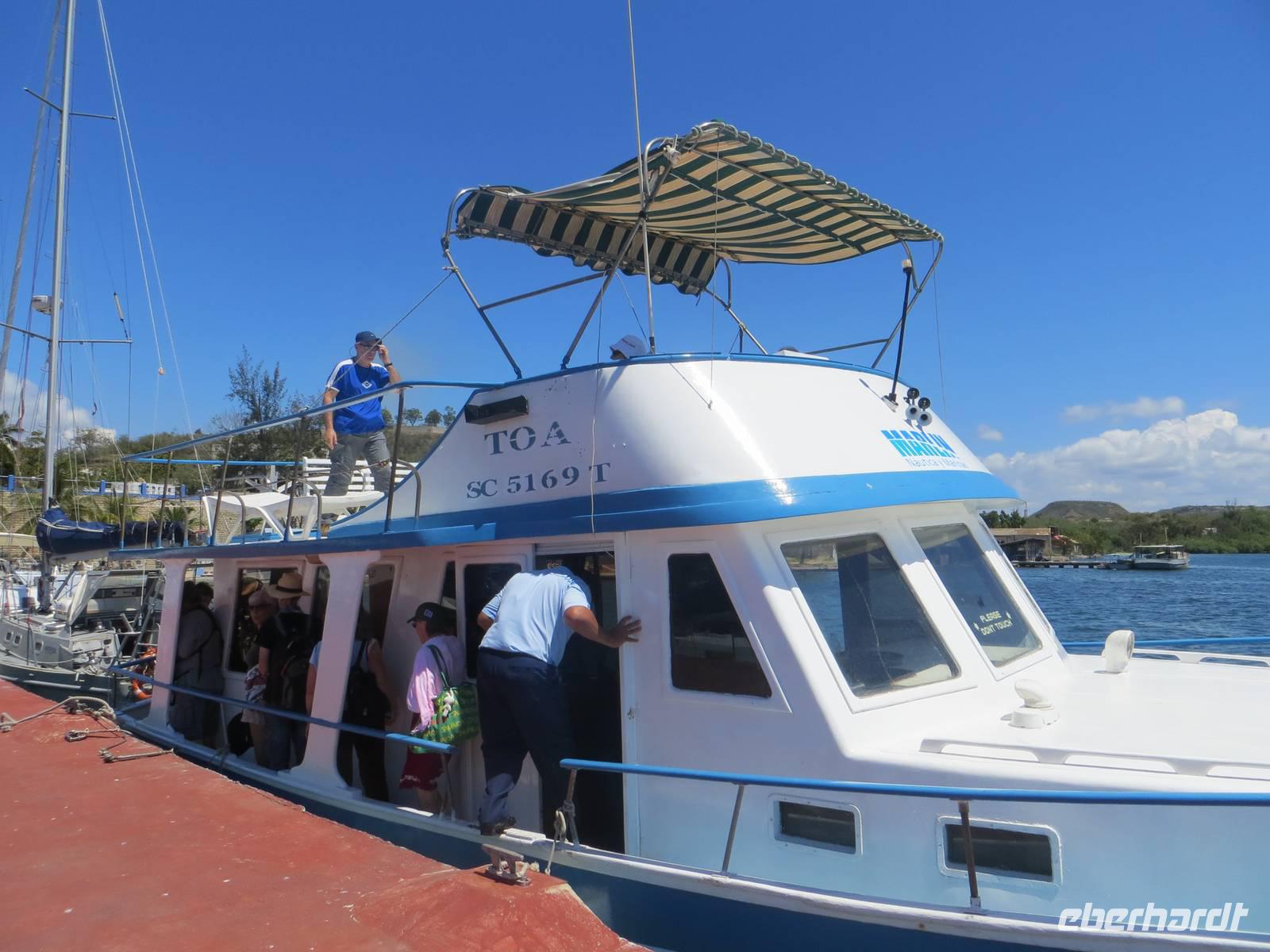 Nun wechseln wir das Transportmittel und klettern auf ein Boot, um auf eine Halbinsel zu Mittag zu essen. Typisch kubanisch wird für uns gekocht: Reis Congris (mit dunklen Bohnen), Bananen, Maniok und Schweinfleisch. Zum Schluss geht es zum Tagesende an die Küste - wir übernachten die nächsten zwei Nächte in einem All Inclusive-Hotel am Playa Ancón bei Trinidad. Während der kurzen Busfahrt spannen wir den Tag bei einem Saunagang aus, denn unsere Klimaanlage ist ausgefallen...