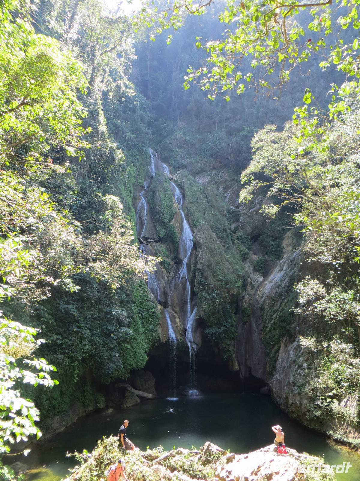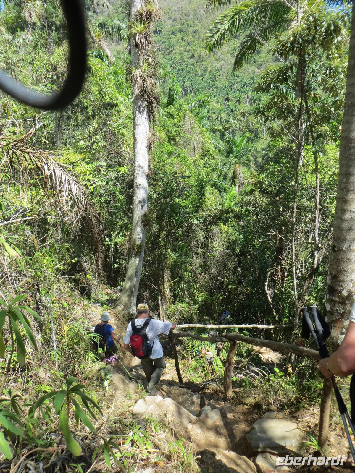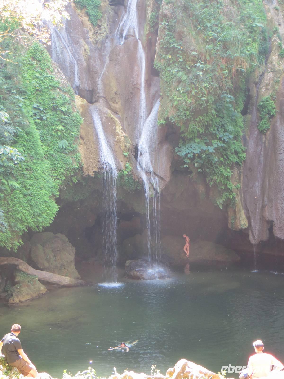 Ein aufregender Tag steht uns bevor. Die Topes de Collantes erheben sich aus der Sierra del Escambray uns sind die zweithöchste Bergkette Kubas. Mit einem umfunktionierten alten russichen LKW rasen wir die Rumpel-Bumpel-Straße hinauf bis zu einem Aussichtsturm, von dem man einen herrlichen Blick über die Bucht La Boca (der Mund) erhaschen kann. Es geht die holprige und kurvige Straße weiter bis zu einem Kurhotel. Es war als Heilanstalt für Tuberkulose bekannt gewesen. Die Ehefrau von Batista litt an dieser Krankheit und bewegte ihn dazu, dieses Sanatorium zu errichten. Es sei das beste Kurhotel für Mutter und Kind in ganz Latainamerika. Wir schmunzeln und denken uns, dass man hier im „Nirgendwo" nichts machen kann und gar keine andere Wahl hat, als gesund zu werden. Dann endlich beginnt unsere Wanderung in dem Ort Topes de Collantes. Wir treffen eine weitere deutsche Gruppe, die uns durch den Parque Cabruní begleitet. Amüsiert nehmen wir uns die ersten drei Kilometern bis zum ersten Wasserfall Salto Cabruní vor. Die anstrengenden Stufen den Berg hinauf werden mit einem schönen Blick auf den 62 Meter hohen kaskadenartigen Wasserfall belohnt. Er ergießt sich schließlich in ein Naturbecken und wir nehmen uns den Spaß, in dem kalten kristallklaren Wasser zu baden. Die nächsten drei Kilometer geht es bergab. Die steile Steigung bis zu 45% erfordern einige Konditionen. Um so erfreulicher ist dann der Anblick auf den zweiten und jetzt fast noch schöneren Wasserfall Salto de Vegas Grande. Schleierförmig stürzt das Wasser aus einer Höhe von 156 Metern hinab. Nach dem zweiten Badespaß gehen wir die letzten drei Kilometer an. Das Baden lässt unser Mägen knurren und wir freuen uns auf eine Schokoladentorte am Ende der Wanderung. Mit viel Ausdauer schaffen wir unseren leicht anspruchsvollen Fußmarsch durch den kubanischen Dschungel vorbei an Mahagoni-Bäumen, Riesenbambus und einige Bäche.
