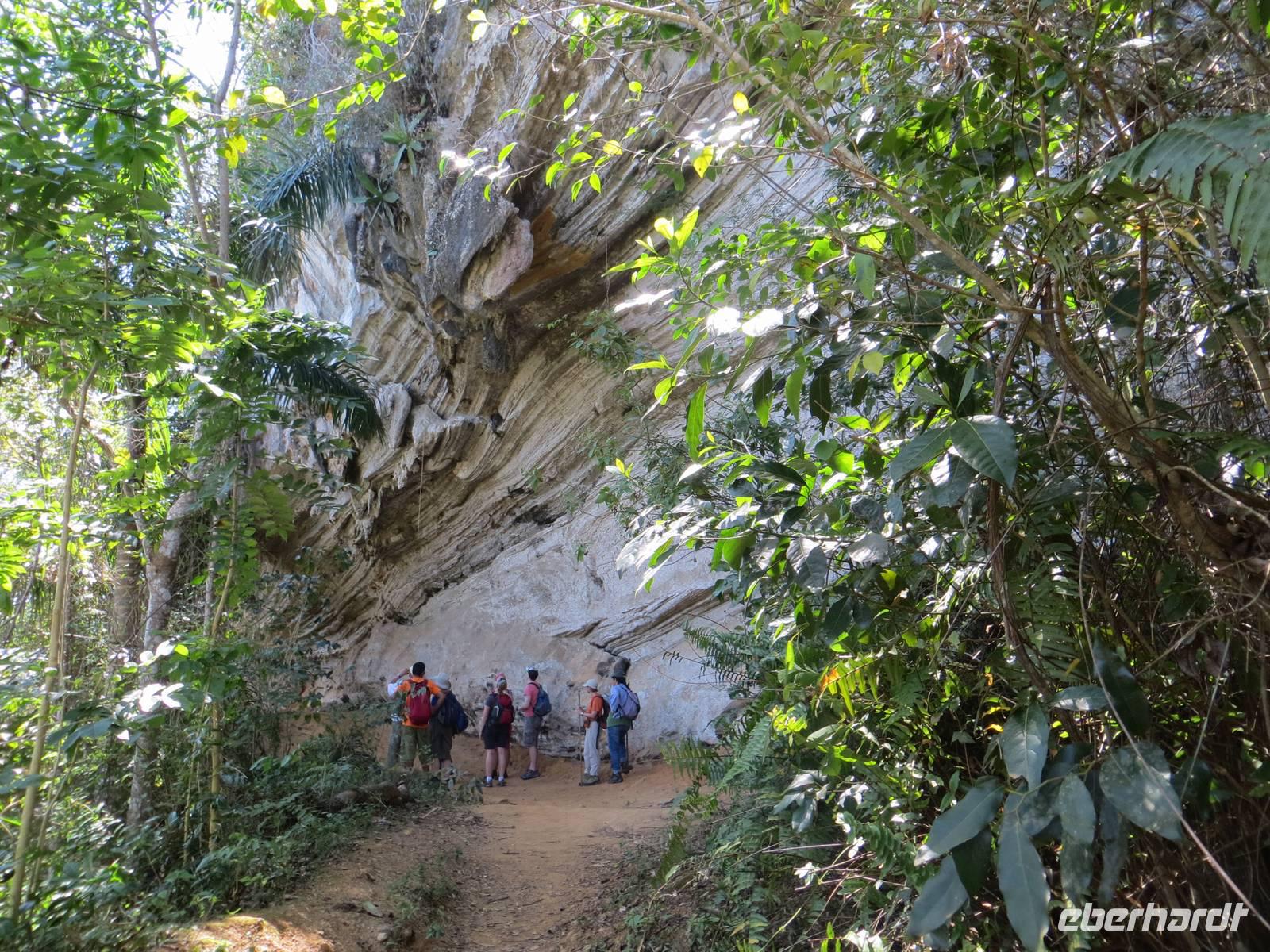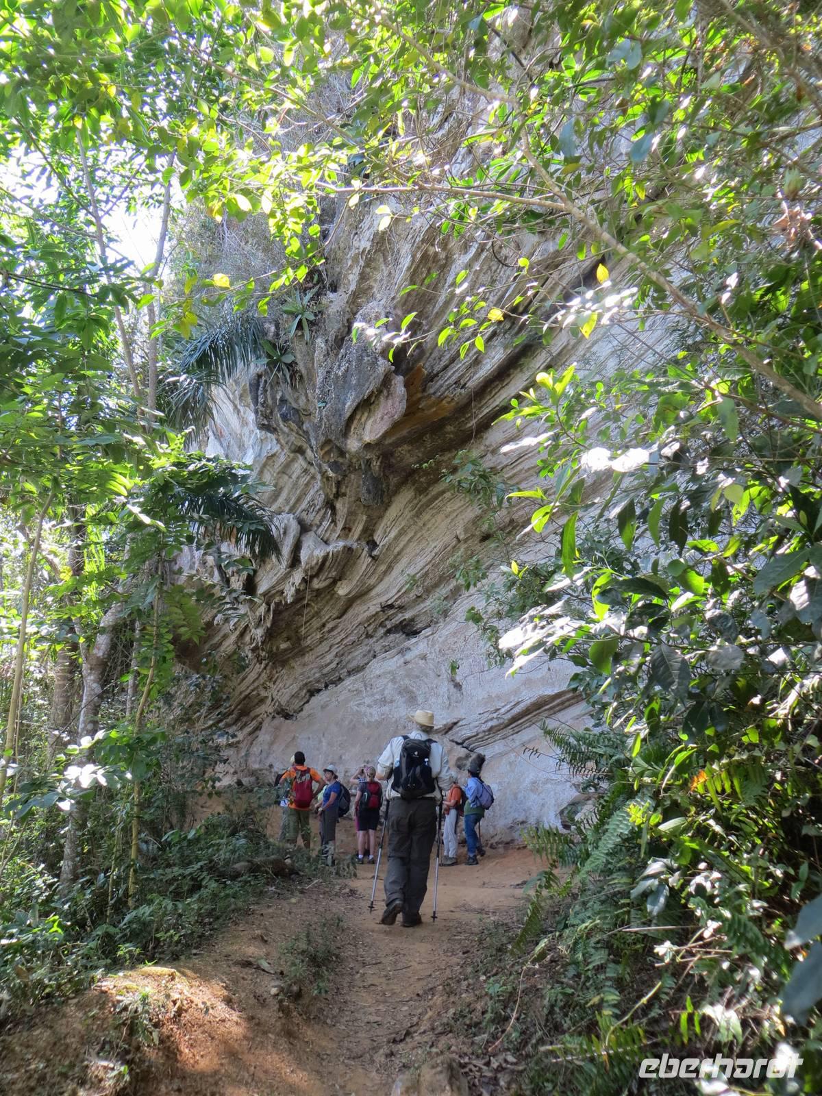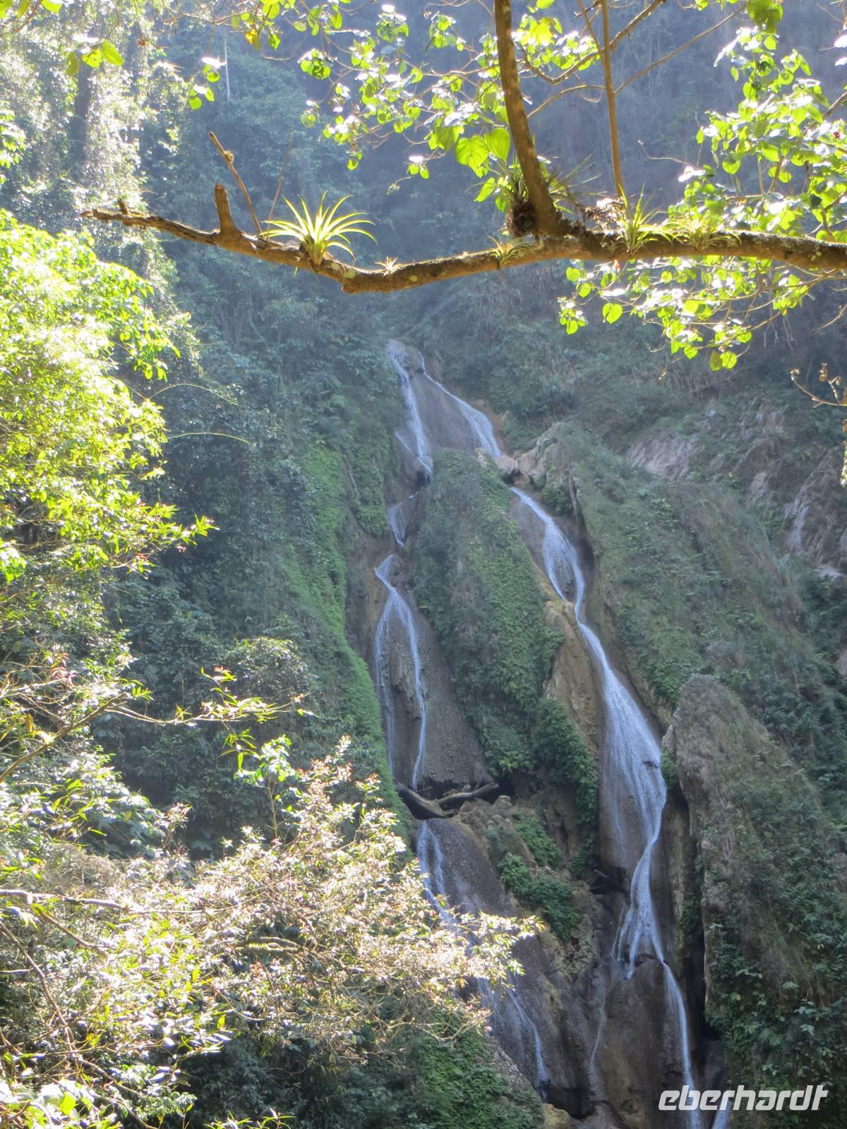 Ein aufregender Tag steht uns bevor. Die Topes de Collantes erheben sich aus der Sierra del Escambray uns sind die zweithöchste Bergkette Kubas. Mit einem umfunktionierten alten russichen LKW rasen wir die Rumpel-Bumpel-Straße hinauf bis zu einem Aussichtsturm, von dem man einen herrlichen Blick über die Bucht La Boca (der Mund) erhaschen kann. Es geht die holprige und kurvige Straße weiter bis zu einem Kurhotel. Es war als Heilanstalt für Tuberkulose bekannt gewesen. Die Ehefrau von Batista litt an dieser Krankheit und bewegte ihn dazu, dieses Sanatorium zu errichten. Es sei das beste Kurhotel für Mutter und Kind in ganz Latainamerika. Wir schmunzeln und denken uns, dass man hier im „Nirgendwo" nichts machen kann und gar keine andere Wahl hat, als gesund zu werden. Dann endlich beginnt unsere Wanderung in dem Ort Topes de Collantes. Wir treffen eine weitere deutsche Gruppe, die uns durch den Parque Cabruní begleitet. Amüsiert nehmen wir uns die ersten drei Kilometern bis zum ersten Wasserfall Salto Cabruní vor. Die anstrengenden Stufen den Berg hinauf werden mit einem schönen Blick auf den 62 Meter hohen kaskadenartigen Wasserfall belohnt. Er ergießt sich schließlich in ein Naturbecken und wir nehmen uns den Spaß, in dem kalten kristallklaren Wasser zu baden. Die nächsten drei Kilometer geht es bergab. Die steile Steigung bis zu 45% erfordern einige Konditionen. Um so erfreulicher ist dann der Anblick auf den zweiten und jetzt fast noch schöneren Wasserfall Salto de Vegas Grande. Schleierförmig stürzt das Wasser aus einer Höhe von 156 Metern hinab. Nach dem zweiten Badespaß gehen wir die letzten drei Kilometer an. Das Baden lässt unser Mägen knurren und wir freuen uns auf eine Schokoladentorte am Ende der Wanderung. Mit viel Ausdauer schaffen wir unseren leicht anspruchsvollen Fußmarsch durch den kubanischen Dschungel vorbei an Mahagoni-Bäumen, Riesenbambus und einige Bäche.
