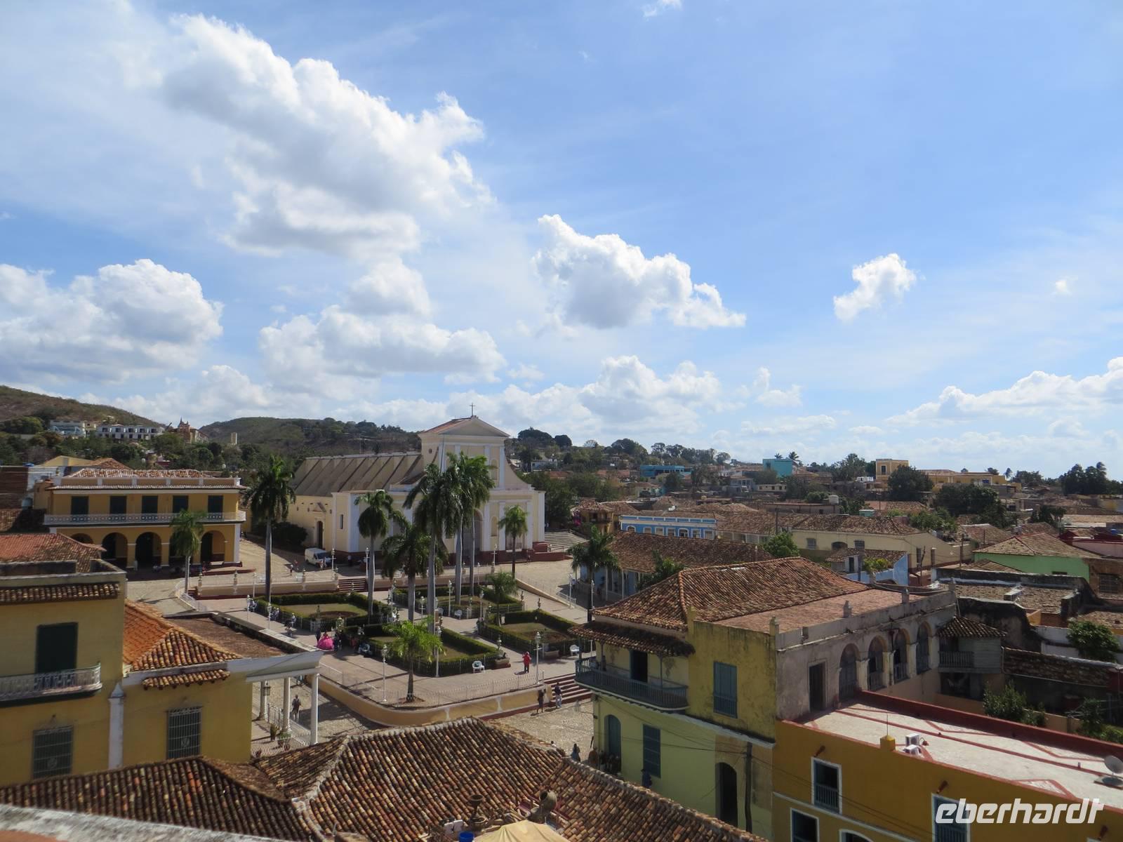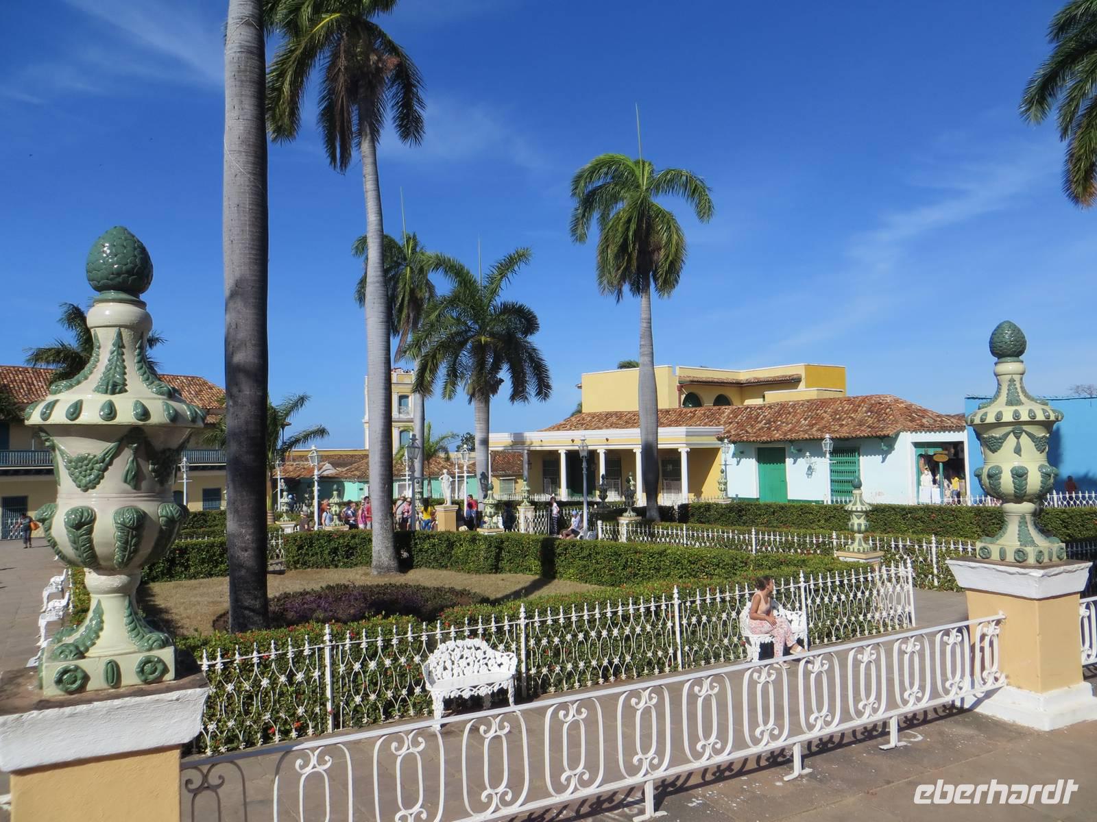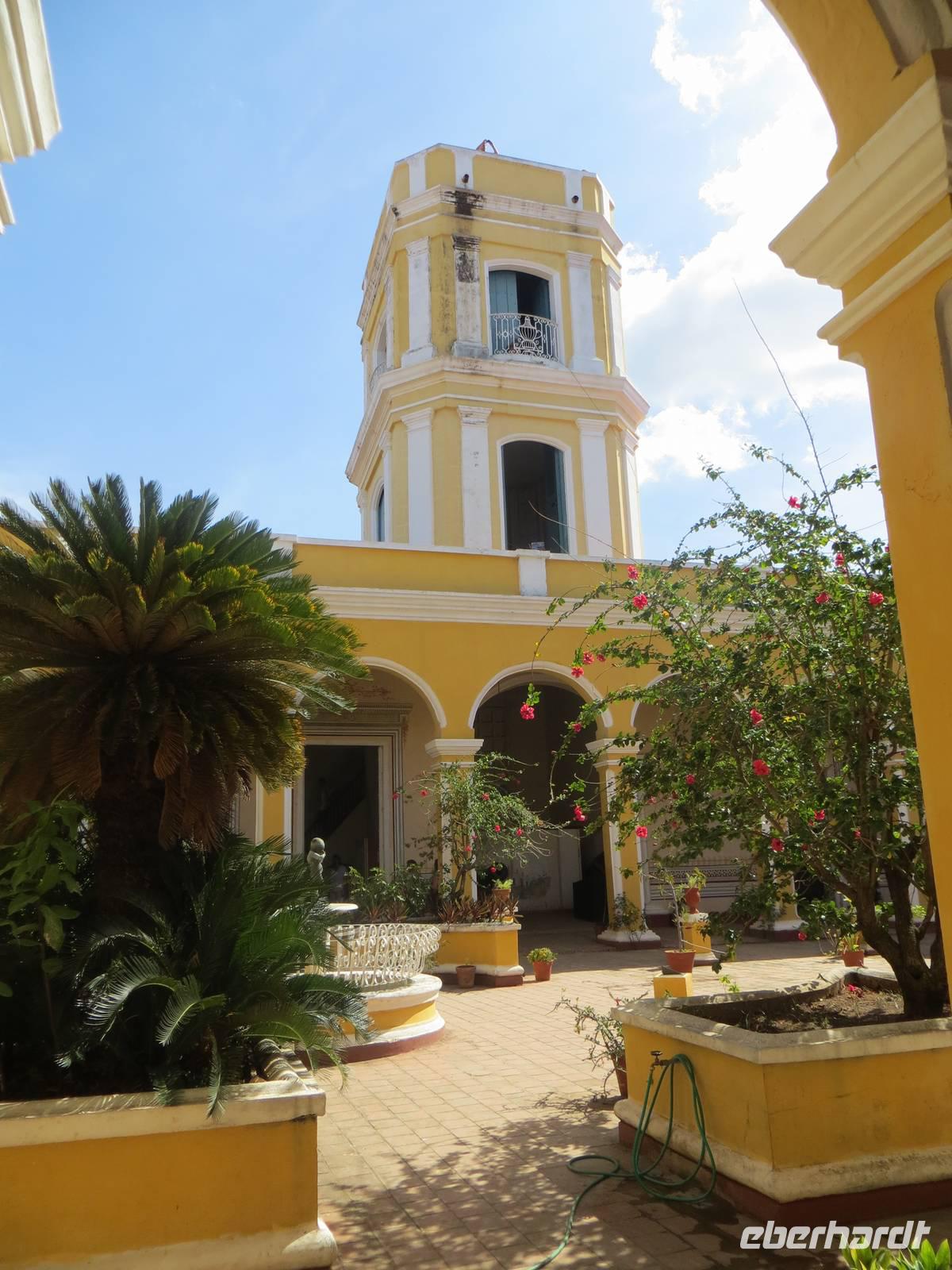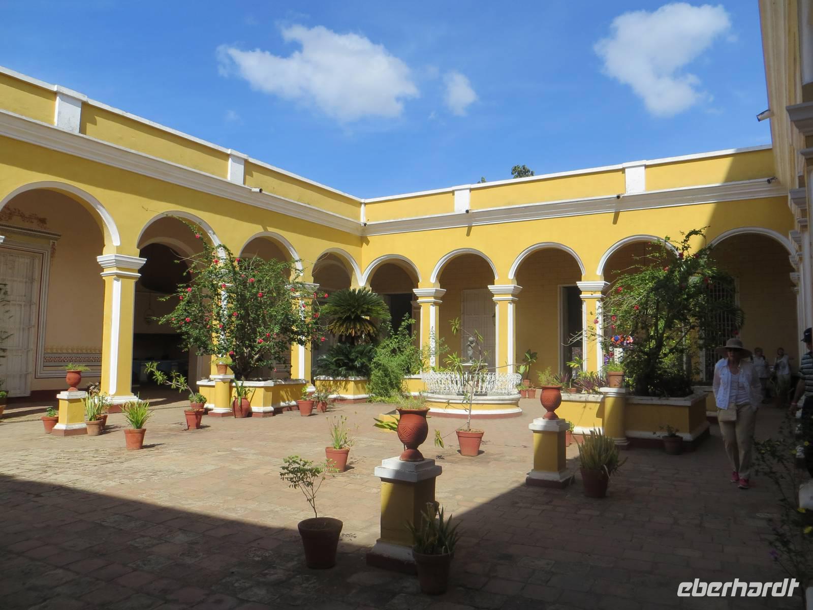 Die ehemaligen Paläste am Plaza Mayor behergen heutzutage das Kunstmuseum, Museo Romantico und Museo Municipal. Wir besuchen die edlen Räumlichkeiten wie auch den hübschen Innenhof des Museo Municipal (im Palacio Cantero), welches uns die Stadtgeschichte vermitteln. Cantero war Arzt und Besitzer von sechs Zuckerfabriken. Wir sehen, in welchem Luxus er gelebt hat. Unsere Münder formen ein erstauntes O beim Anblick der kunstvollen Fenster, Zedernholzdecken, Mamorfußböden, Säulen und Fresken italienischer Künstler sowie der reizvollen Mahagoni-Möbel im kubanischen Imperio-Stil. Anti-Spanien-Pamphlete dokumentieren die Unabhängigkeitskriege. Wir folgen den schmalen Stufen auf den Turm des Palastes und genießen einen herrlichen Ausblick auf die malerischen Gassen, begrünten Innenhöfe und orange-gelben Ziegeldächern Trinidads.