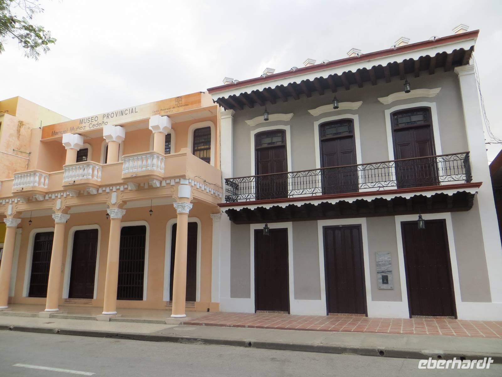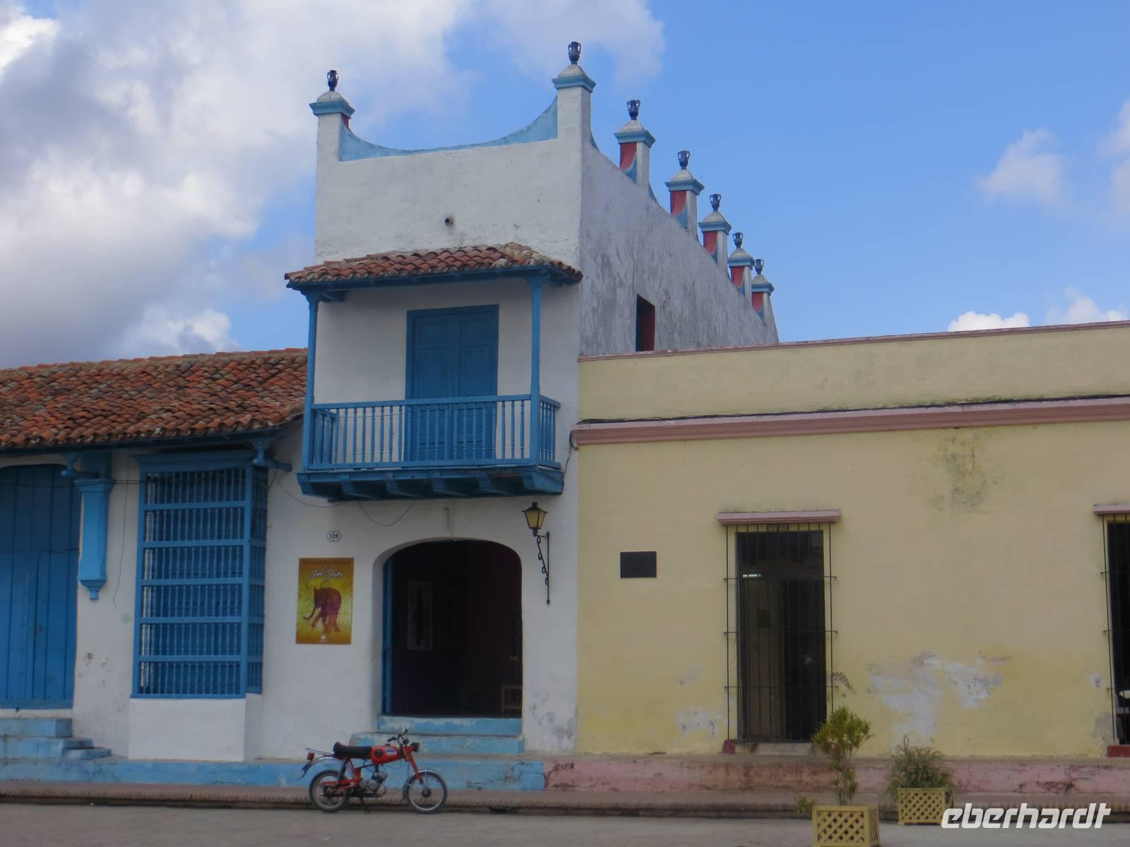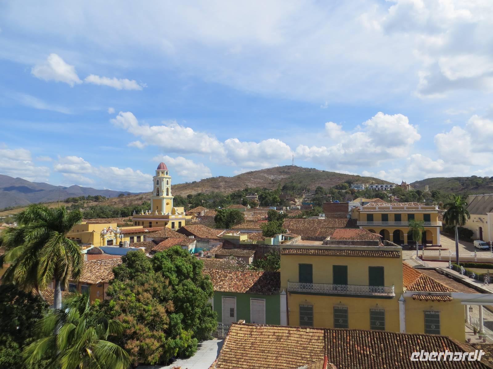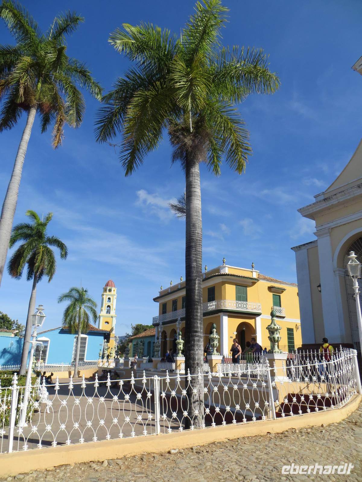 Die ehemaligen Paläste am Plaza Mayor behergen heutzutage das Kunstmuseum, Museo Romantico und Museo Municipal. Wir besuchen die edlen Räumlichkeiten wie auch den hübschen Innenhof des Museo Municipal (im Palacio Cantero), welches uns die Stadtgeschichte vermitteln. Cantero war Arzt und Besitzer von sechs Zuckerfabriken. Wir sehen, in welchem Luxus er gelebt hat. Unsere Münder formen ein erstauntes O beim Anblick der kunstvollen Fenster, Zedernholzdecken, Mamorfußböden, Säulen und Fresken italienischer Künstler sowie der reizvollen Mahagoni-Möbel im kubanischen Imperio-Stil. Anti-Spanien-Pamphlete dokumentieren die Unabhängigkeitskriege. Wir folgen den schmalen Stufen auf den Turm des Palastes und genießen einen herrlichen Ausblick auf die malerischen Gassen, begrünten Innenhöfe und orange-gelben Ziegeldächern Trinidads.