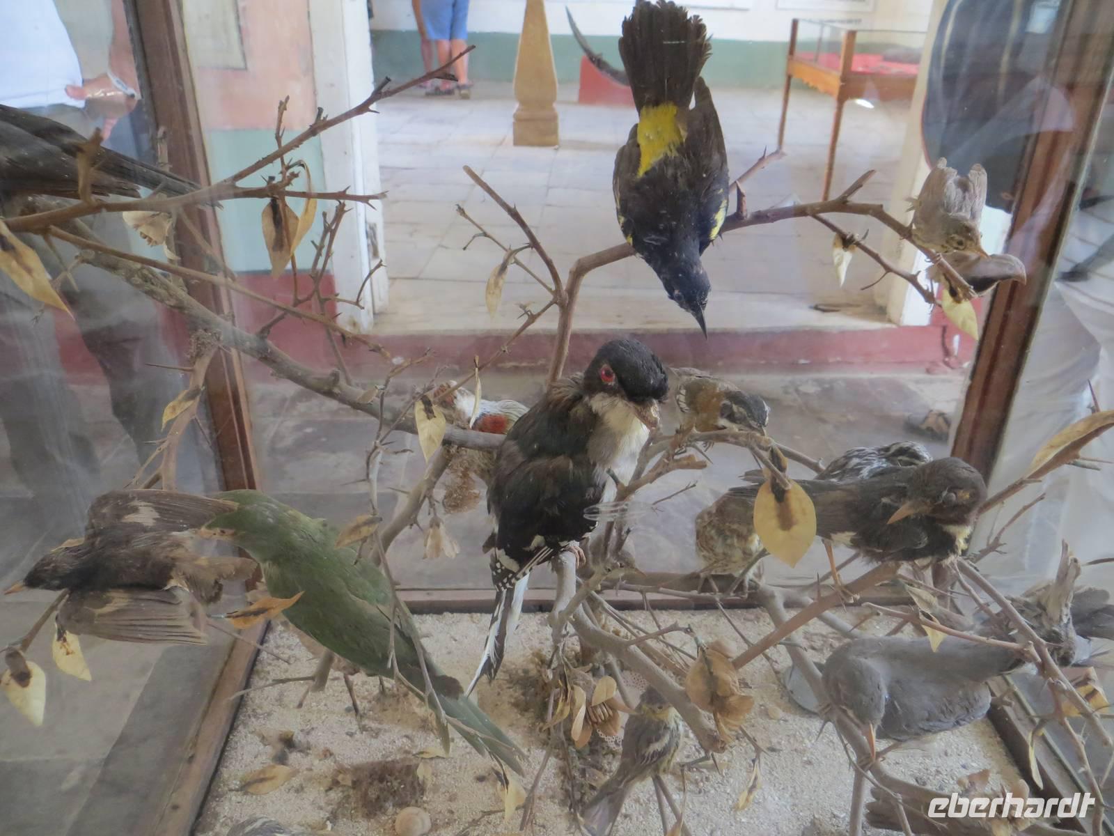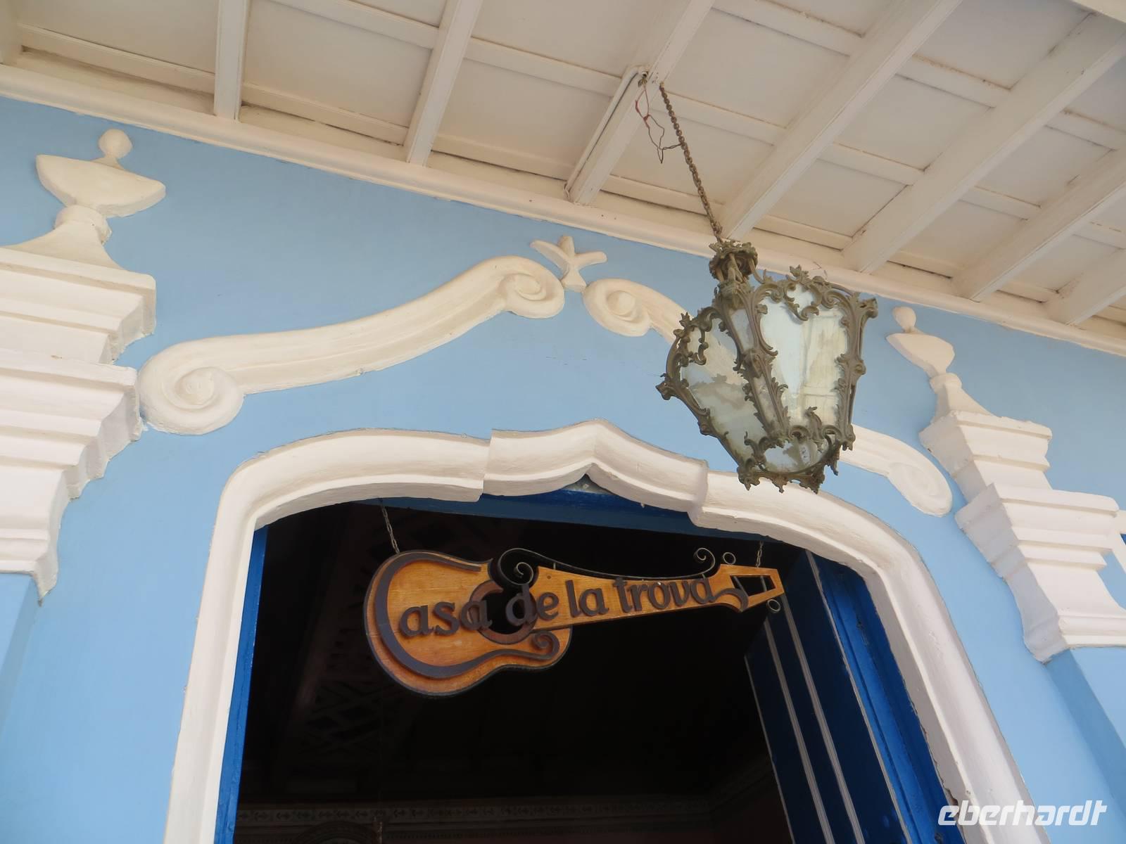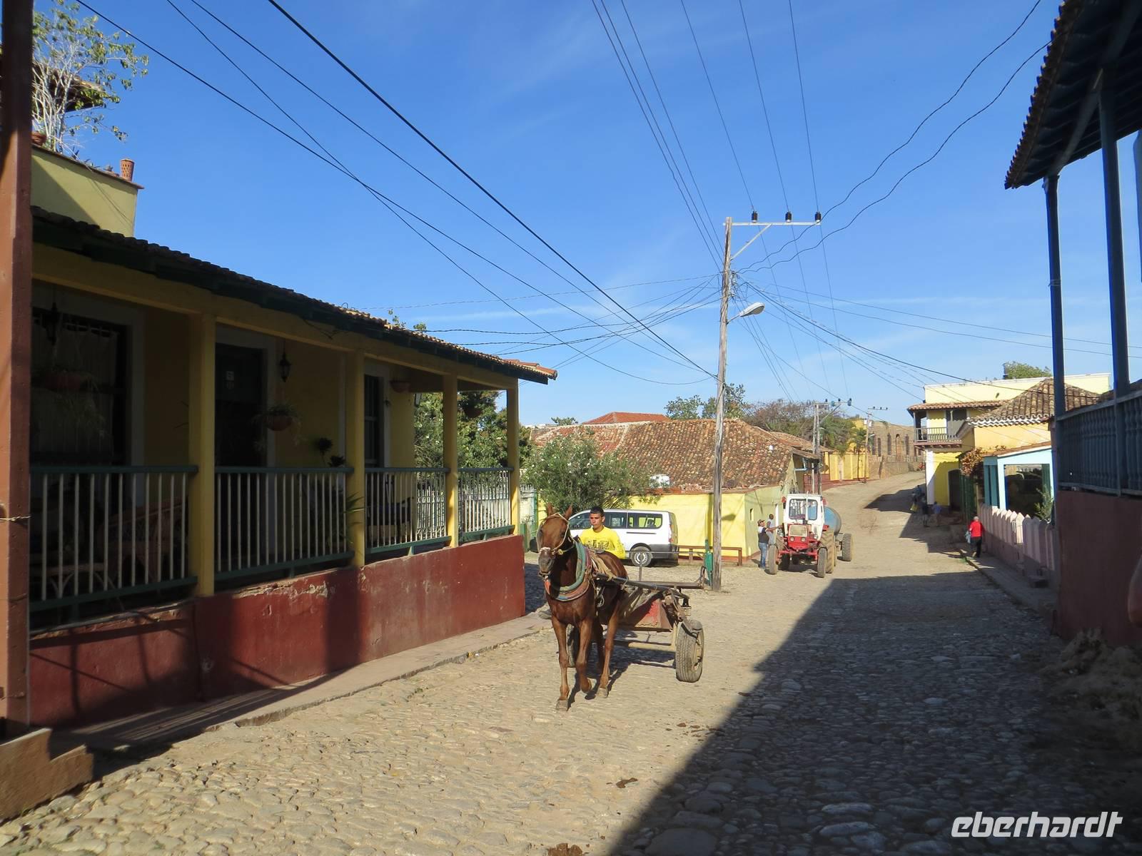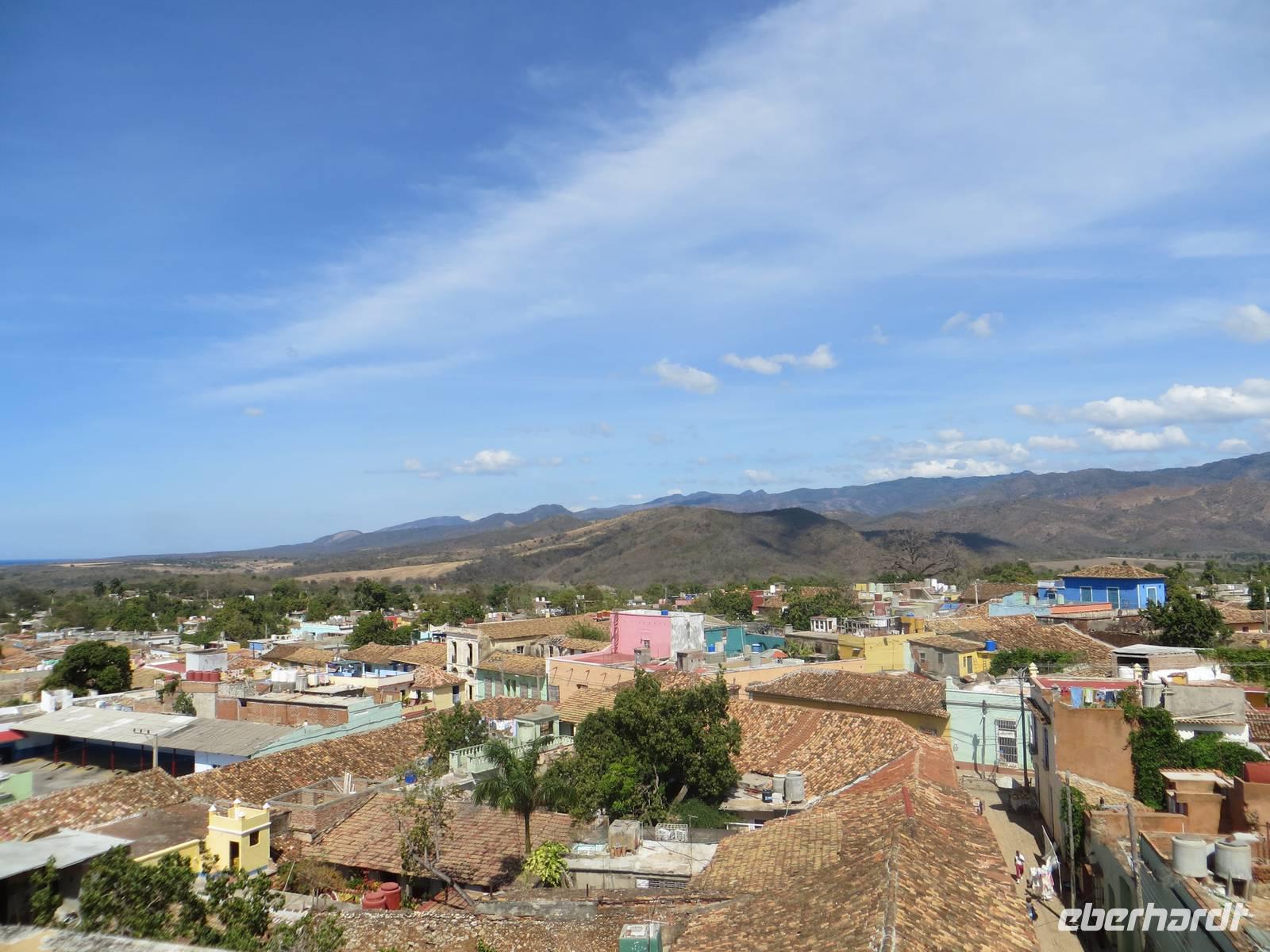 Die ehemaligen Paläste am Plaza Mayor behergen heutzutage das Kunstmuseum, Museo Romantico und Museo Municipal. Wir besuchen die edlen Räumlichkeiten wie auch den hübschen Innenhof des Museo Municipal (im Palacio Cantero), welches uns die Stadtgeschichte vermitteln. Cantero war Arzt und Besitzer von sechs Zuckerfabriken. Wir sehen, in welchem Luxus er gelebt hat. Unsere Münder formen ein erstauntes O beim Anblick der kunstvollen Fenster, Zedernholzdecken, Mamorfußböden, Säulen und Fresken italienischer Künstler sowie der reizvollen Mahagoni-Möbel im kubanischen Imperio-Stil. Anti-Spanien-Pamphlete dokumentieren die Unabhängigkeitskriege. Wir folgen den schmalen Stufen auf den Turm des Palastes und genießen einen herrlichen Ausblick auf die malerischen Gassen, begrünten Innenhöfe und orange-gelben Ziegeldächern Trinidads.
