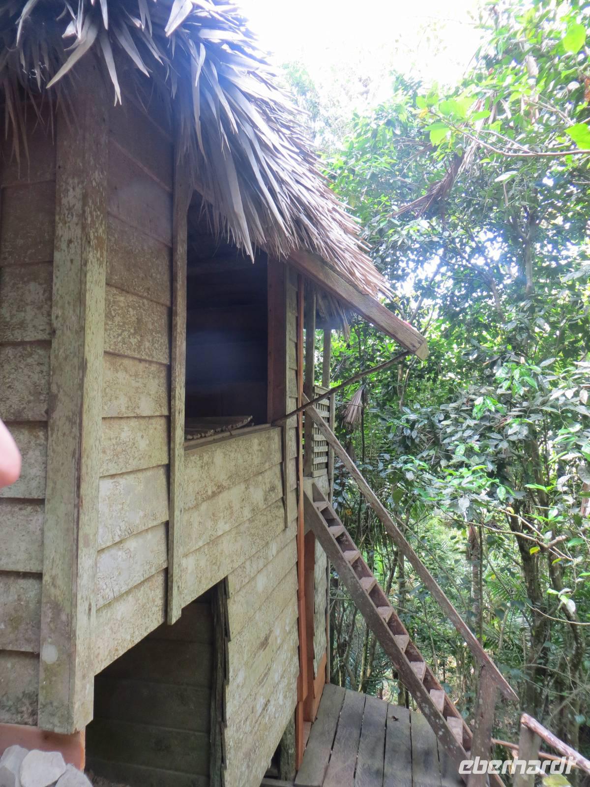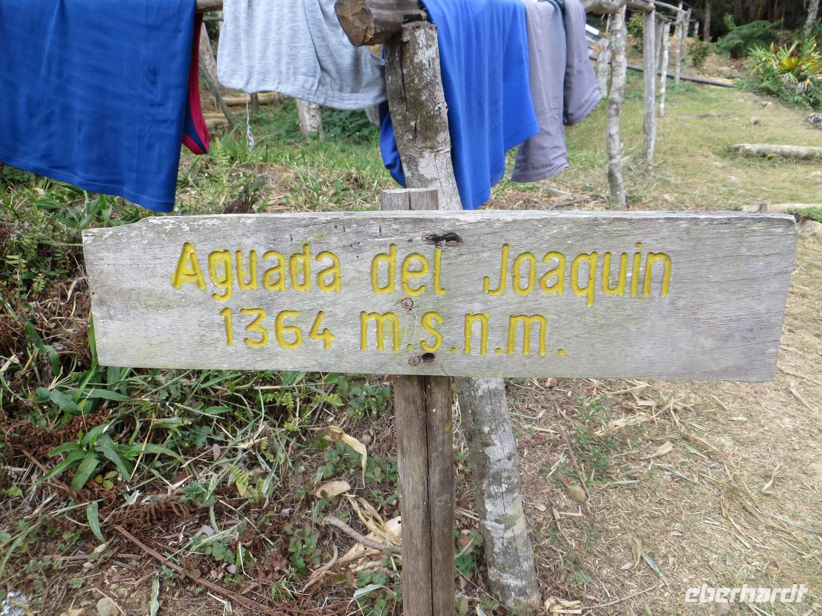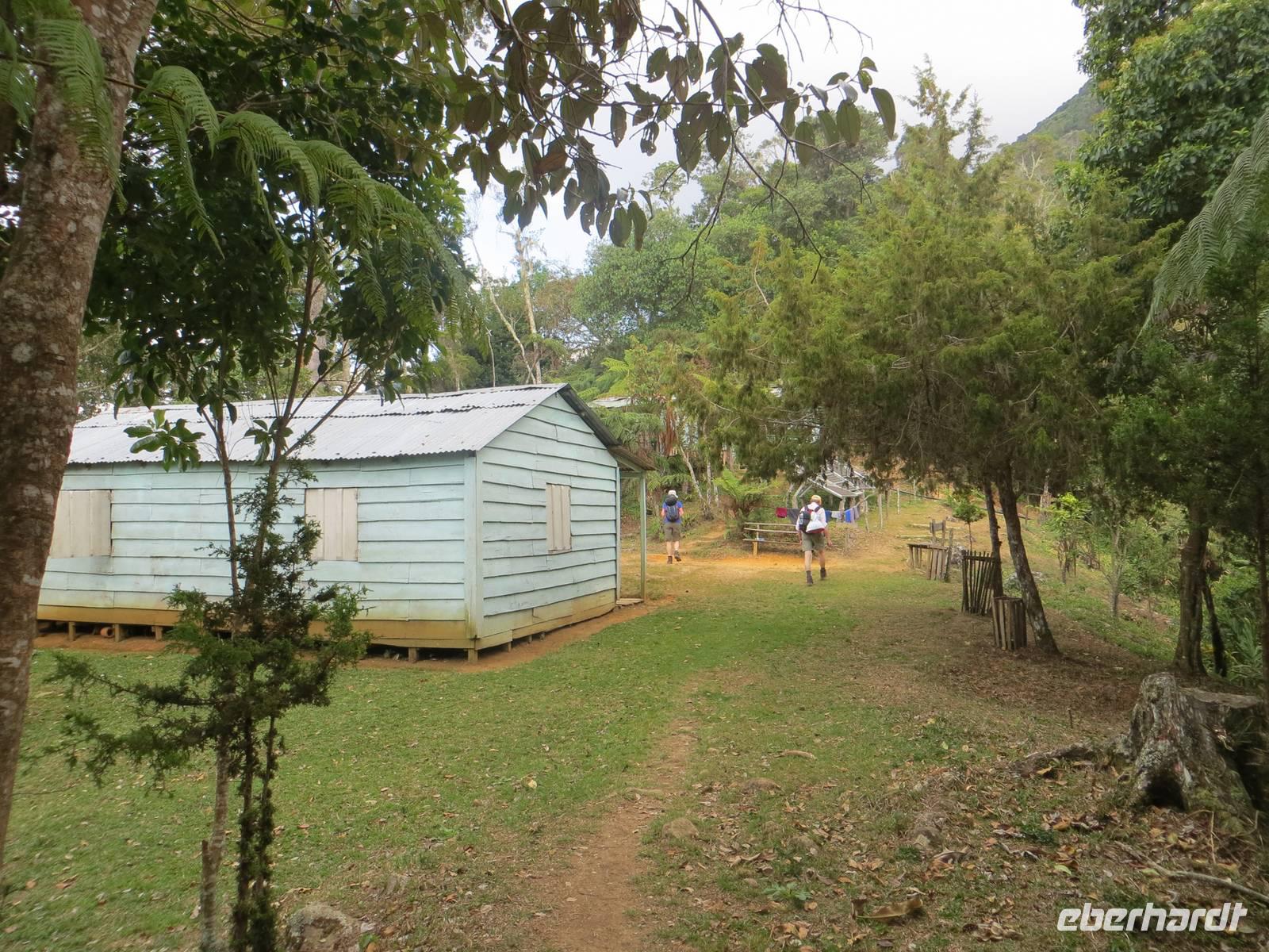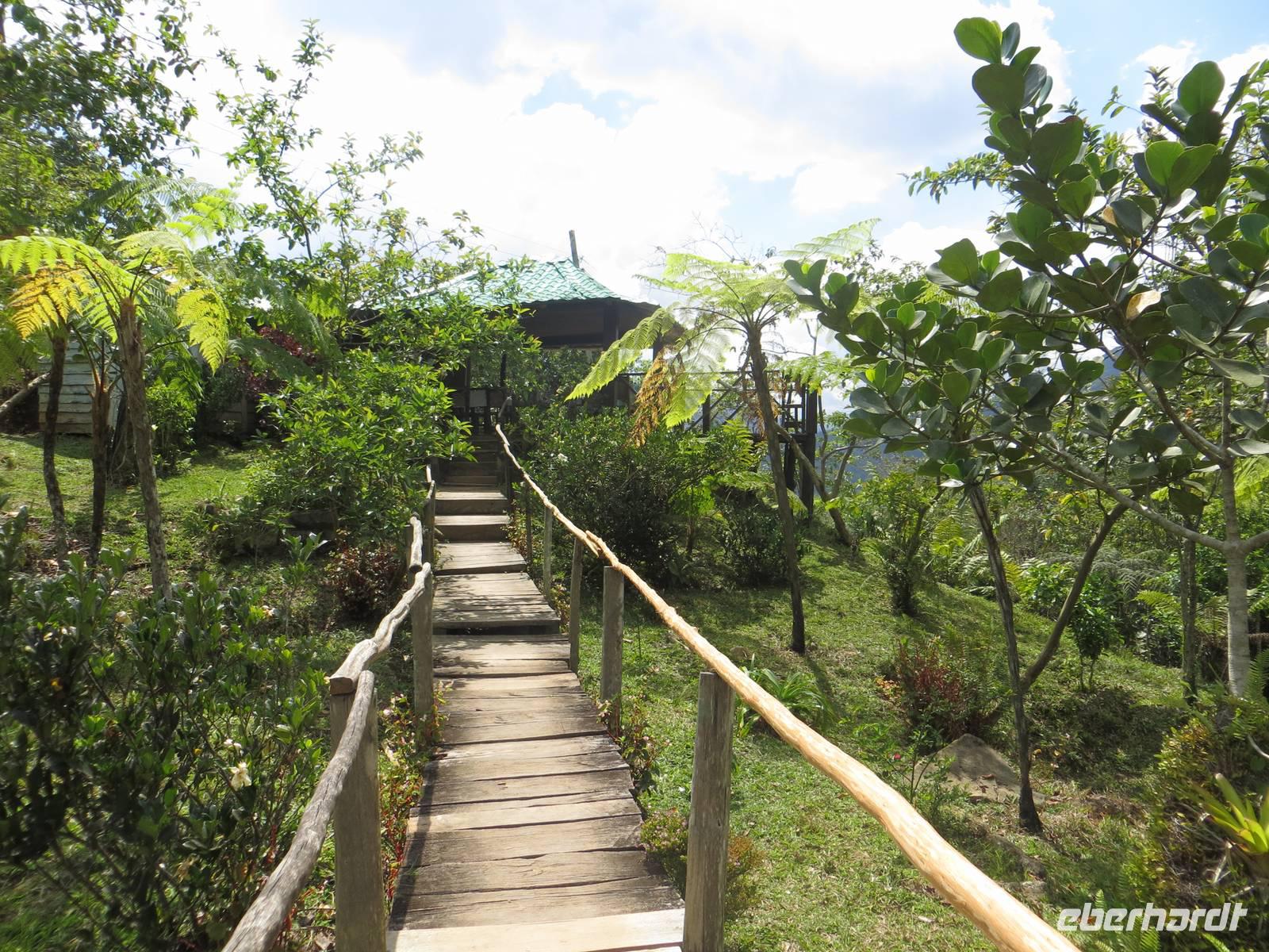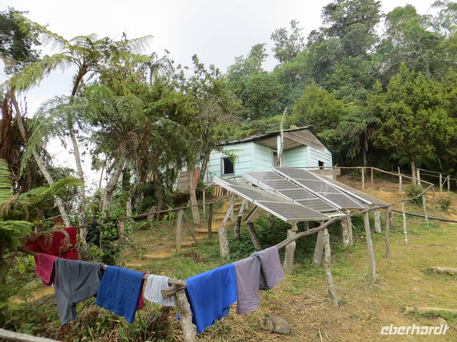 Der erste Teil des Weges ist angenehm zu gehen. Nur ein paar Meter hinter der Passhöhe Alto de Naranjo wird er anspruchsvoller, die Anstiege wesentlich steiler und der Wald undurchdringlich. Die Wege sind steil und nicht breiter als ein Esel. Wir schlängeln uns durch ein Labyrinth aus Palmen, Riesenbambus, Farnen und Wurzeln und klettern über umgestürzte Bäume. Es ist heiß, denn durch den dichten Dschungel weht kaum ein Wind. Man hat das Gefühl, er saugt die Geräusche auf wie ein Schwamm. Nur das Waten der Füße im Morast und Zwitschern der Vögel sind zu hören. Am Abend zuvor haben wir unseren Trinkproviant aufgestockt. Das ist bei 30 °C und 80 % Luftfeuchtigkeit sehr wichtig - auch wenn wir eine Menge zu tragen hatten, war es gut nicht am Wasser gespart zu haben! Es sind nur acht Kilometer über 400 Höhenmetern, doch irgendwie auch die längsten acht Kilometer, die wir bisher kennen. Wir haben das Gefühl, die Höhenmeter vielmals erneut hoch und runter zu wandern. Unser lokaler Wanderführer und Alien, die zur Hochsaison bis zu 6 Mal die Woche den Berg hinaufsteigen, scheinen den Berg mühelos hochzugleiten, während wir total aus der Puste sind und ganz schön ins Schwitzen kommen. Doch die wundervoll unberührter Natur und die herrlichen Ausblicke, die wir in den vielen kurzen Verschnaufpausen genießen, sind jede Mühe wert! Stufe für Stufe mühen wir uns den Berg hinauf bis zur Waldstation Aguada de Joaquin auf knapp 1.400 Metern. Wir sehen zwei Hütten: eine mit mehreren Doppelstockbetten, wo wir unsere Nacht verbringen werden und eine andere, mit Küche, Wohn- und Esszimmer der Ranger. Die Hütten und sanitären Einrichtungen sind sehr, sehr einfach. Per Funkgerät hat man Verbindung ins Tal. Es gibt sogar Solarpanels - diese sind für den Betrieb des obligatorischen Fernsehers wichtig.