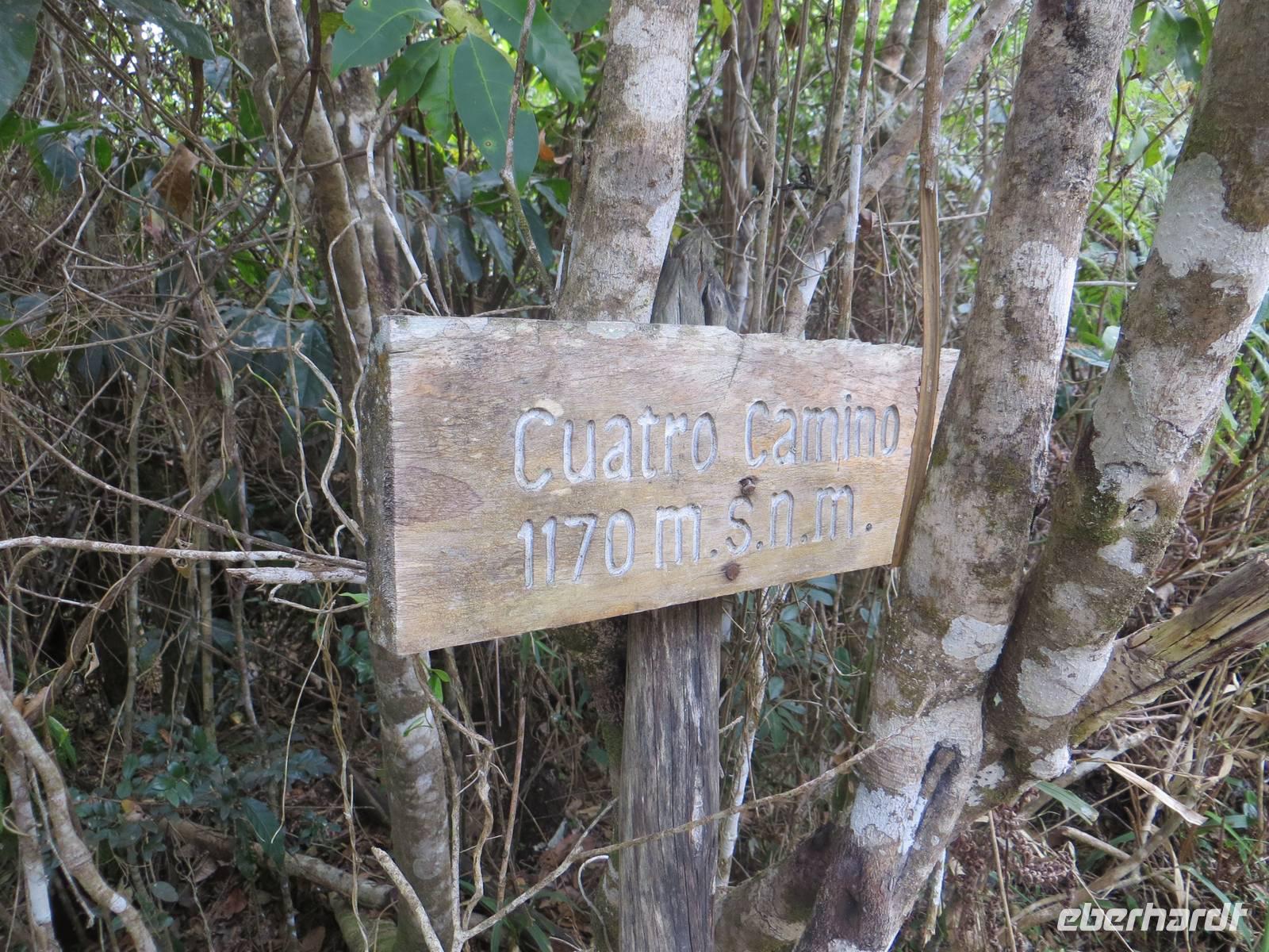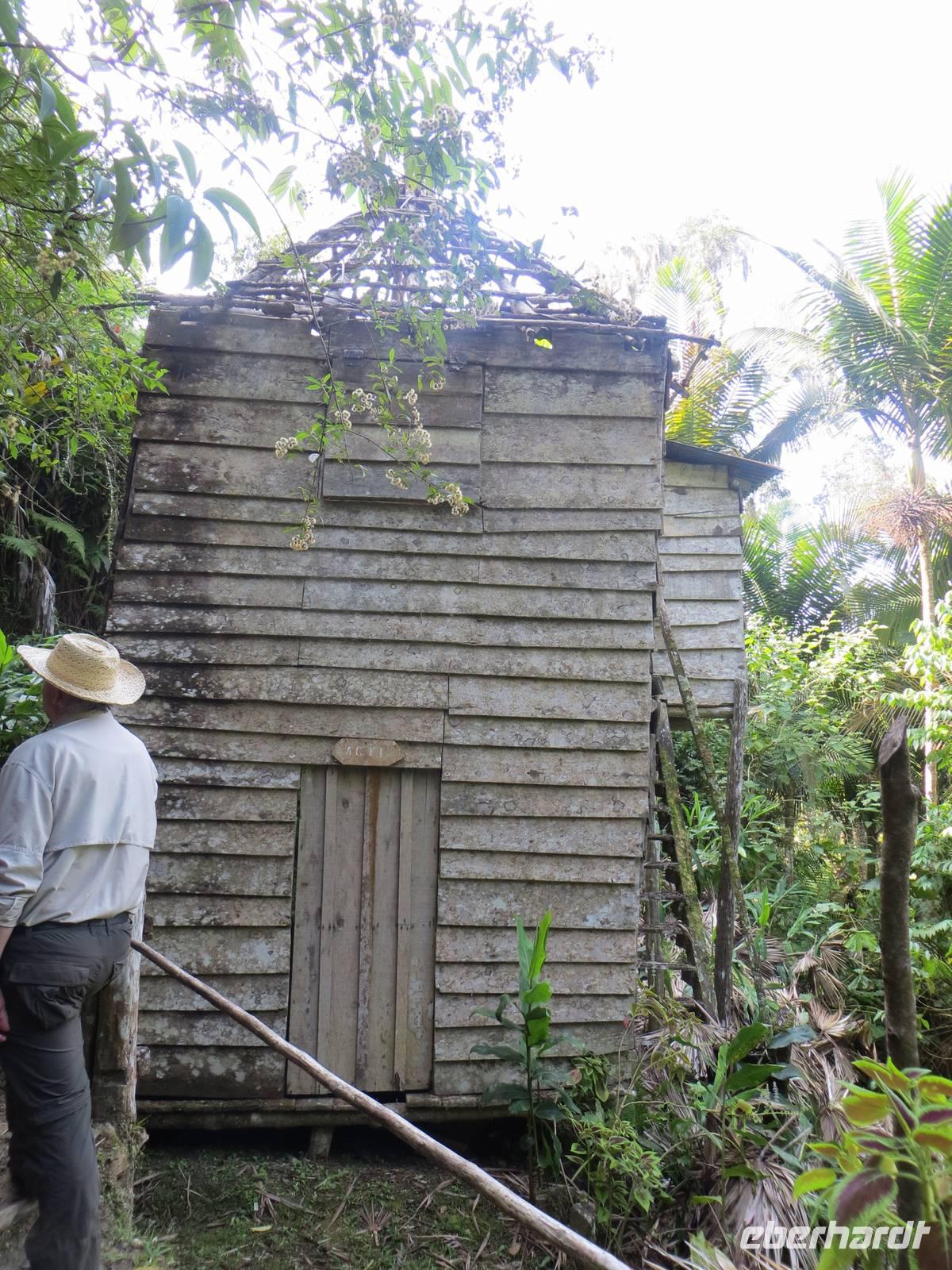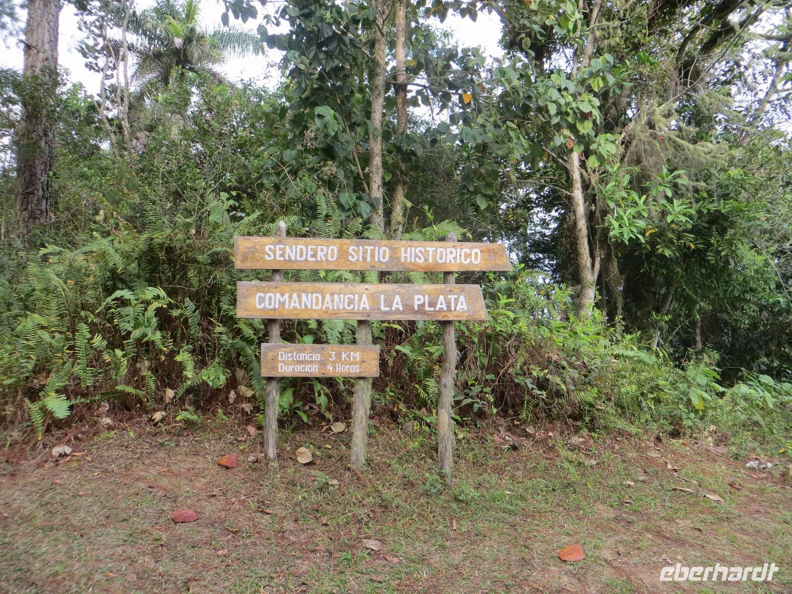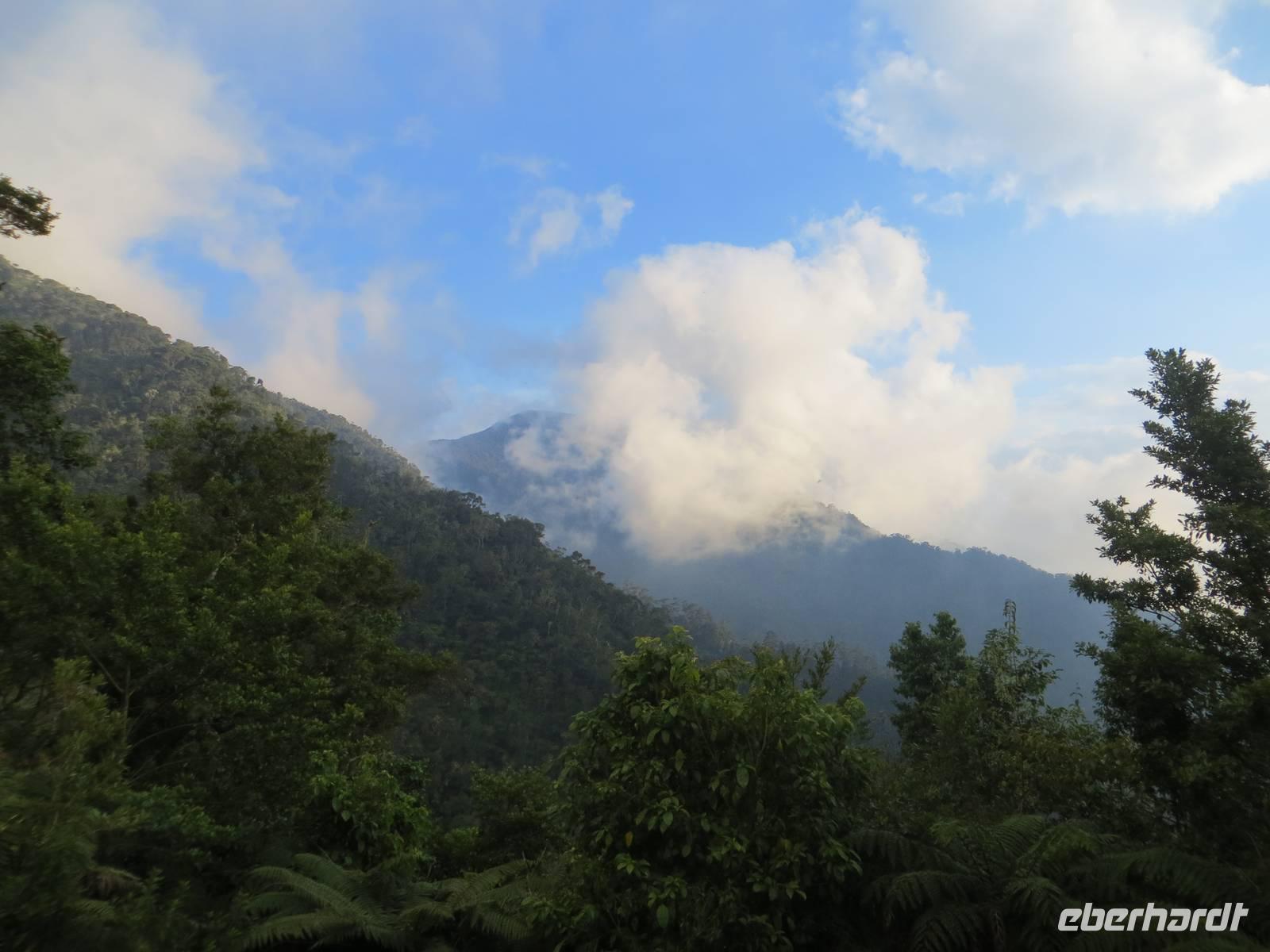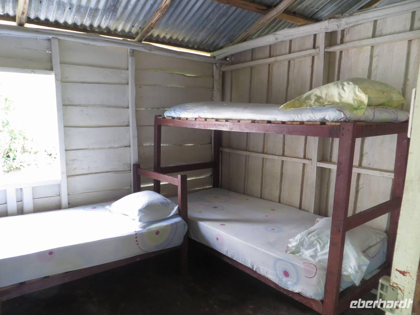 Der erste Teil des Weges ist angenehm zu gehen. Nur ein paar Meter hinter der Passhöhe Alto de Naranjo wird er anspruchsvoller, die Anstiege wesentlich steiler und der Wald undurchdringlich. Die Wege sind steil und nicht breiter als ein Esel. Wir schlängeln uns durch ein Labyrinth aus Palmen, Riesenbambus, Farnen und Wurzeln und klettern über umgestürzte Bäume. Es ist heiß, denn durch den dichten Dschungel weht kaum ein Wind. Man hat das Gefühl, er saugt die Geräusche auf wie ein Schwamm. Nur das Waten der Füße im Morast und Zwitschern der Vögel sind zu hören. Am Abend zuvor haben wir unseren Trinkproviant aufgestockt. Das ist bei 30 °C und 80 % Luftfeuchtigkeit sehr wichtig - auch wenn wir eine Menge zu tragen hatten, war es gut nicht am Wasser gespart zu haben! Es sind nur acht Kilometer über 400 Höhenmetern, doch irgendwie auch die längsten acht Kilometer, die wir bisher kennen. Wir haben das Gefühl, die Höhenmeter vielmals erneut hoch und runter zu wandern. Unser lokaler Wanderführer und Alien, die zur Hochsaison bis zu 6 Mal die Woche den Berg hinaufsteigen, scheinen den Berg mühelos hochzugleiten, während wir total aus der Puste sind und ganz schön ins Schwitzen kommen. Doch die wundervoll unberührter Natur und die herrlichen Ausblicke, die wir in den vielen kurzen Verschnaufpausen genießen, sind jede Mühe wert! Stufe für Stufe mühen wir uns den Berg hinauf bis zur Waldstation Aguada de Joaquin auf knapp 1.400 Metern. Wir sehen zwei Hütten: eine mit mehreren Doppelstockbetten, wo wir unsere Nacht verbringen werden und eine andere, mit Küche, Wohn- und Esszimmer der Ranger. Die Hütten und sanitären Einrichtungen sind sehr, sehr einfach. Per Funkgerät hat man Verbindung ins Tal. Es gibt sogar Solarpanels - diese sind für den Betrieb des obligatorischen Fernsehers wichtig.